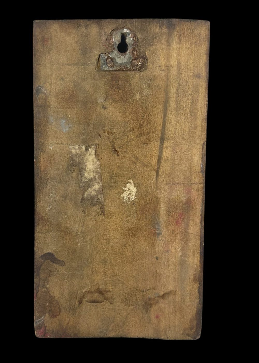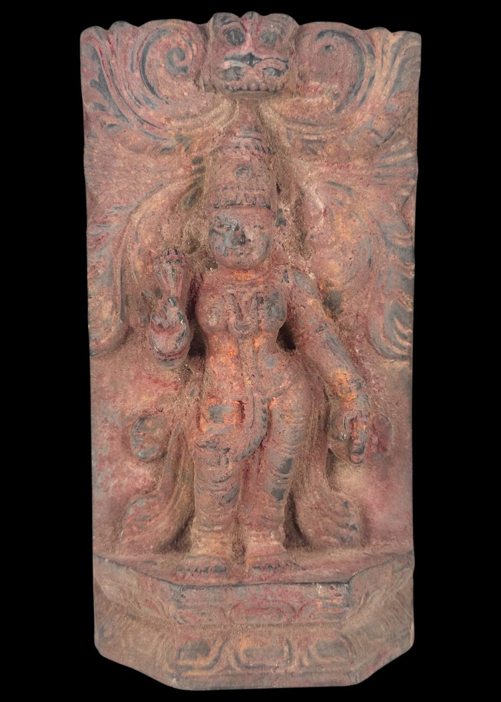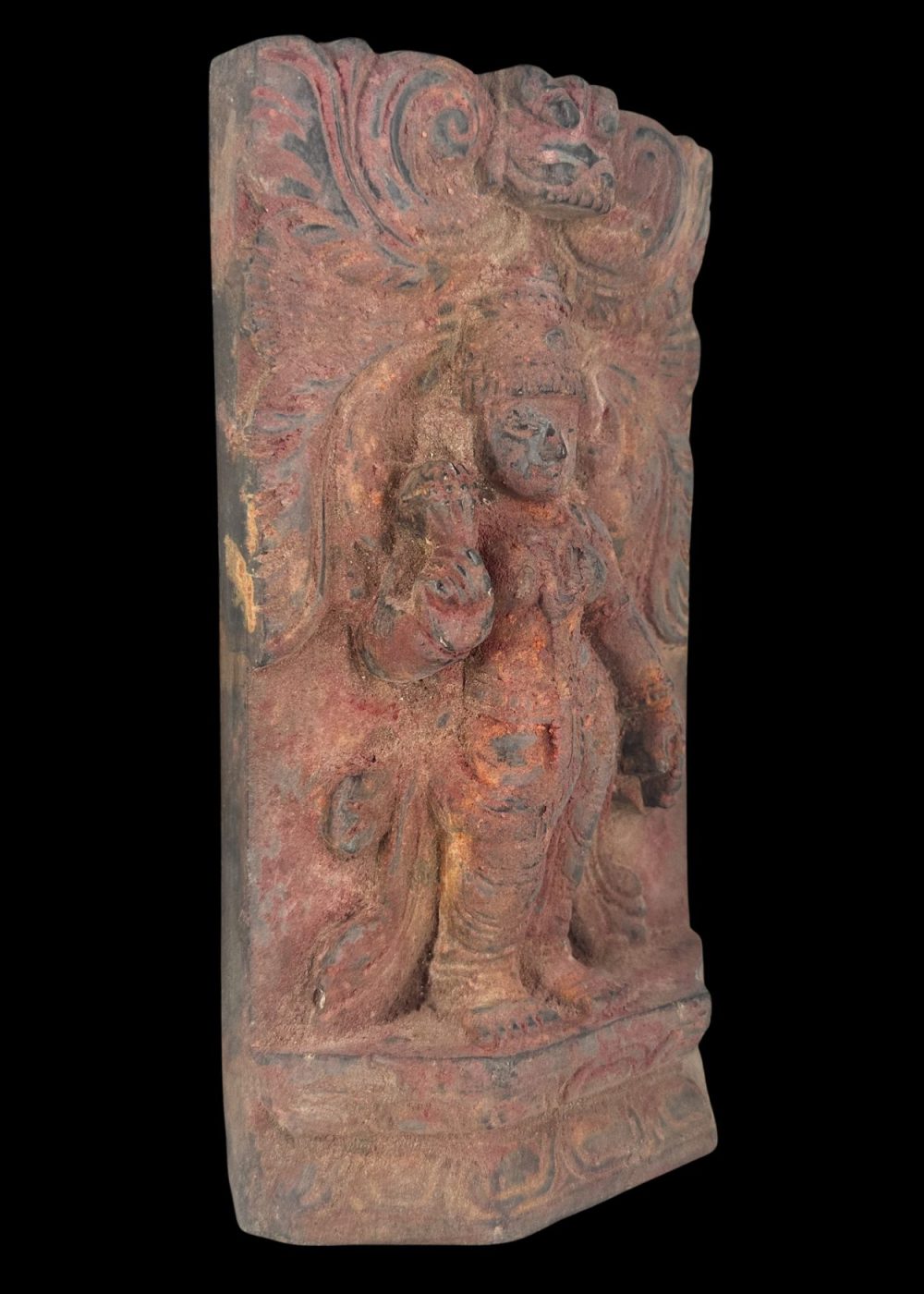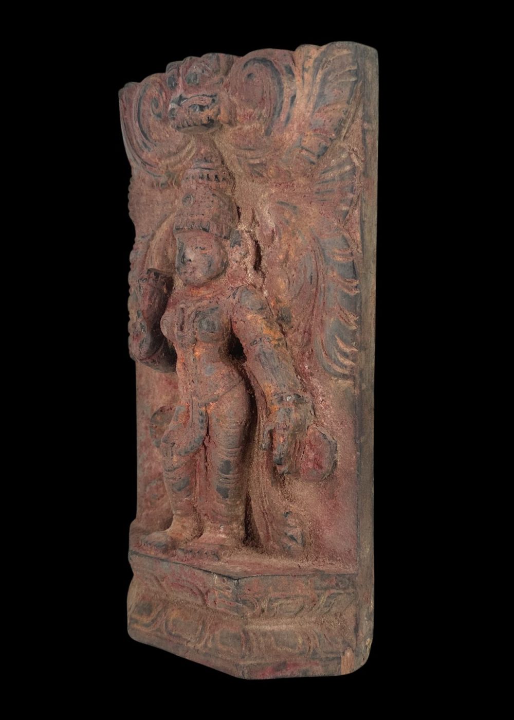 This intricately carved wooden panel from South India features a regal figure, likely divine or symbolic, standing on a pedestal beneath a crown-like arch. Surrounded by swirling foliate motifs and adorned with delicate jewelry and layered attire, the figure embodies the stylistic elegance and religious symbolism prevalent in traditional woodwork of the region. The composition reflects the meticulous craftsmanship and ornamental sensibility characteristic of South Indian architectural embellishments during the 20th century.
