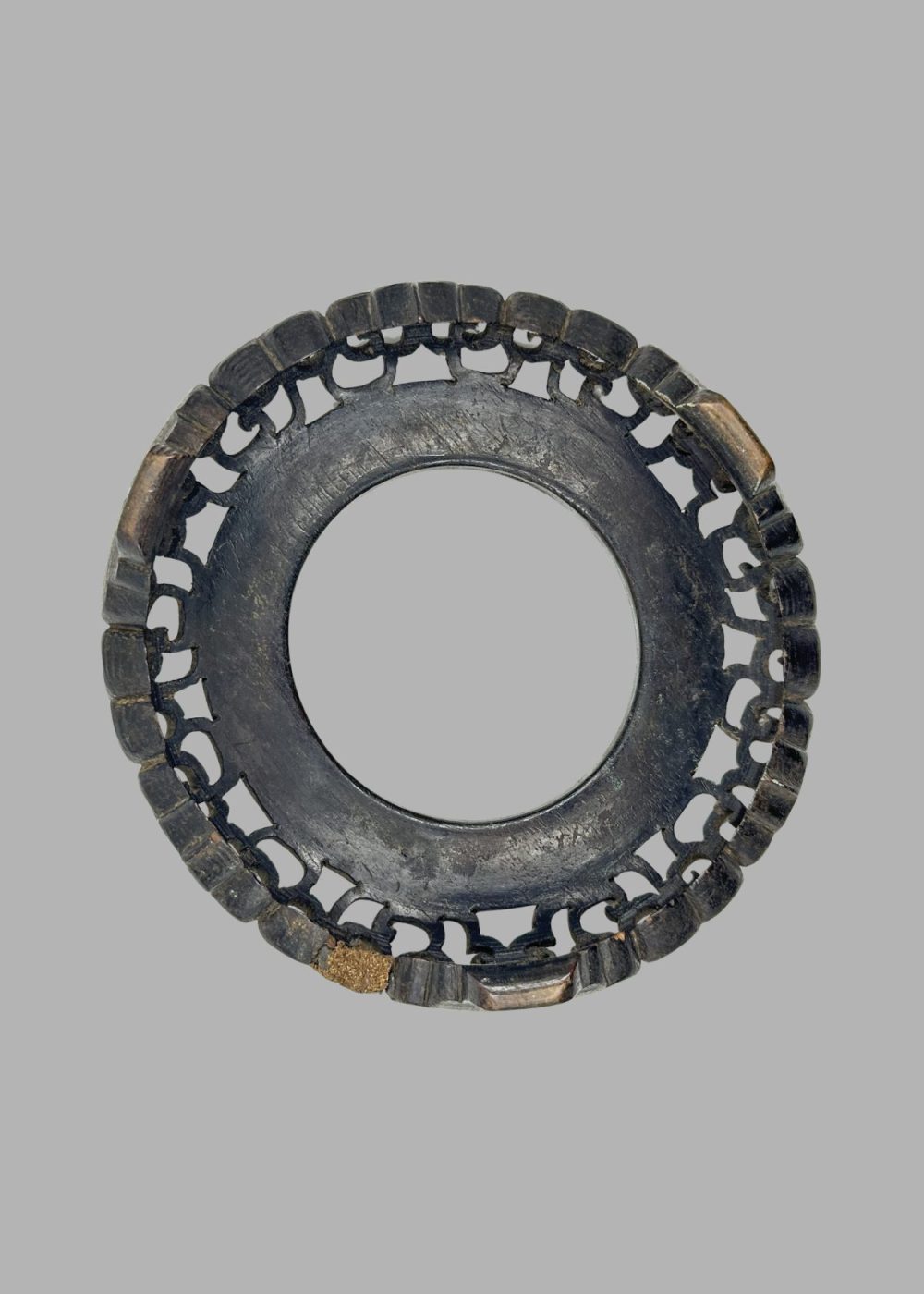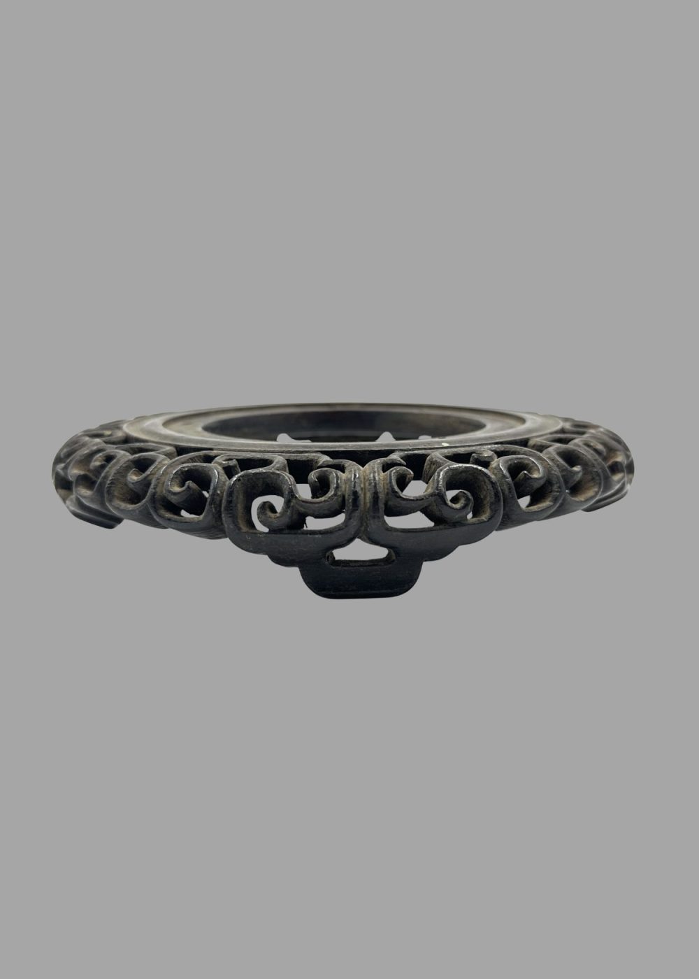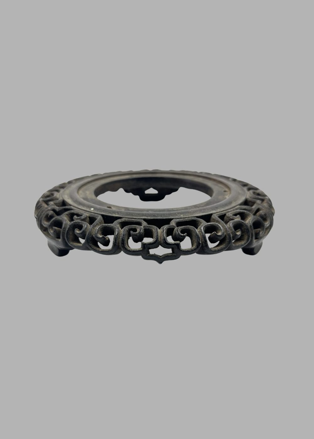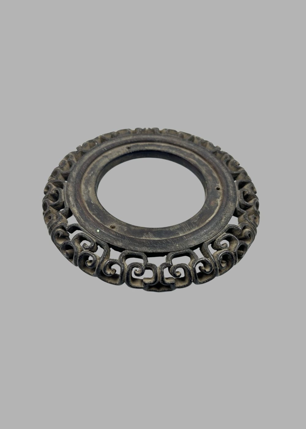 This circular wooden panel, crafted in 20th-century China, features a hollow center encircled by interlocking swirling motifs. Executed with precision and rhythmic balance, the design reflects classical Chinese aesthetics rooted in symbolic and decorative traditions. The harmonious patterning and intricate relief work highlight the artisan’s mastery of form and symmetry, serving both ornamental and cultural purposes in domestic or temple architecture.