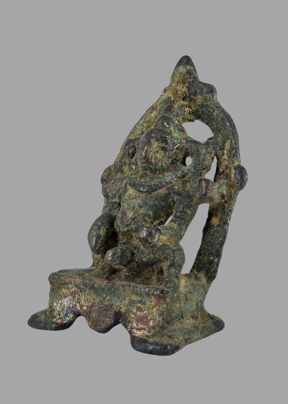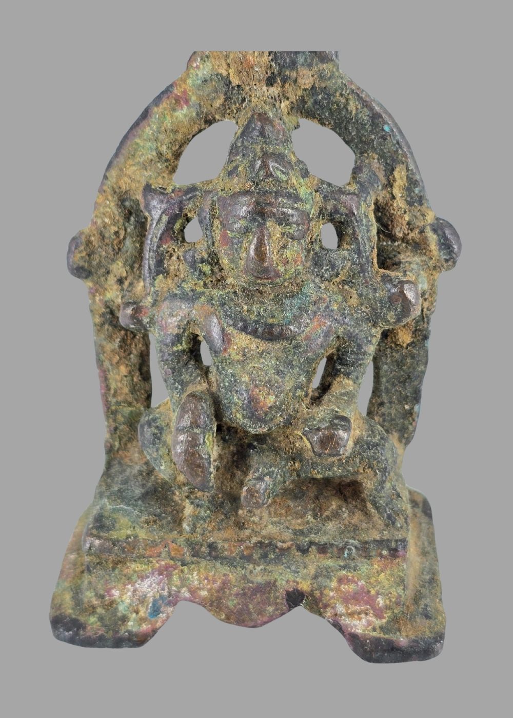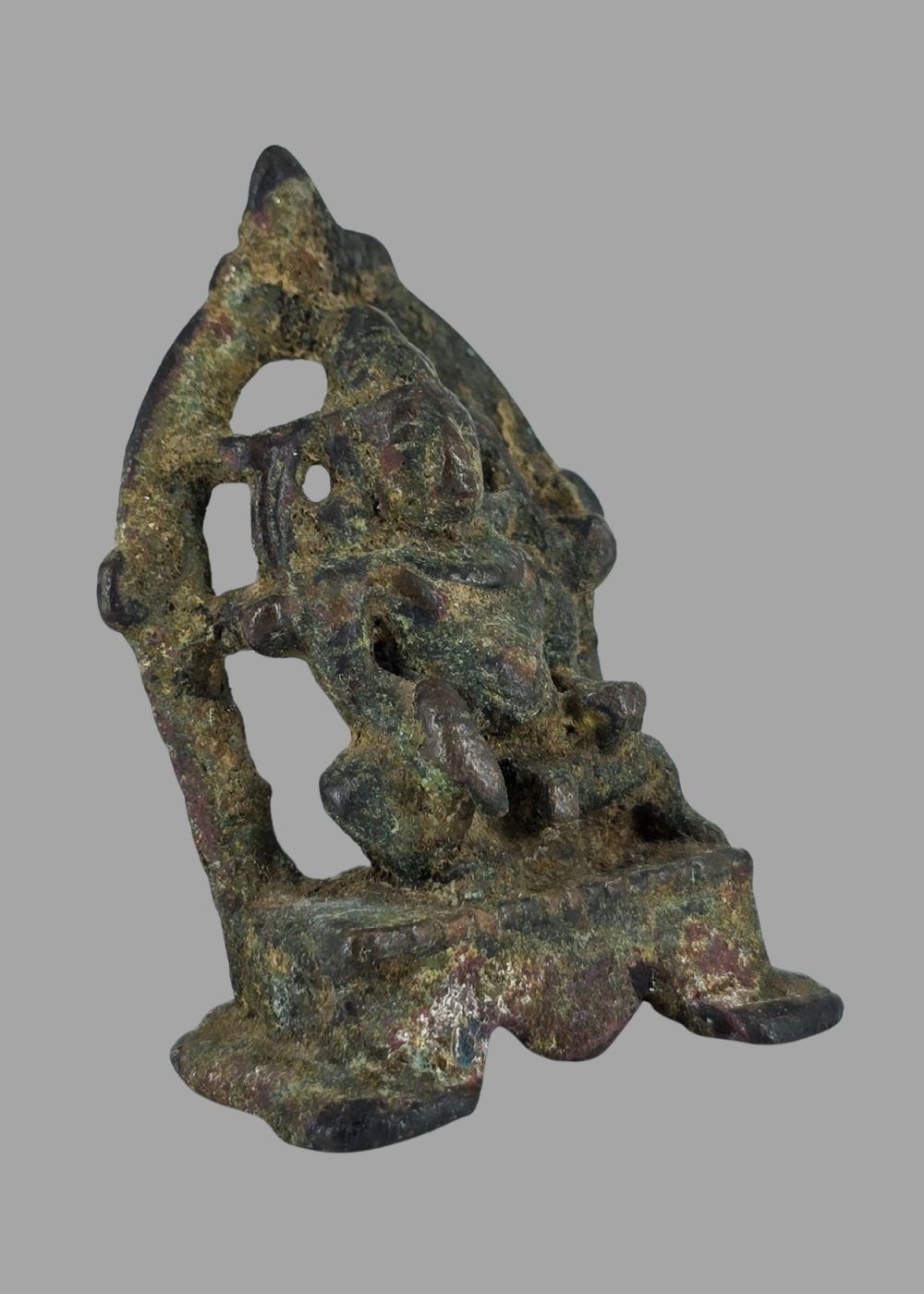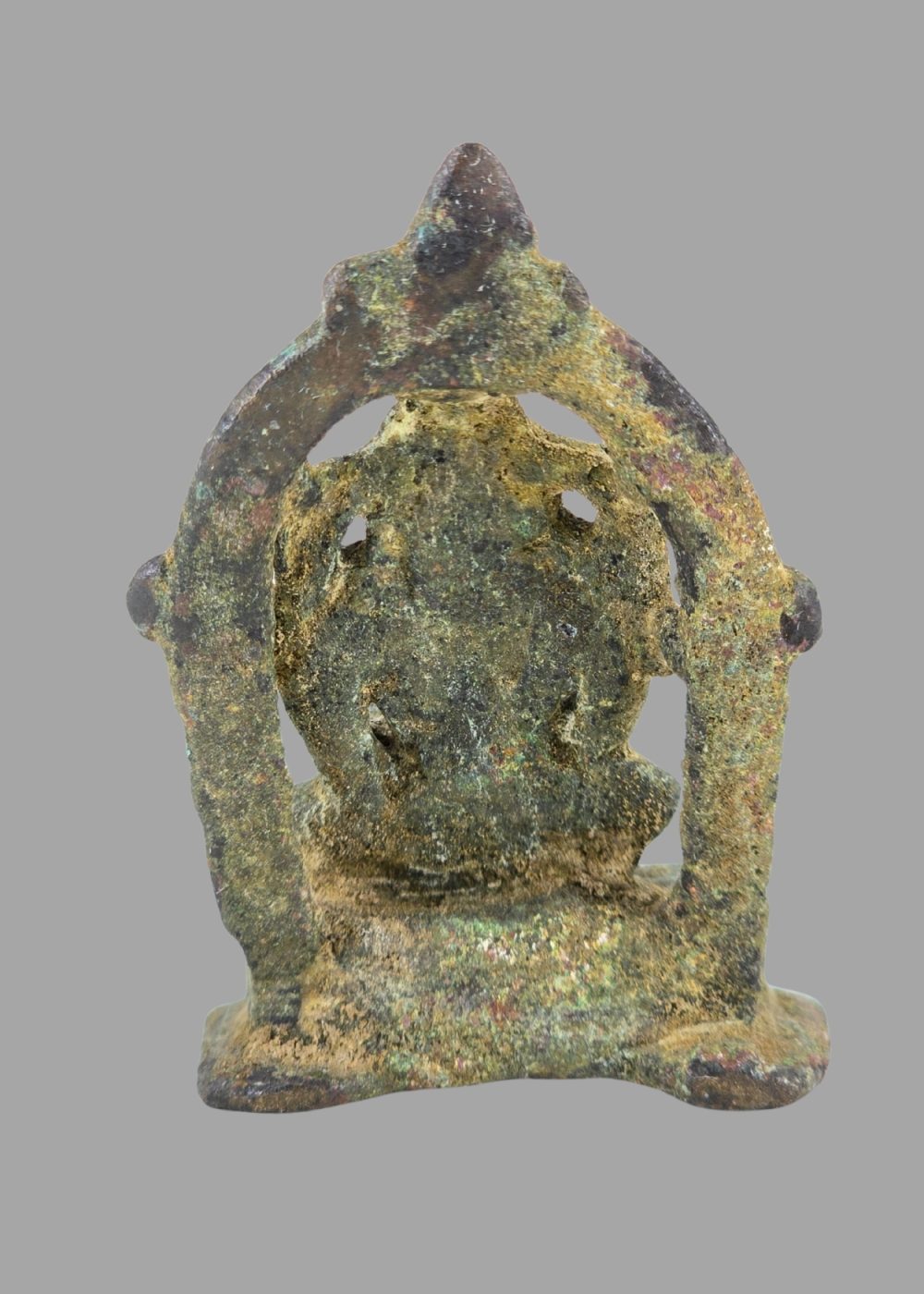 This is an ancient bronze idol depicting Lord Ganesha, the revered Hindu deity known as the remover of obstacles and patron of wisdom. The idol shows distinct aging and patina, with Ganesha seated beneath an arched pillar structure, making it both a spiritual symbol and a collectible artifact of historical significance.