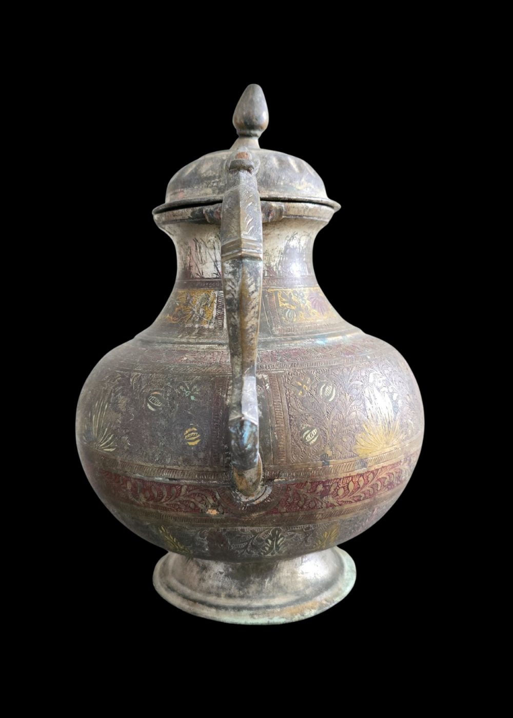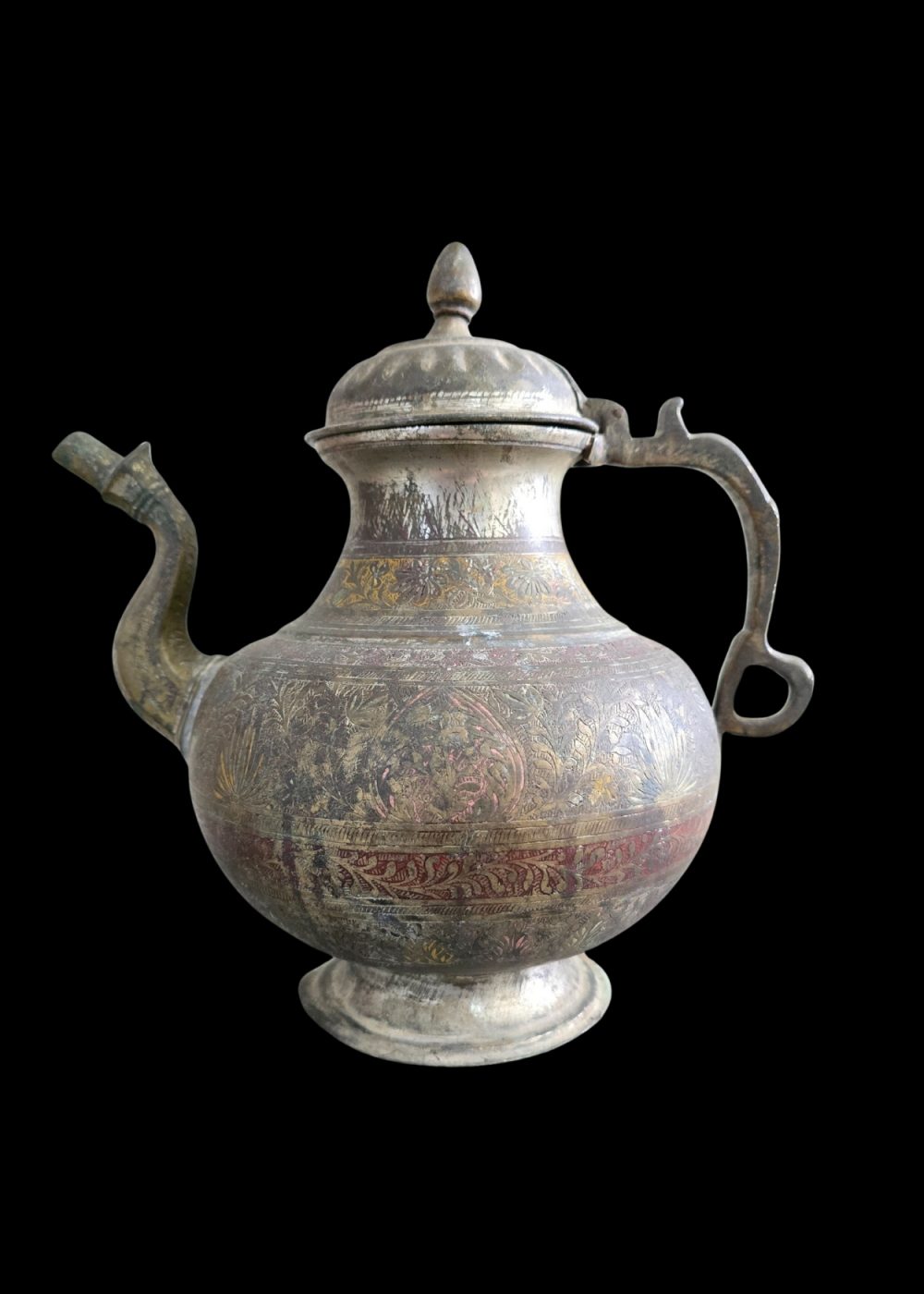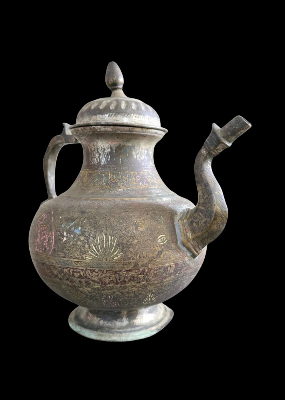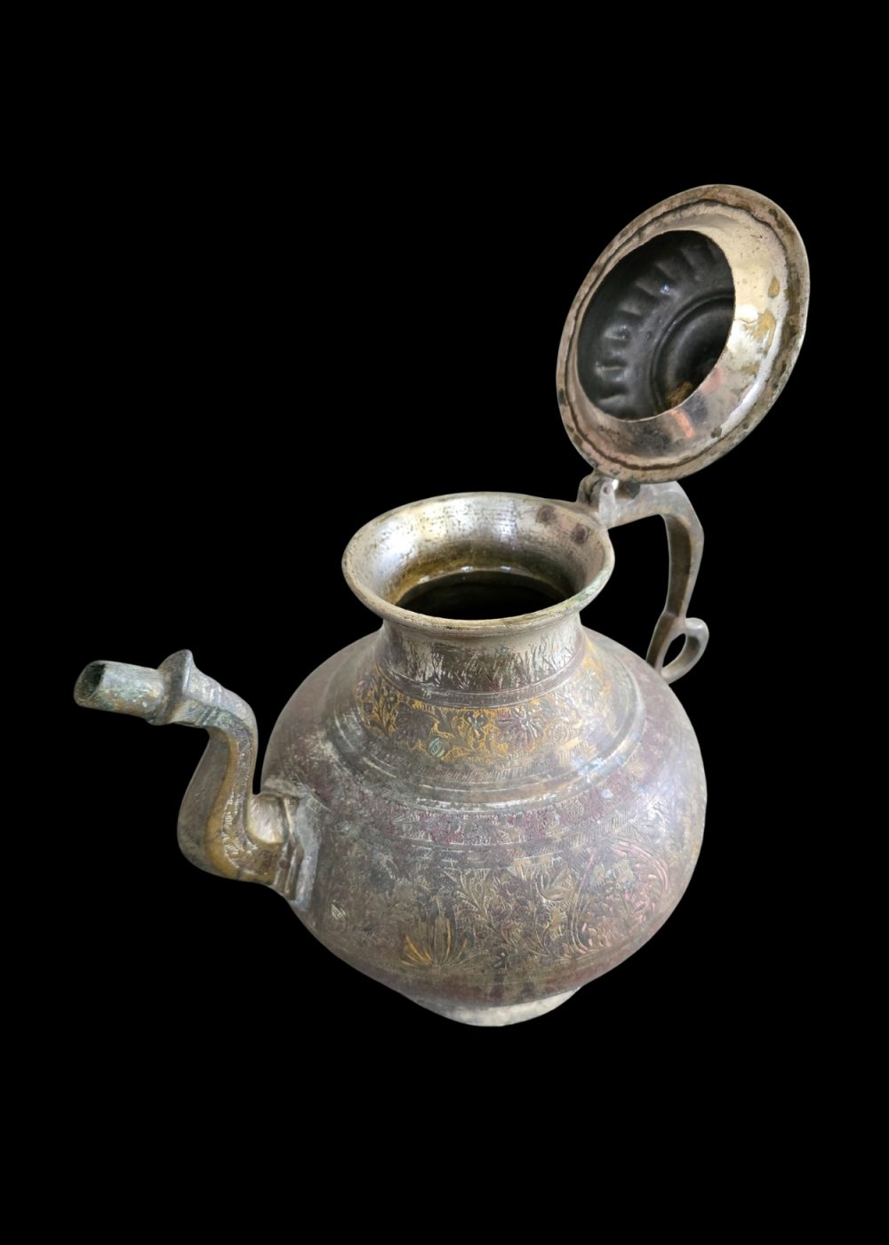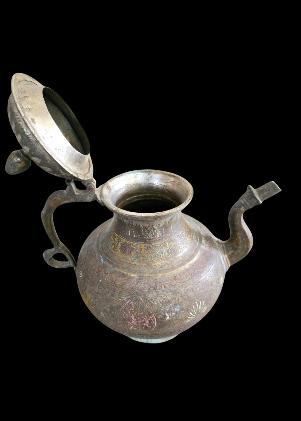 This is a vintage engraved brass teapot featuring a hinged lid, elegantly curved handle, and spout, all adorned with intricate floral and geometric motifs. The rich patterns and patina highlight skilled metalworking, making it a collectible item suitable for decorative or traditional display.