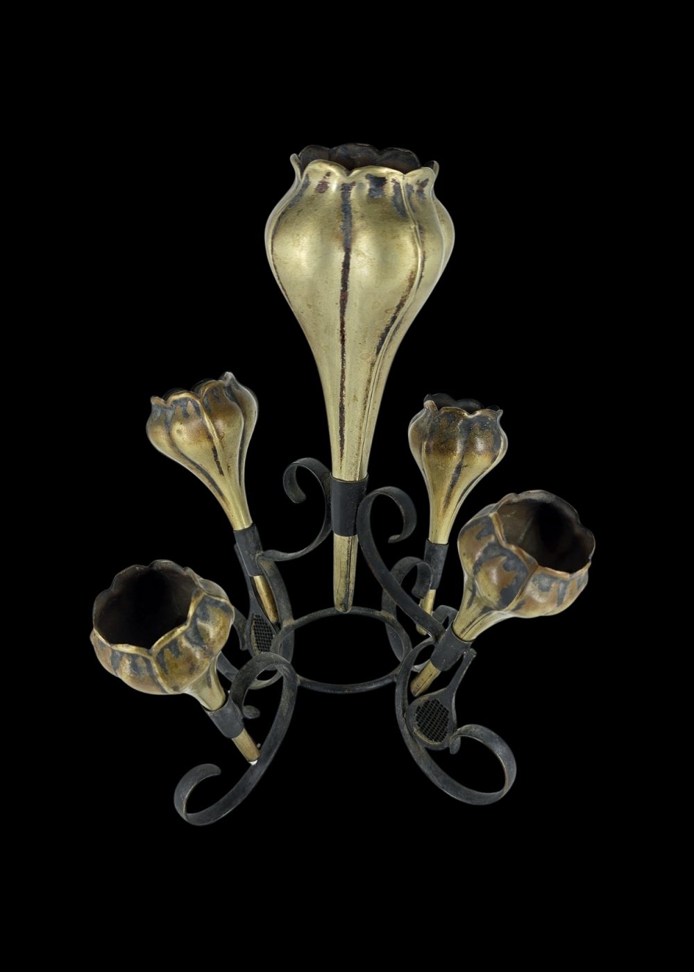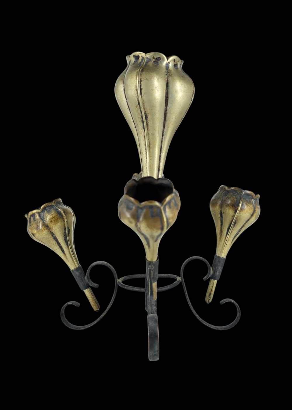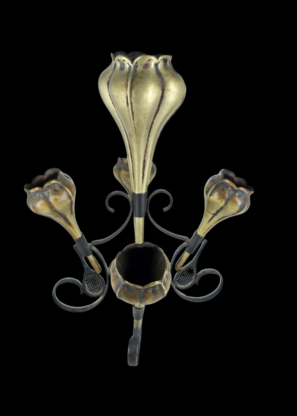 This is a decorative brass flower vase holder designed in the shape of blooming tulip flowers, set atop elegant black metal scrollwork. The multi-flower arrangement serves as a striking centerpiece or accent piece for interior decor, blending vintage charm with functional artistry.