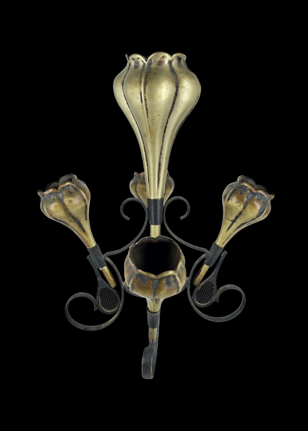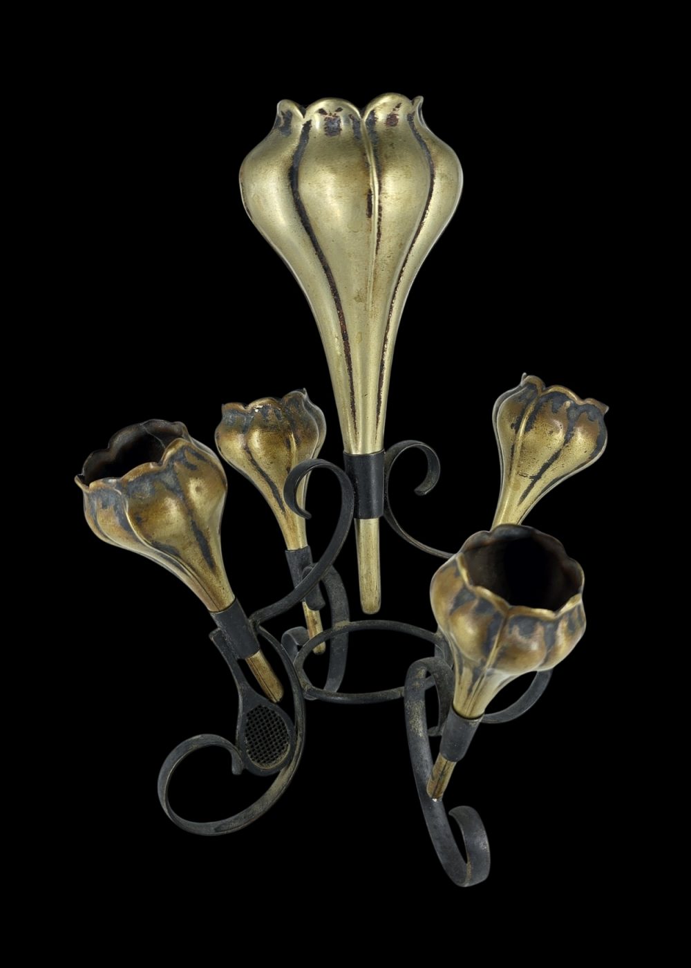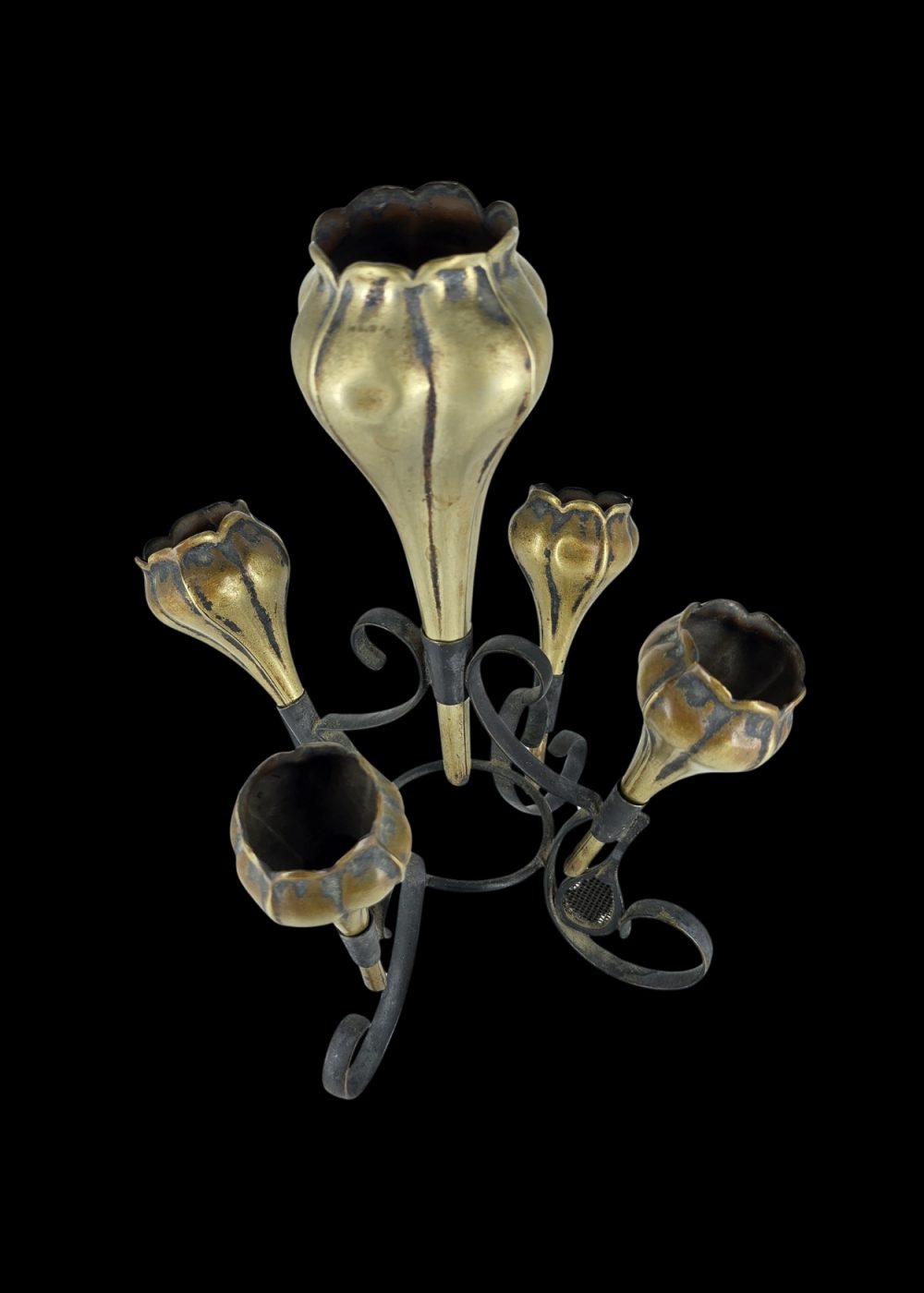 This is a decorative brass flower vase holder designed in the shape of blooming tulip flowers, set atop elegant black metal scrollwork. The multi-flower arrangement serves as a striking centerpiece or accent piece for interior decor, blending vintage charm with functional artistry.