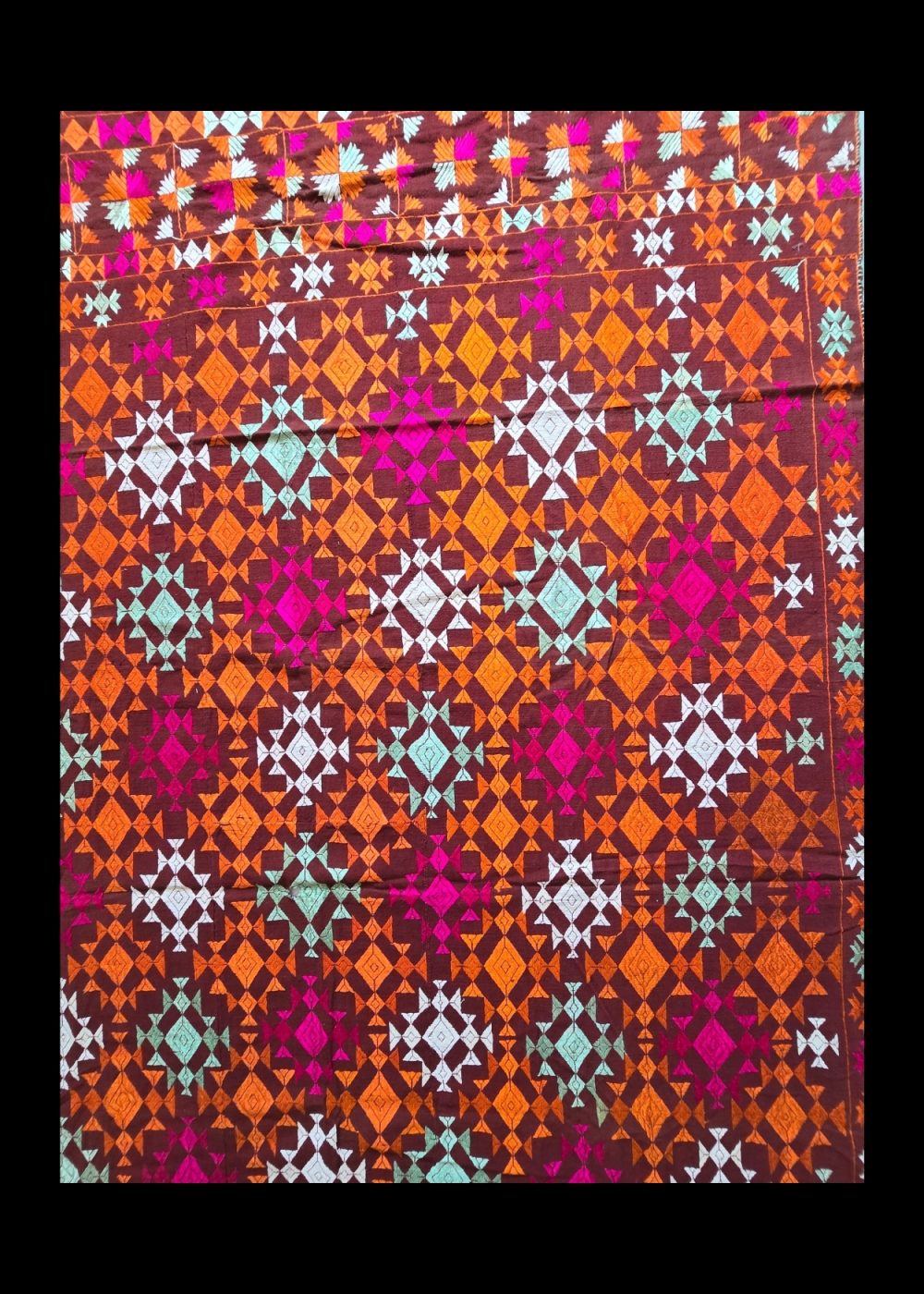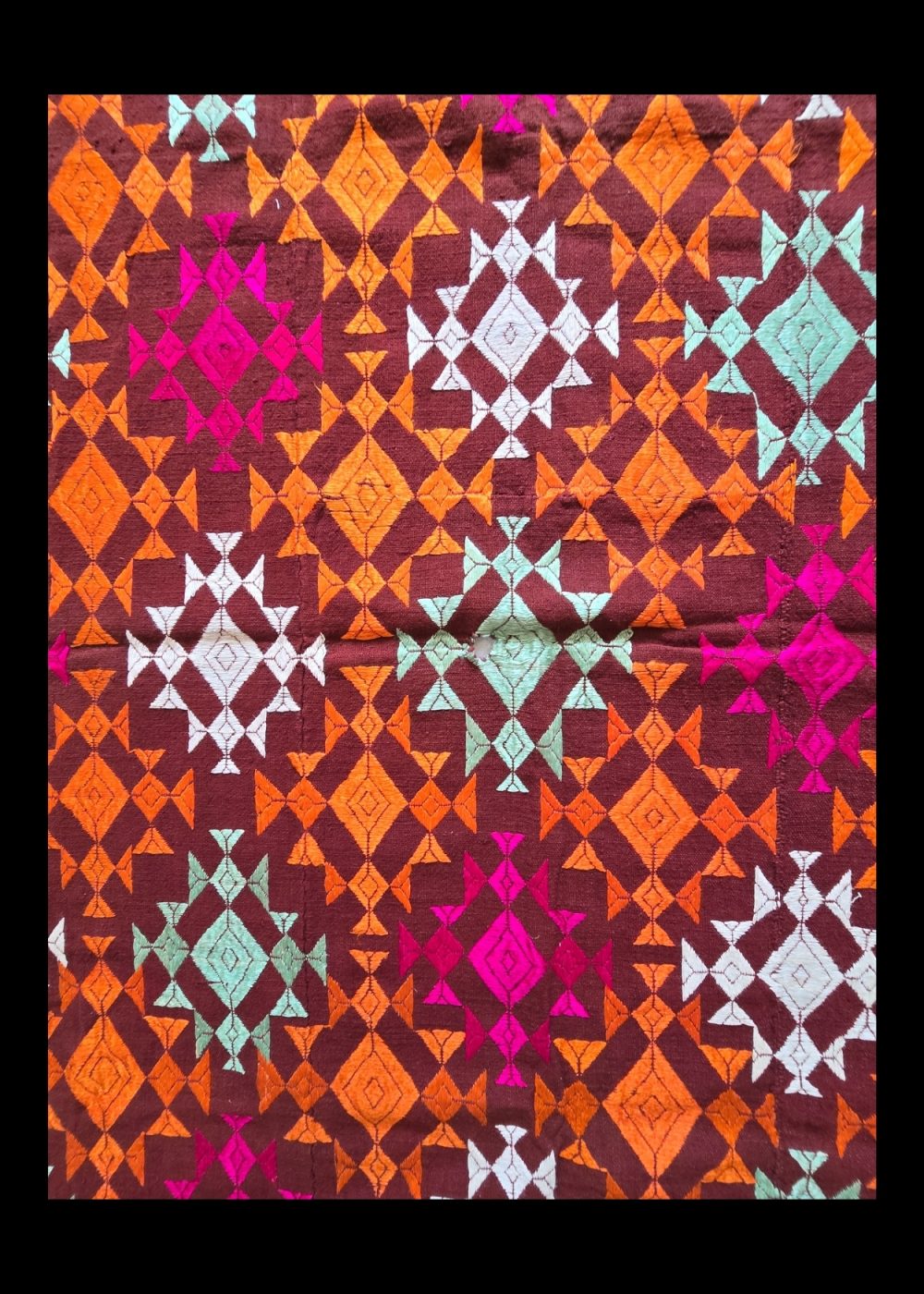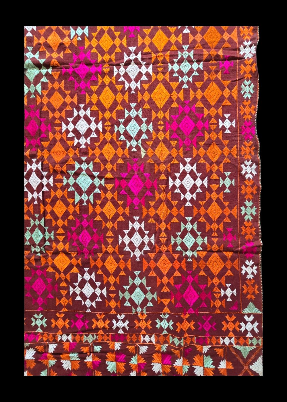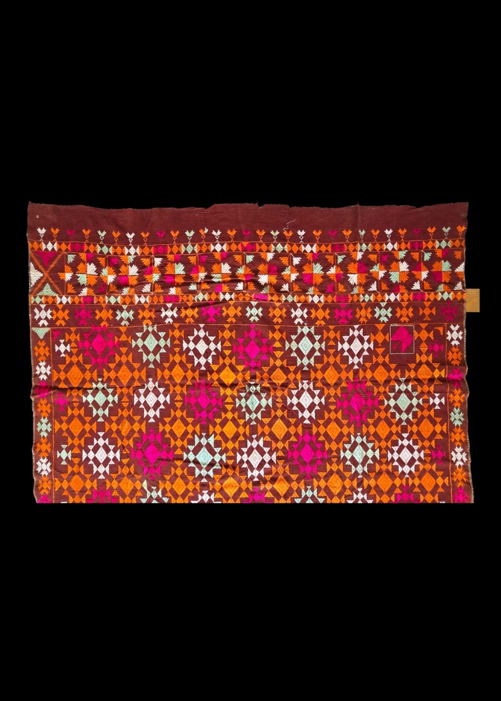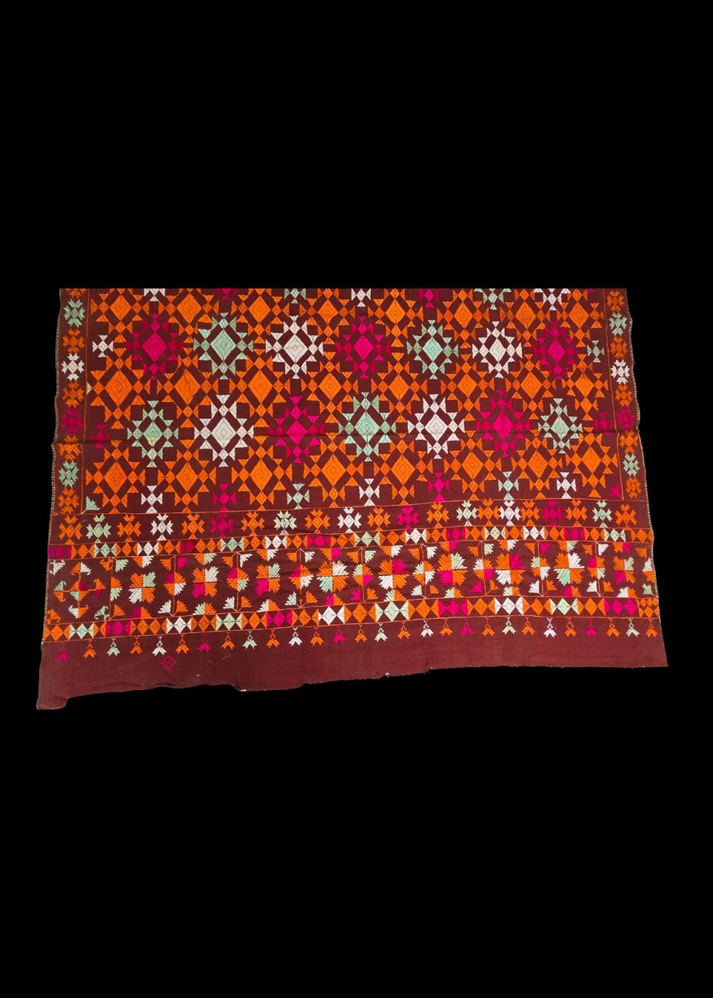 This vibrant piece is a Pachrangi Phulkari, a traditional Punjabi embroidered textile. The design features an intricate geometric pattern, characterized by a bright mix of colors, such as orange, magenta, white, and light turquoise. Phulkari, which means “flower work,” is known for its detailed floral motifs and geometric forms, often using silk thread to create bold, eye-catching designs. The Pachrangi Phulkari specifically showcases a blend of multicolored threads, creating a festive and dynamic aesthetic that is typically worn during special occasions, such as weddings or festivals, in Punjab. The fine craftsmanship and vivid hues are reflective of the region’s rich cultural heritage.