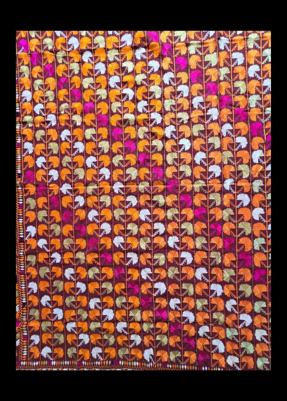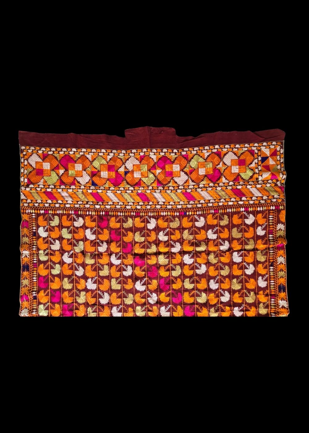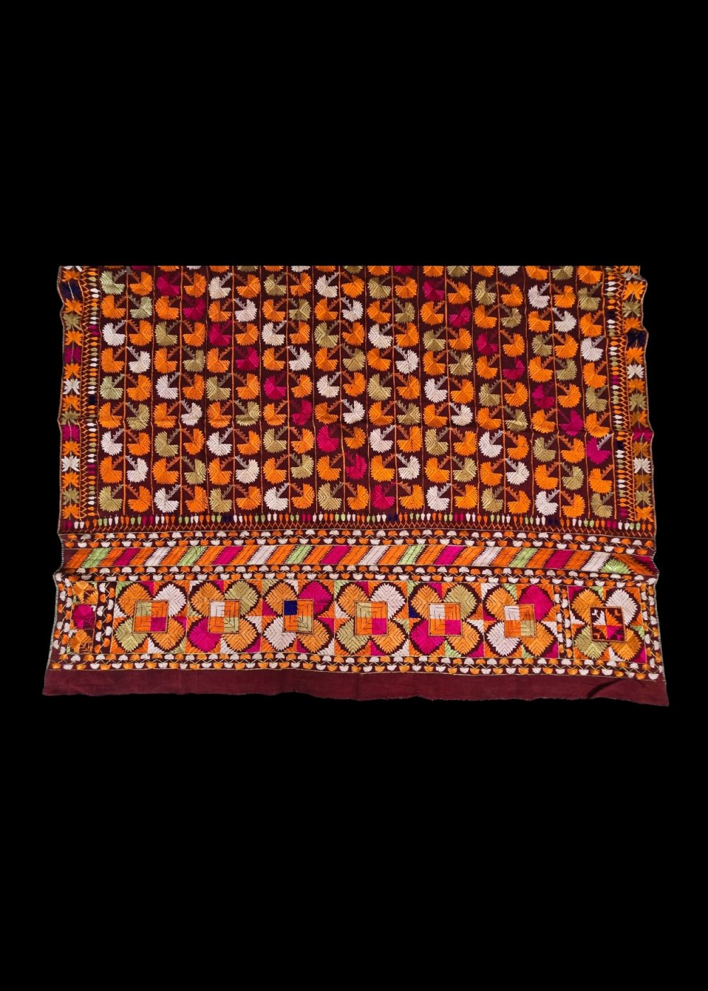 This is a vibrant Pachrangi Phulkari from Punjab, a traditional form of hand-embroidered textile known for its bright colors and intricate patterns. The design features repeating floral motifs in a rich mix of reds, oranges, yellows, and purples, creating a striking visual effect. The embroidery is typically done with silk thread on cotton fabric, and the borders are adorned with geometric patterns, adding to its bold, eye-catching aesthetic. Phulkari is deeply tied to Punjabi culture, often used in garments like shawls or dupattas, symbolizing beauty and craftsmanship.