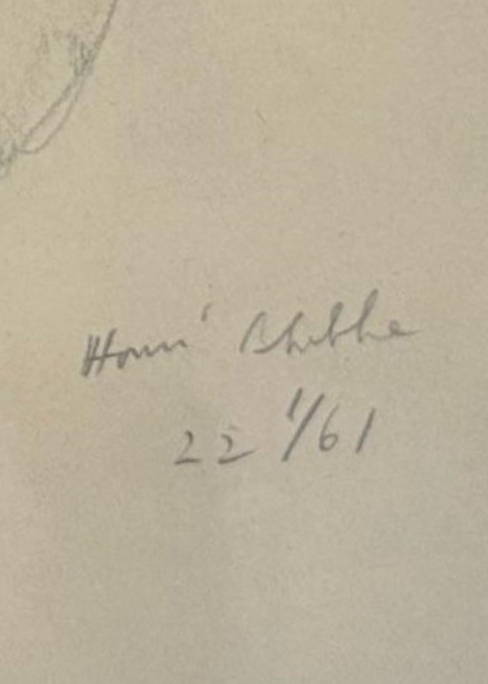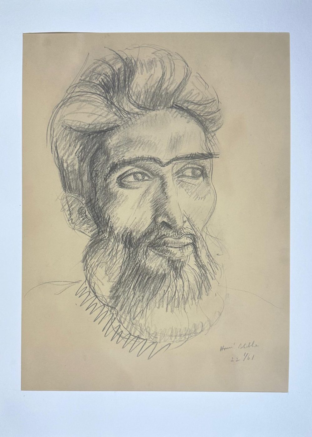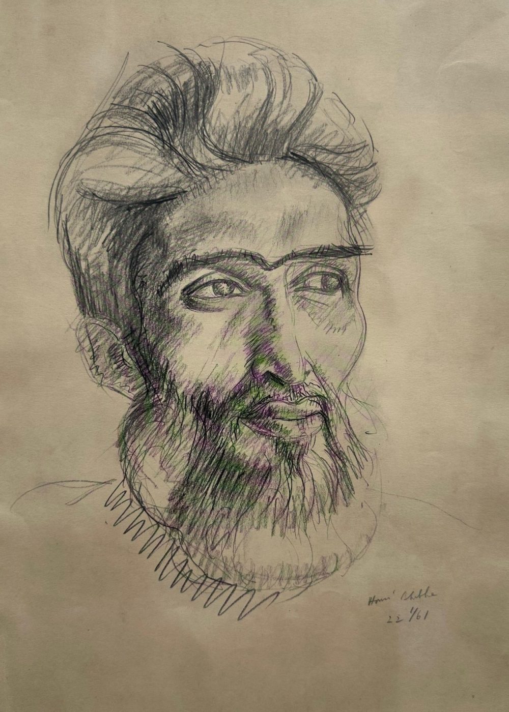 In this later work, Homi Bhabha presents a vibrant and expressive portrait of a bearded man with a contemplative gaze and prominent, wavy hair. Unlike many of his earlier monochrome lithographs, this piece subtly incorporates tones of green and purple pencil, enriching the facial contours and suggesting emotional complexity. The thick, flowing beard and strong facial structure are rendered with dynamic, almost calligraphic strokes, while the intense eyes—outlined boldly—anchor the composition. The stylization and use of color hint at a modernist sensibility, showing Bhabha’s evolving artistic vocabulary. Dated 22 April 1961, this drawing reveals a mature confidence in line, form, and psychological insight, capturing not only a likeness but a moment of inner thought.