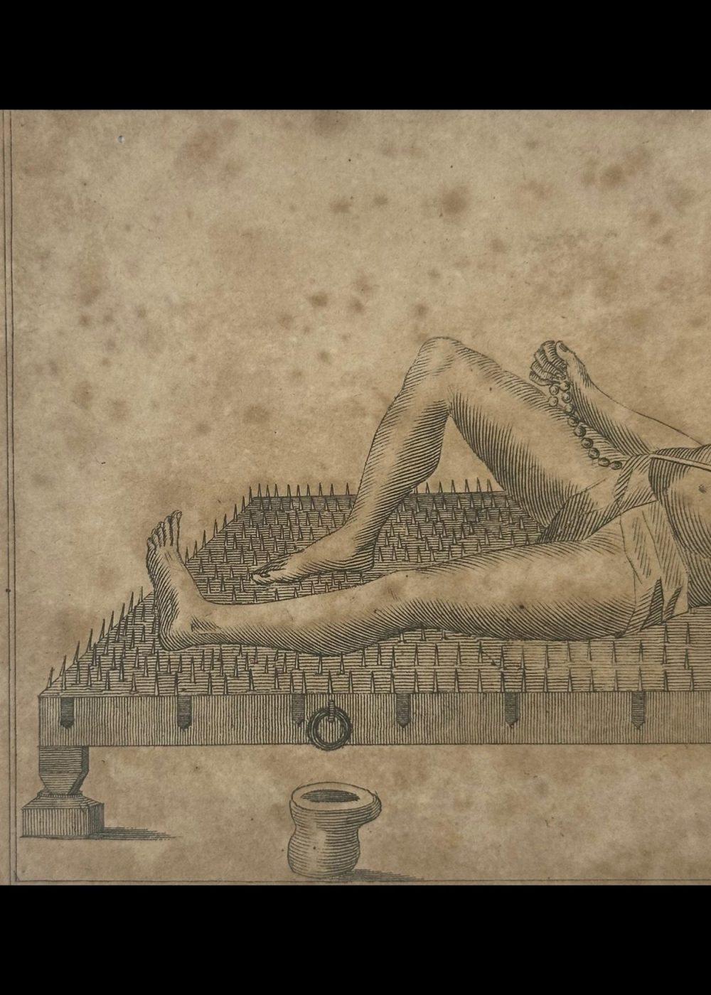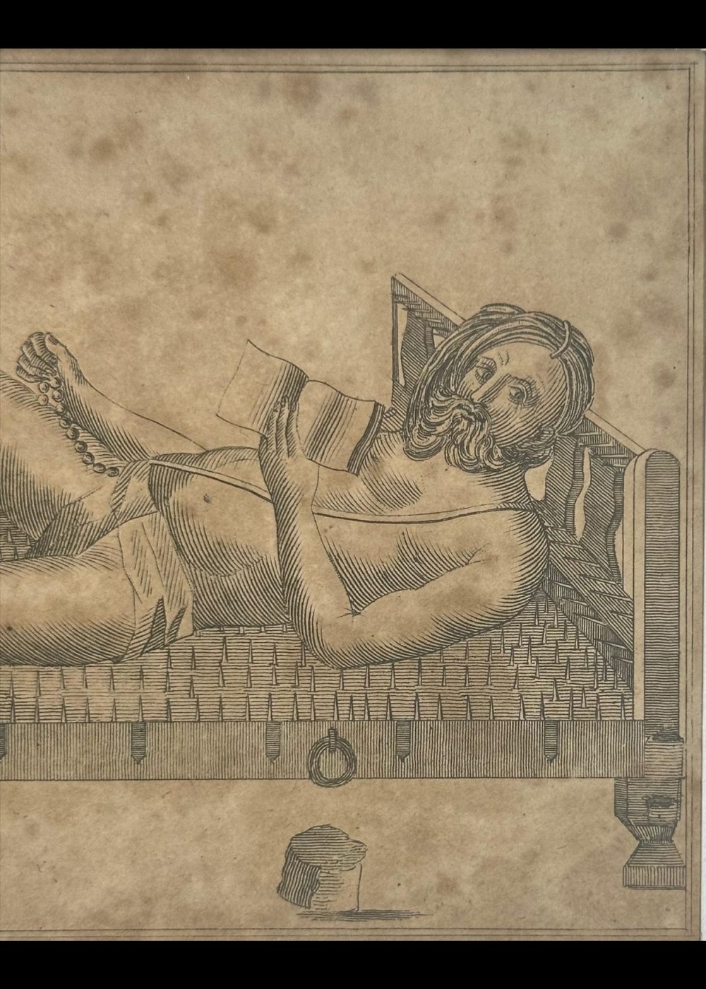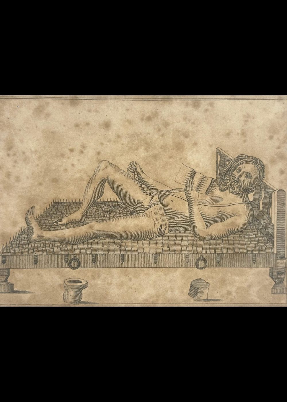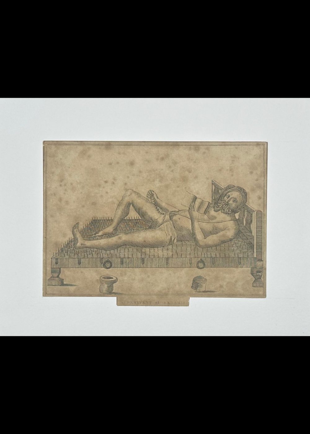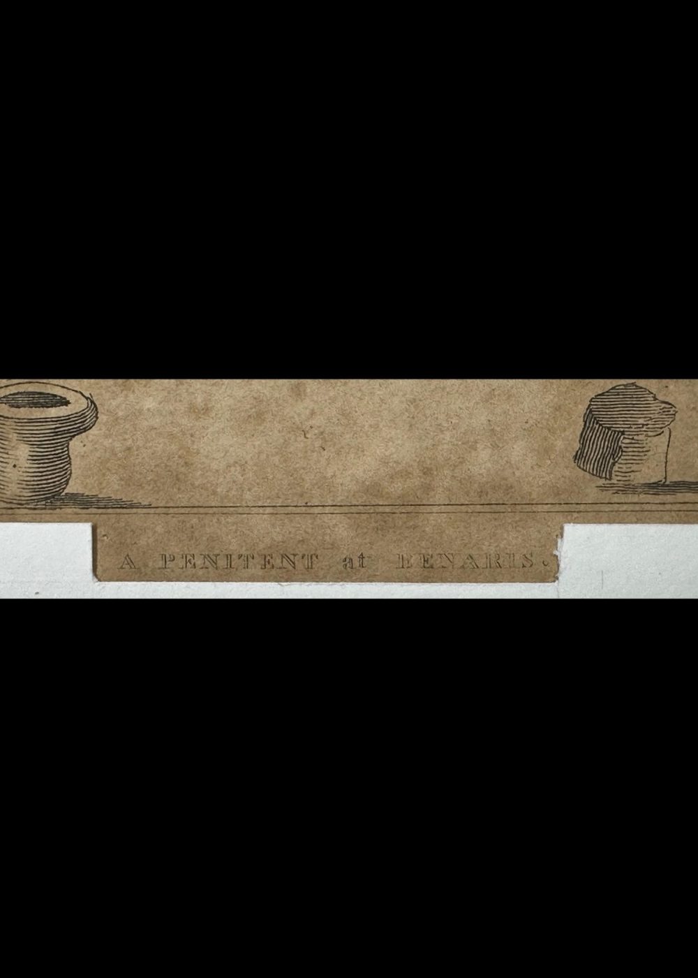 This intriguing antique etching is titled “Penitent at Benares”, and it presents a remarkable visual depiction of extreme religious asceticism practiced in India, particularly in the sacred city of Benares (now Varanasi). At the center of the composition lies a male ascetic or sadhu, reclining calmly on a bed of nails—a traditional symbol of physical endurance, spiritual discipline, and detachment from worldly comfort. His posture is surprisingly relaxed, with one leg stretched out and the other bent at the knee. In one hand, he holds a mala (prayer beads), often used in meditative recitation or chanting of mantras, while the other holds a book, likely a sacred text, further underscoring his devotional focus. The man is minimally clothed, wearing a simple loincloth, and his long, uncut hair and beard suggest a life of renunciation and spiritual pursuit. His serene expression and composed body language convey a deep sense of inner calm and control, despite the bed of sharp nails beneath him. The setting is minimal, with a few traditional items—possibly a water pot and containers—placed near the bed. These small details, combined with the deliberate, linear etching style, ground the image in authenticity while also highlighting the otherworldly nature of the ascetic’s practice. This image reflects colonial-era European fascination with the perceived mysticism and exoticism of Indian religious life. Produced likely in the late 18th or early 19th century, it is both an ethnographic record and a stylized interpretation, offering insight into how sadhus and their austere practices were viewed and documented by outsiders.