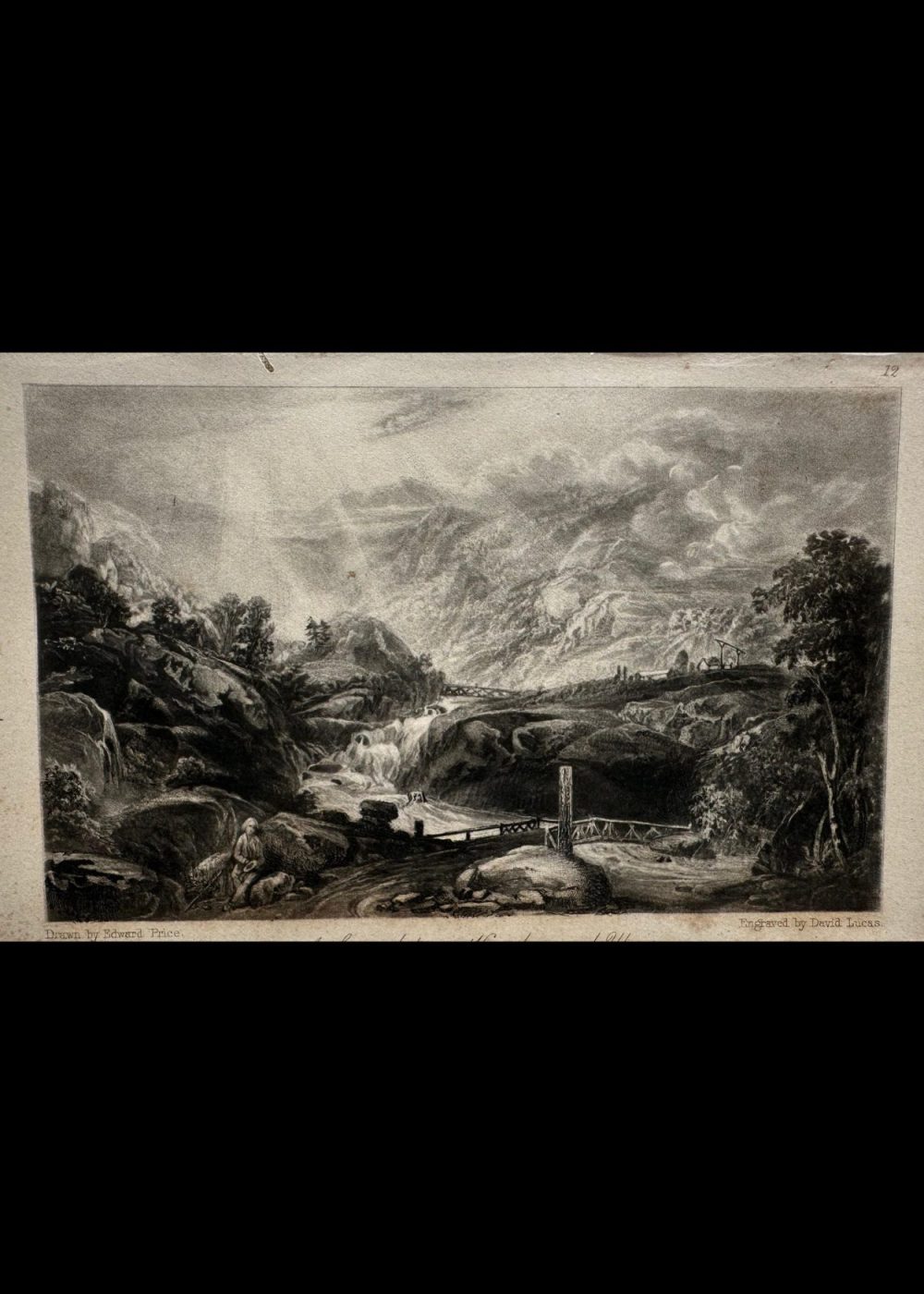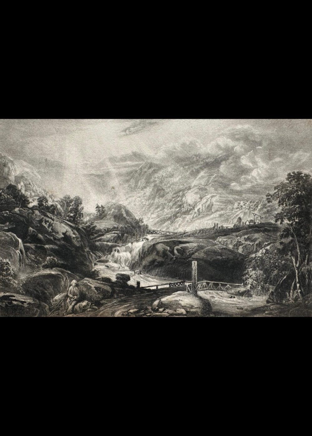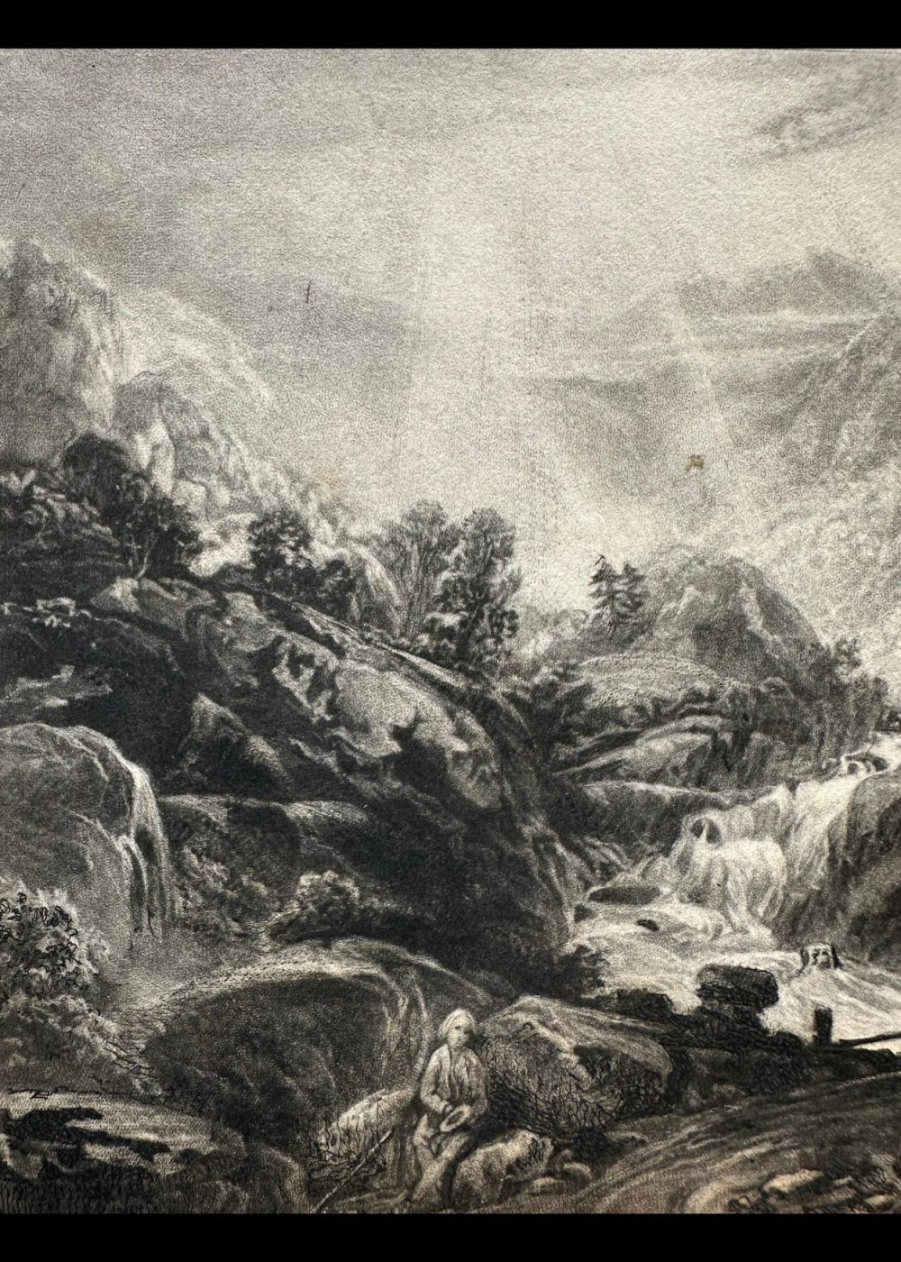 This finely rendered black-and-white engraving depicts a dramatic mountain landscape with a waterfall cascading down rocky cliffs. A stone bridge spans the river in the foreground, where a lone figure sits contemplatively on a rock. Towering peaks and a cloud-filled sky frame the scene, emphasizing the grandeur and solitude of nature. The composition blends human presence with untamed terrain, reflecting the Romantic era’s reverence for sublime landscapes.