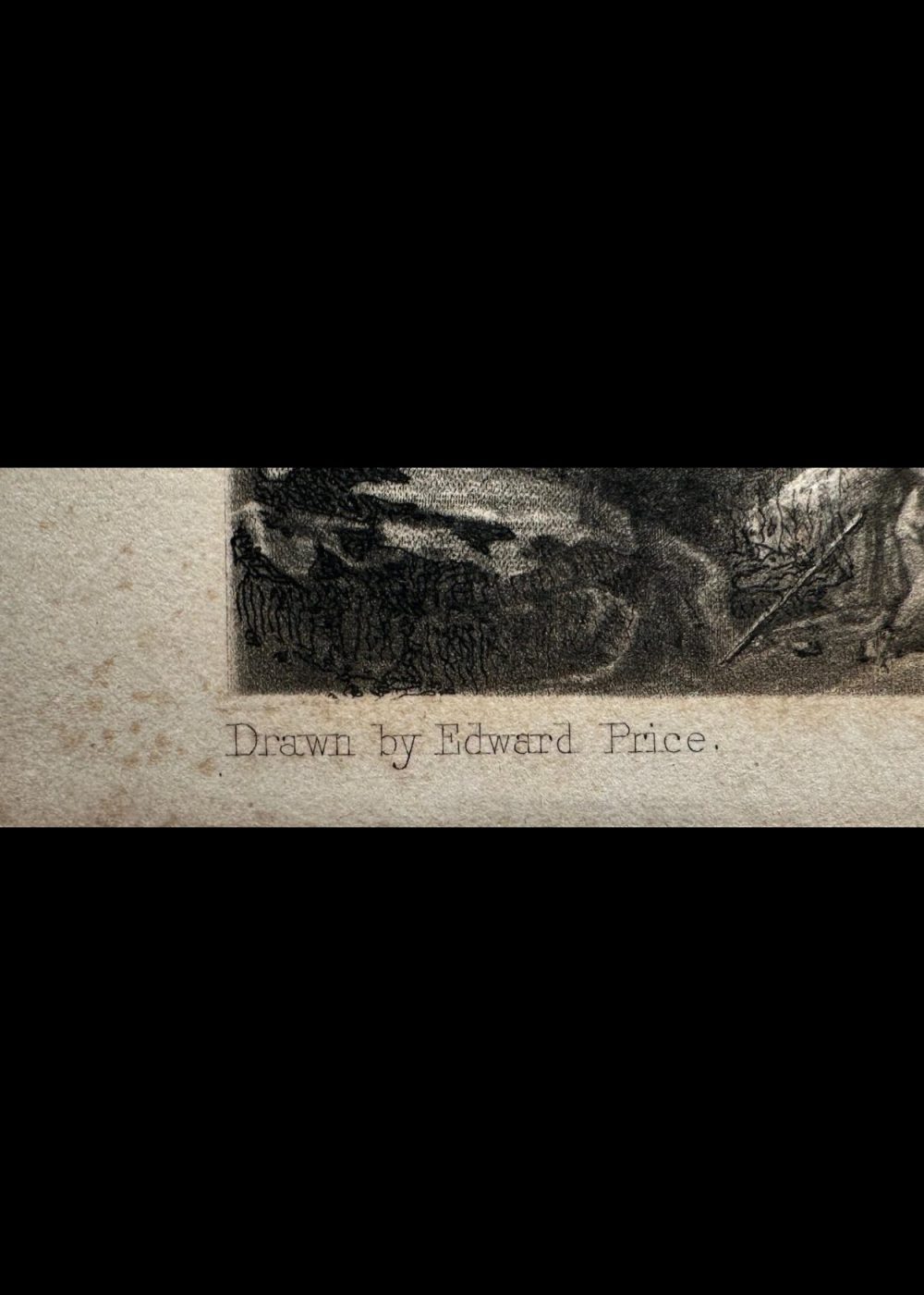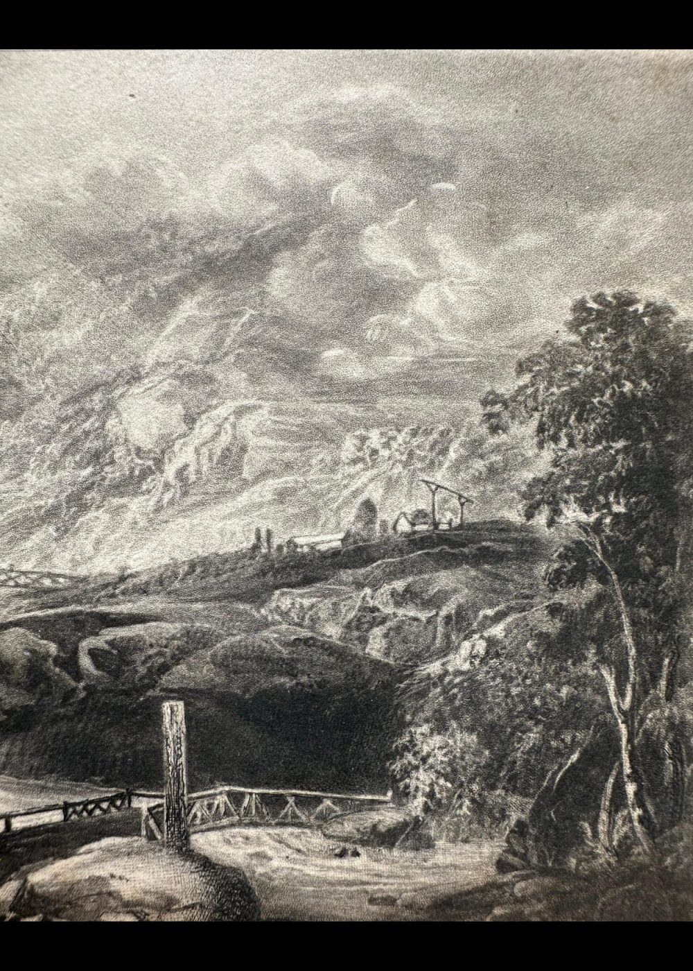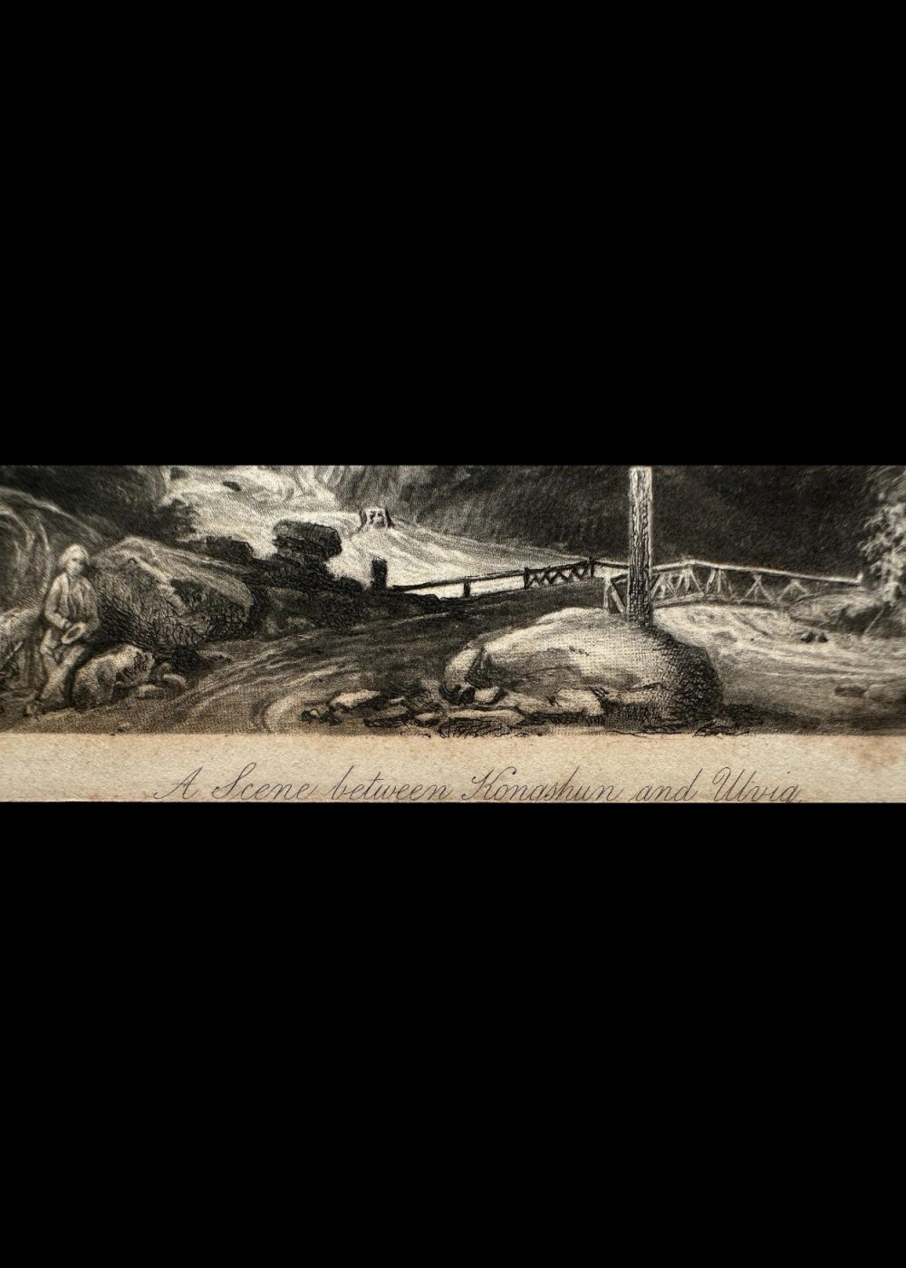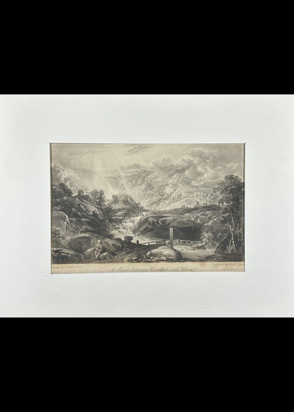 This finely rendered black-and-white engraving depicts a dramatic mountain landscape with a waterfall cascading down rocky cliffs. A stone bridge spans the river in the foreground, where a lone figure sits contemplatively on a rock. Towering peaks and a cloud-filled sky frame the scene, emphasizing the grandeur and solitude of nature. The composition blends human presence with untamed terrain, reflecting the Romantic era’s reverence for sublime landscapes.