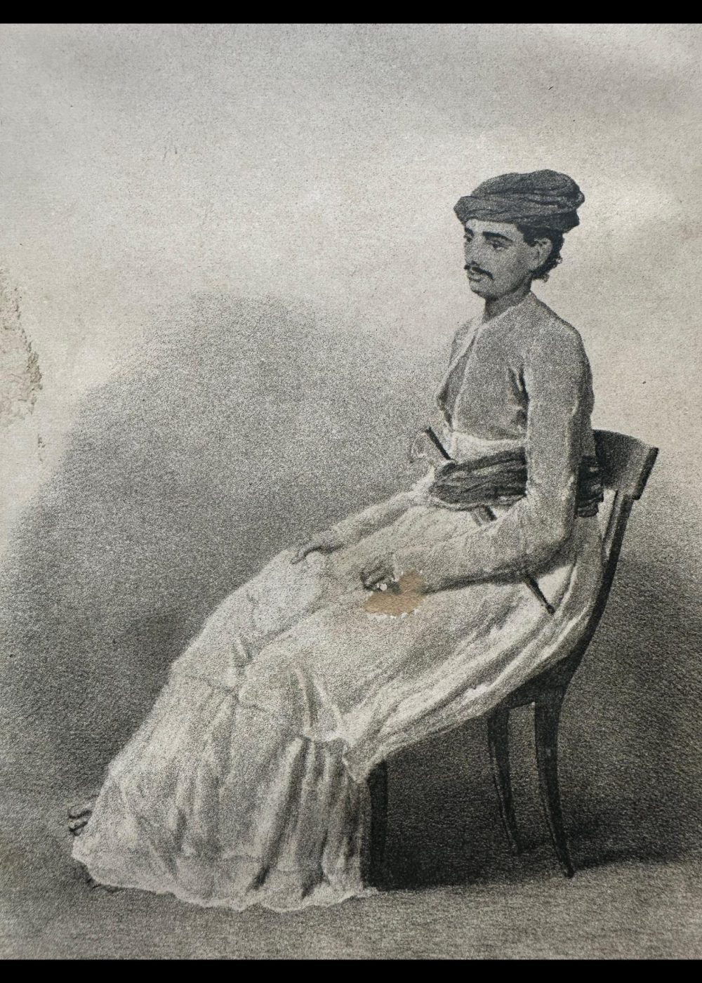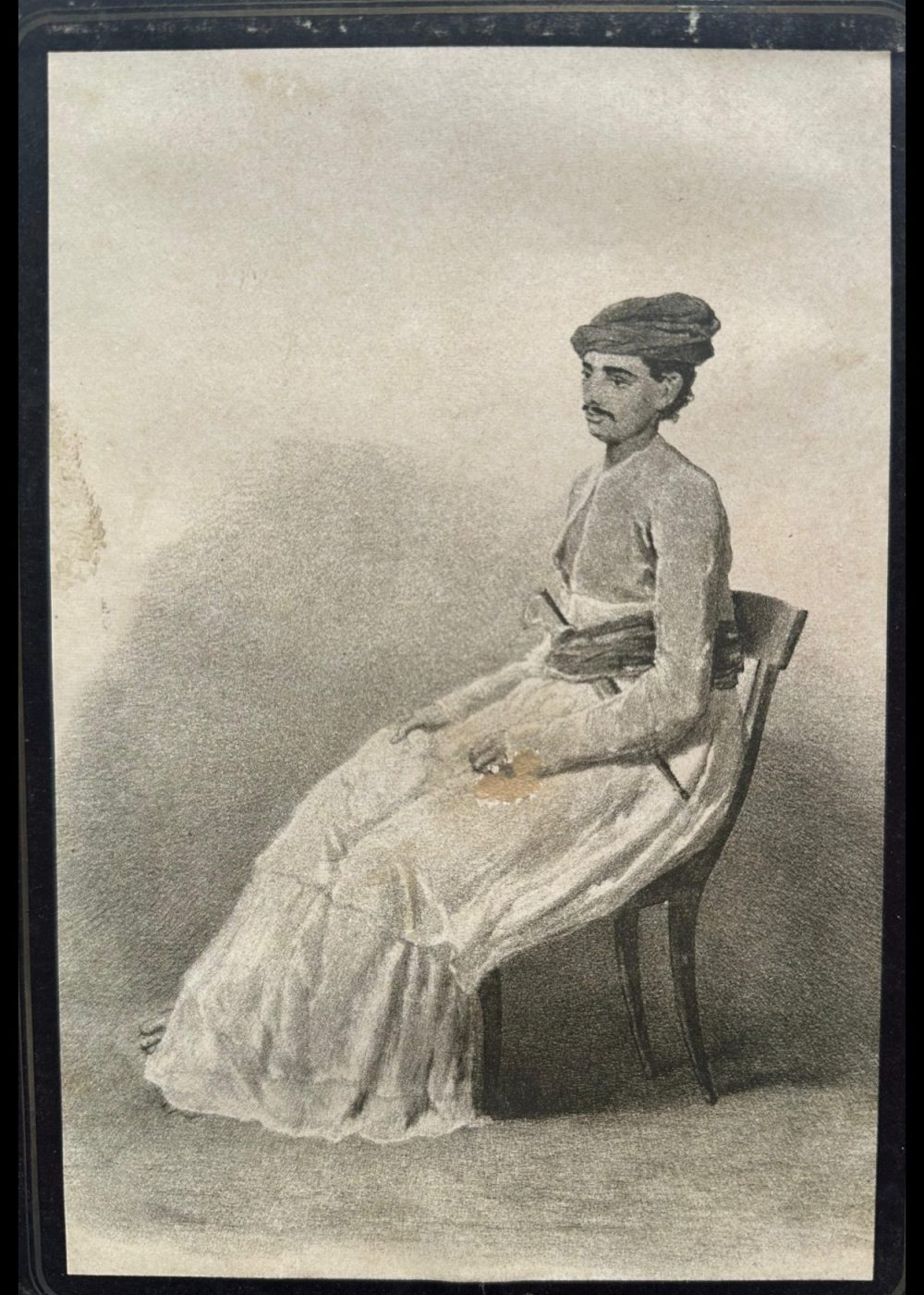 This elegant 19th-century monochrome print captures a poised Indian gentleman seated in a side-facing position, dressed in graceful traditional clothing. His attire consists of a long angarkha or robe, cinched at the waist with a sash, and a turban that adds to his refined appearance. The figure holds a modest yet composed posture, with one hand resting on his lap and the other near his waist, where a dagger is tucked into the waistband—subtly indicating status or readiness. Rendered with soft shading and delicate detail, the print exemplifies colonial-era portrait studies that documented regional attire and cultural identity.