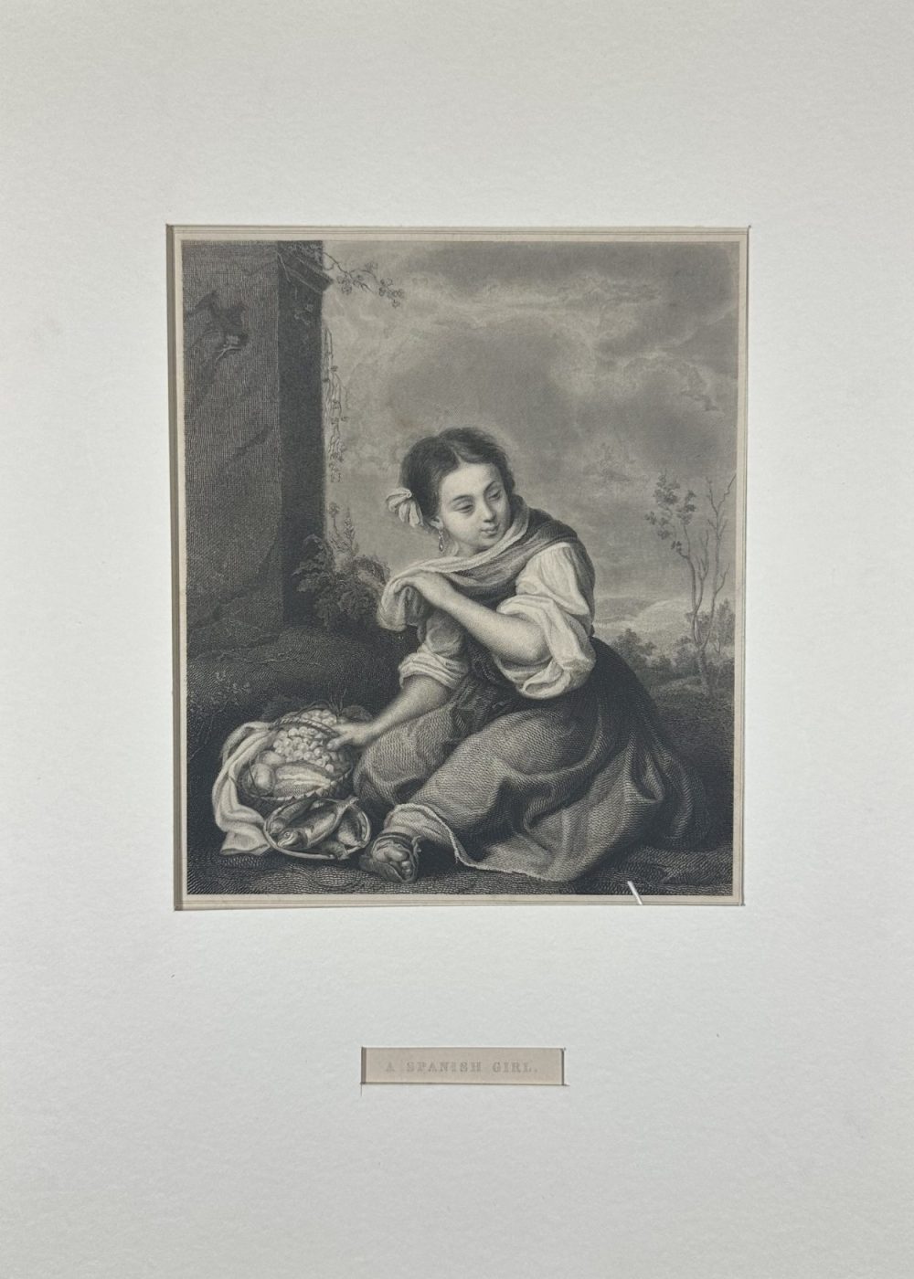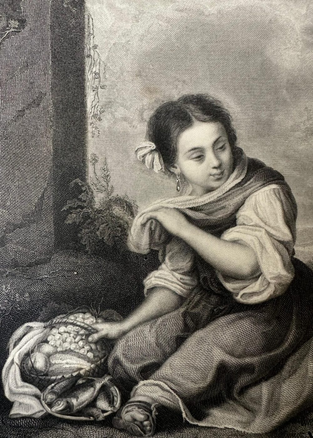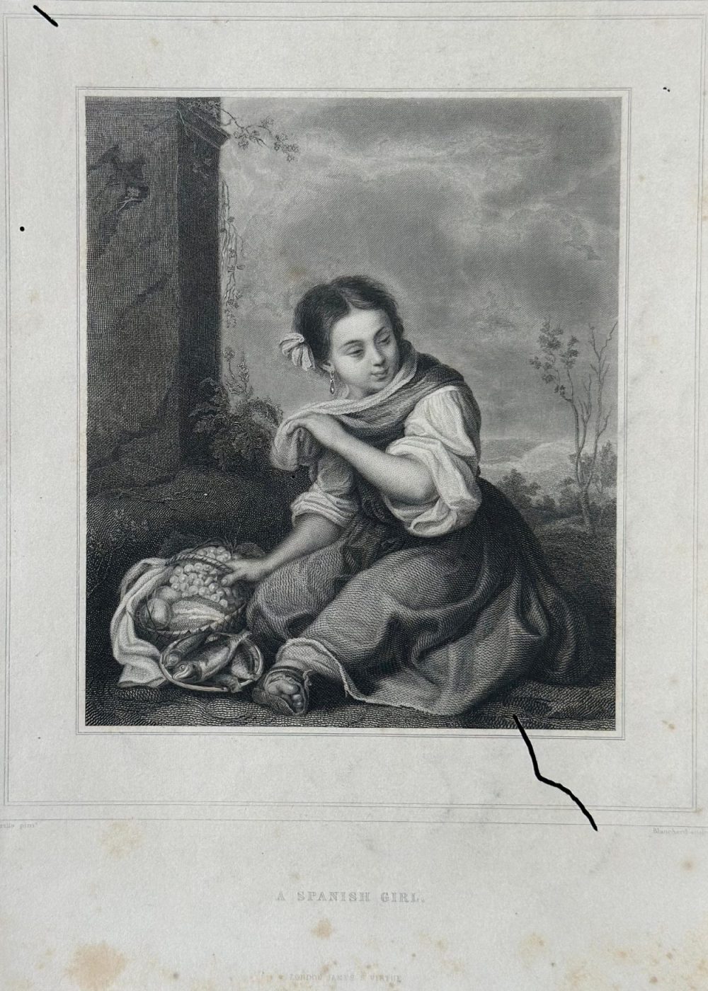 This delicate engraving by Auguste Blanchard, based on a painting by the Spanish master Murillo, presents a serene and intimate portrait of a young Spanish girl in a moment of quiet contemplation. Seated on the ground in a natural setting, she leans slightly, resting her arms gently on a basket of fruit—a symbol of rustic abundance and simplicity. Dressed in traditional attire, with soft folds in her garments and a scarf in her hair, the girl’s expression is thoughtful and calm, exuding innocence and grace. Her gaze, directed slightly away from the viewer, adds a sense of mystery and depth to her character. The background, featuring trees, foliage, and a faint classical column, offers a pastoral charm that complements the girl’s natural beauty. The engraving captures the warmth and realism typical of Murillo’s genre scenes, and Blanchard’s fine technique preserves the subtle textures and soft lighting that give the figure life and presence. A Spanish Girl is a poignant example of 19th-century European printmaking inspired by 17th-century Spanish art, celebrating everyday subjects with poetic dignity.