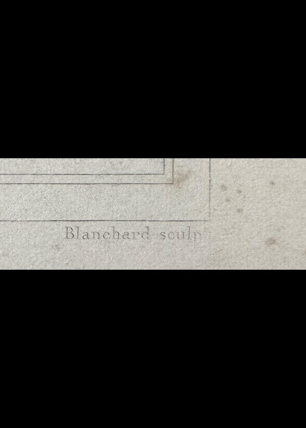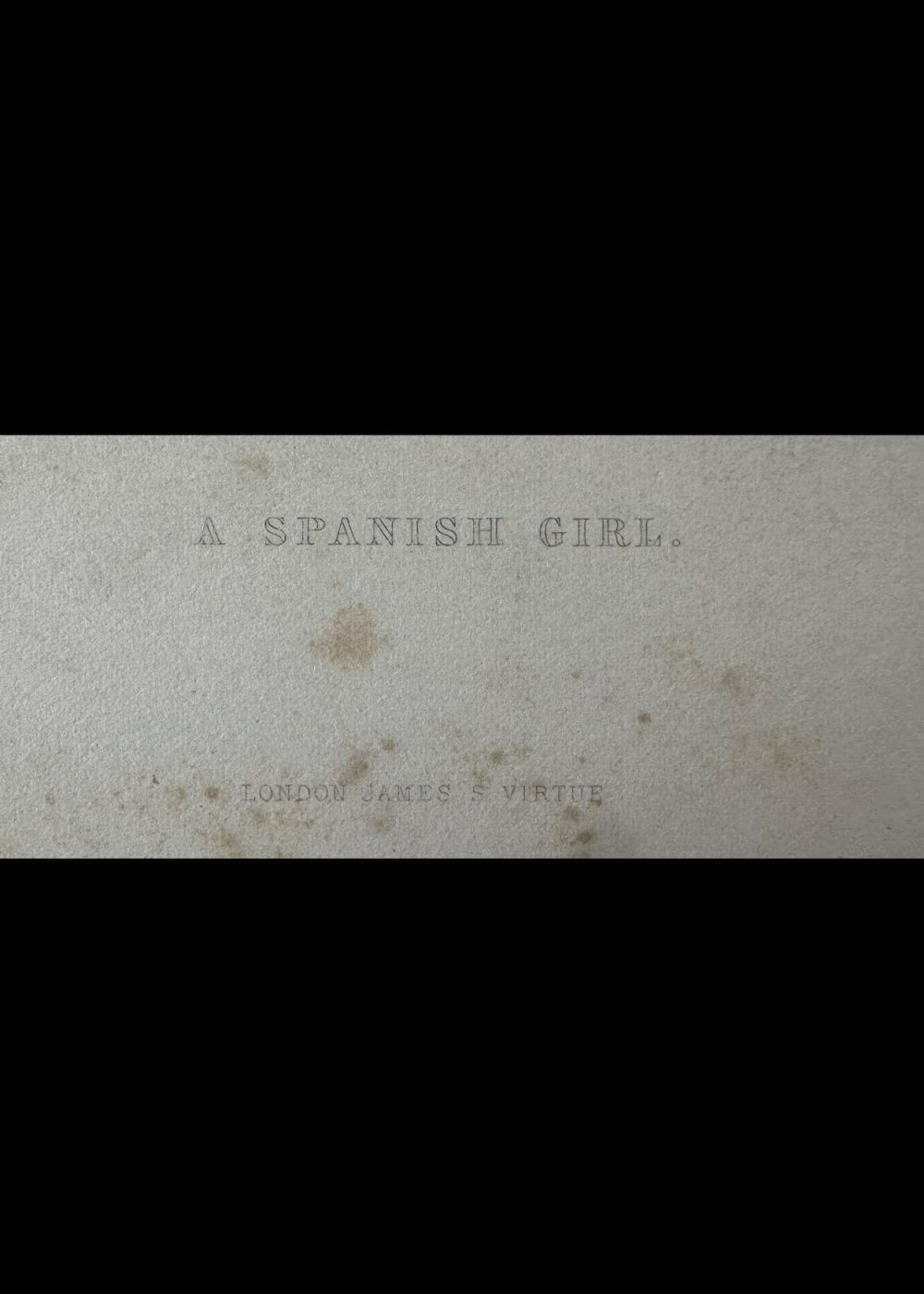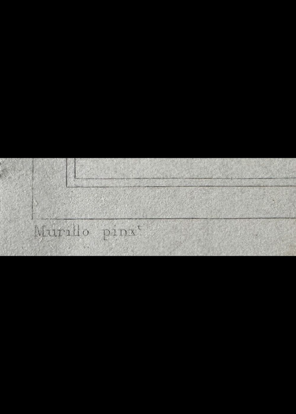 This delicate engraving by Auguste Blanchard, based on a painting by the Spanish master Murillo, presents a serene and intimate portrait of a young Spanish girl in a moment of quiet contemplation. Seated on the ground in a natural setting, she leans slightly, resting her arms gently on a basket of fruit—a symbol of rustic abundance and simplicity. Dressed in traditional attire, with soft folds in her garments and a scarf in her hair, the girl’s expression is thoughtful and calm, exuding innocence and grace. Her gaze, directed slightly away from the viewer, adds a sense of mystery and depth to her character. The background, featuring trees, foliage, and a faint classical column, offers a pastoral charm that complements the girl’s natural beauty. The engraving captures the warmth and realism typical of Murillo’s genre scenes, and Blanchard’s fine technique preserves the subtle textures and soft lighting that give the figure life and presence. A Spanish Girl is a poignant example of 19th-century European printmaking inspired by 17th-century Spanish art, celebrating everyday subjects with poetic dignity.