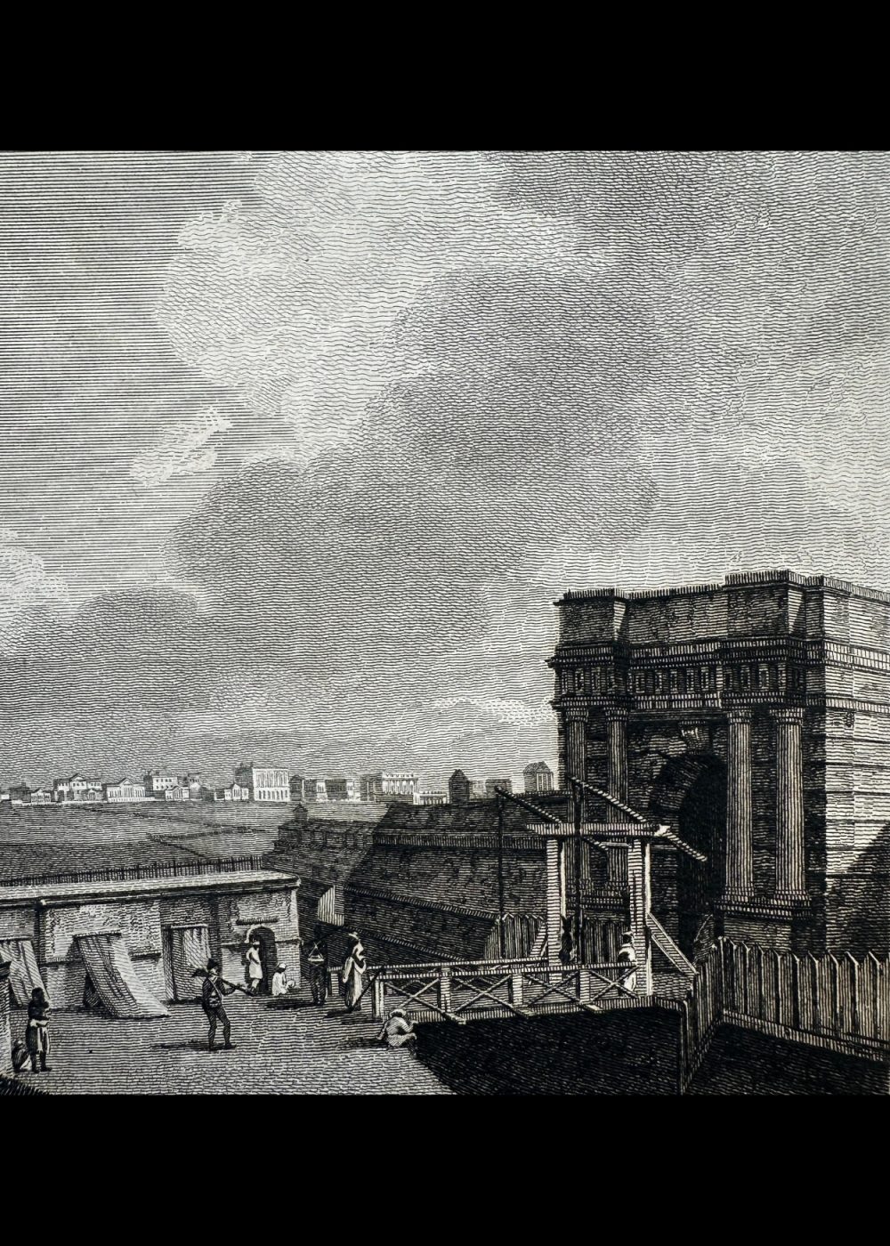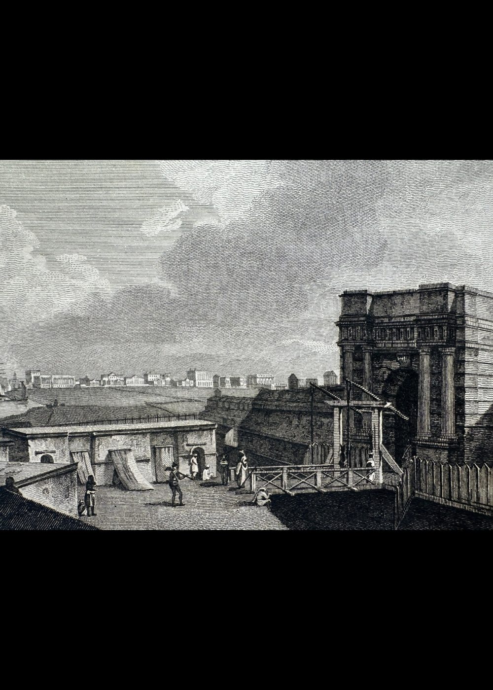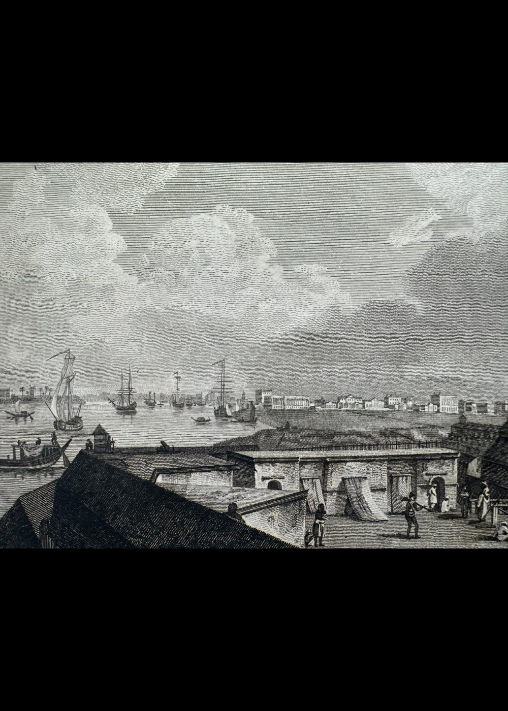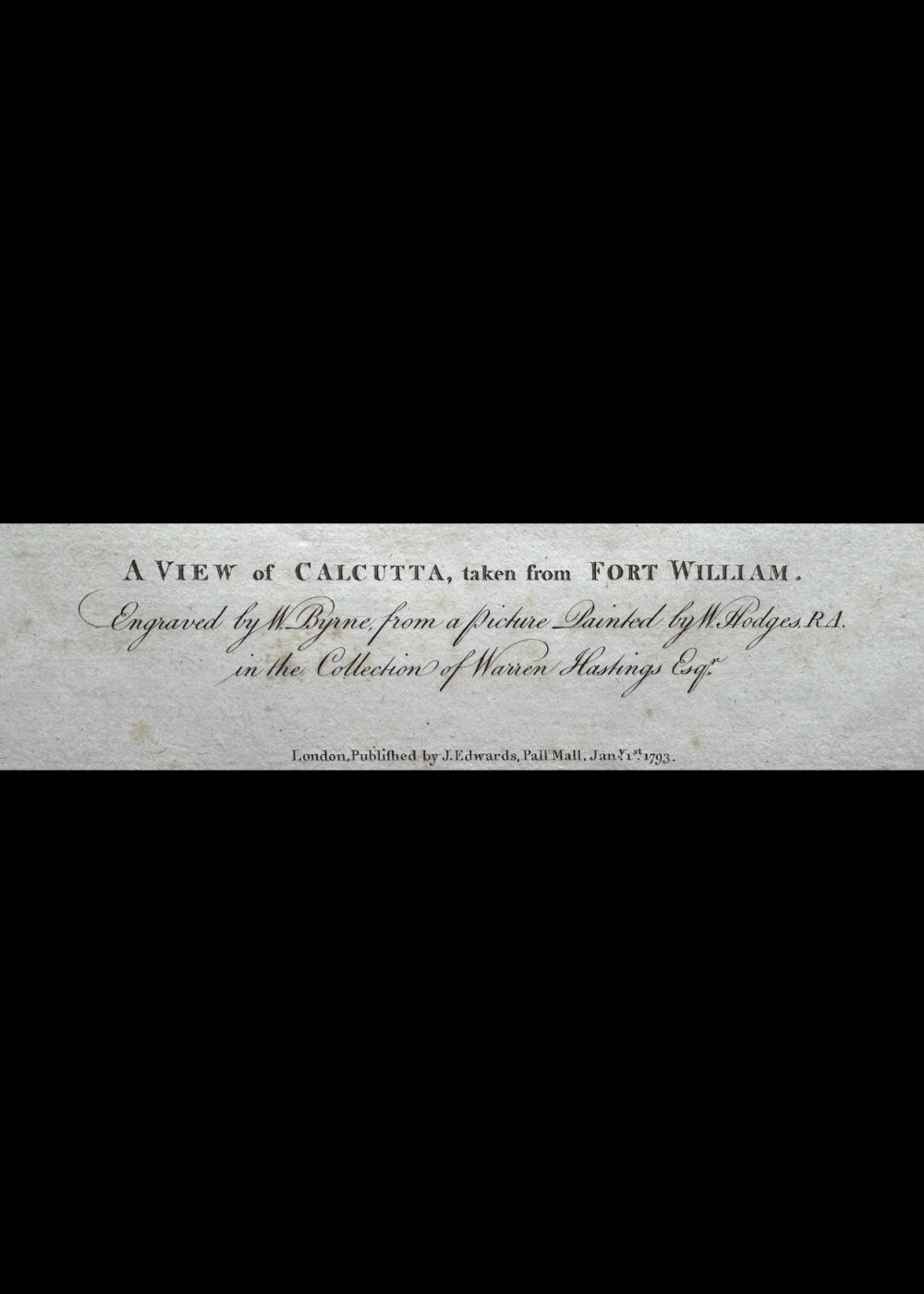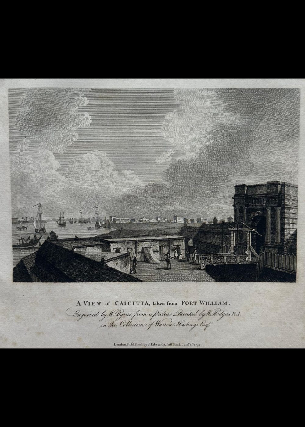 This engraving titled “A View of Calcutta, taken from Fort William” is a detailed depiction of the city of Calcutta (now Kolkata) as seen from the vantage point of Fort William, a British colonial stronghold. The artwork was created by William Hodges, R.A., a renowned British artist, and engraved by M. Byrne.The image illustrates the busy harbor with ships in the distance, and the cityscape of Calcutta, including buildings and the fort itself. It provides a visual record of the colonial architecture and waterfront of the period. The scene captures daily life in the city, with figures seen on the fort’s walls and in the surrounding area, contributing to a sense of the time and place.This engraving was part of Hodges’ travel book on India and was housed in the collection of Warren Hastings, the first Governor-General of India, further adding to its historical significance. It was published in London by J. Edwards, Pall Mall, on January 1, 1793.