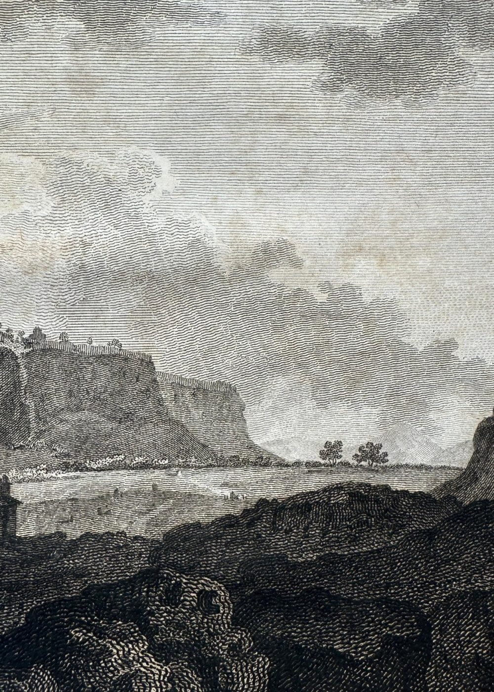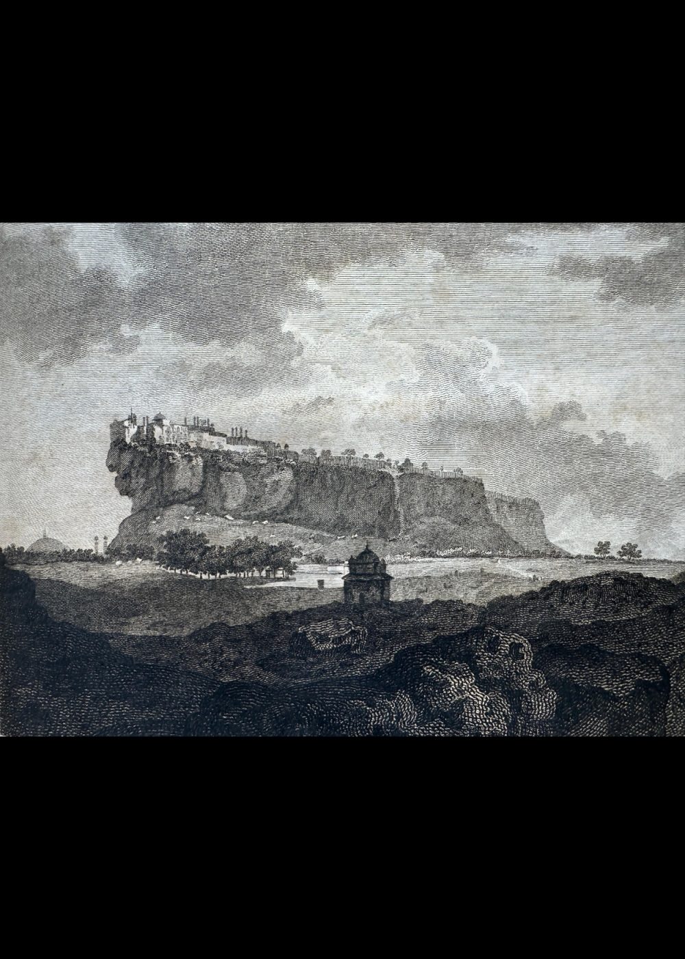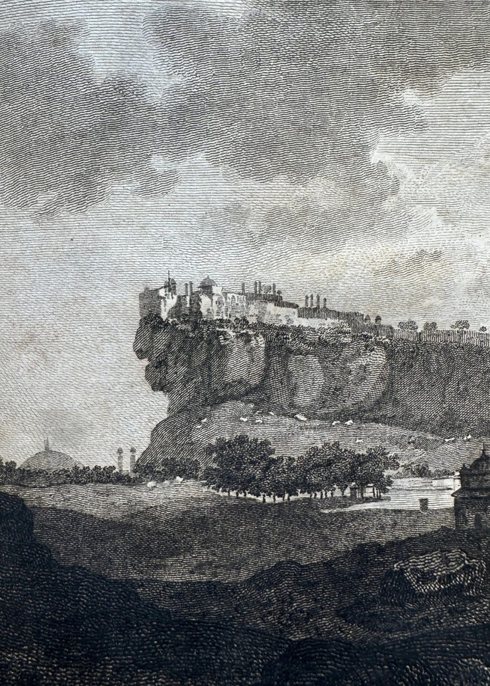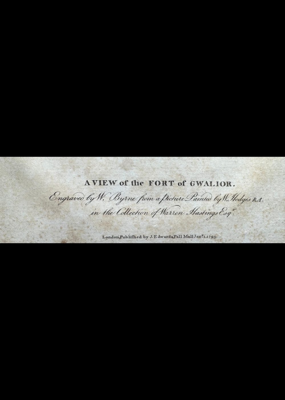 This engraving depicts a view of the Fort of Gwalior, as seen from a distance. The scene is captured in intricate detail, showcasing the fort’s imposing position atop a rocky hill, surrounded by lush landscapes. The image is from “Hodges’ Travels in India” and was created by the artist William Hodges, R.A., who was known for his depictions of India. The engraving itself was executed by W. Byrne. The piece is an example of 18th-century British art, created as part of the collection of Warren Hastings, former Governor-General of India. The publication date of this engraving is 1793, showcasing the dramatic topography and historical significance of Gwalior Fort during British colonial exploration.