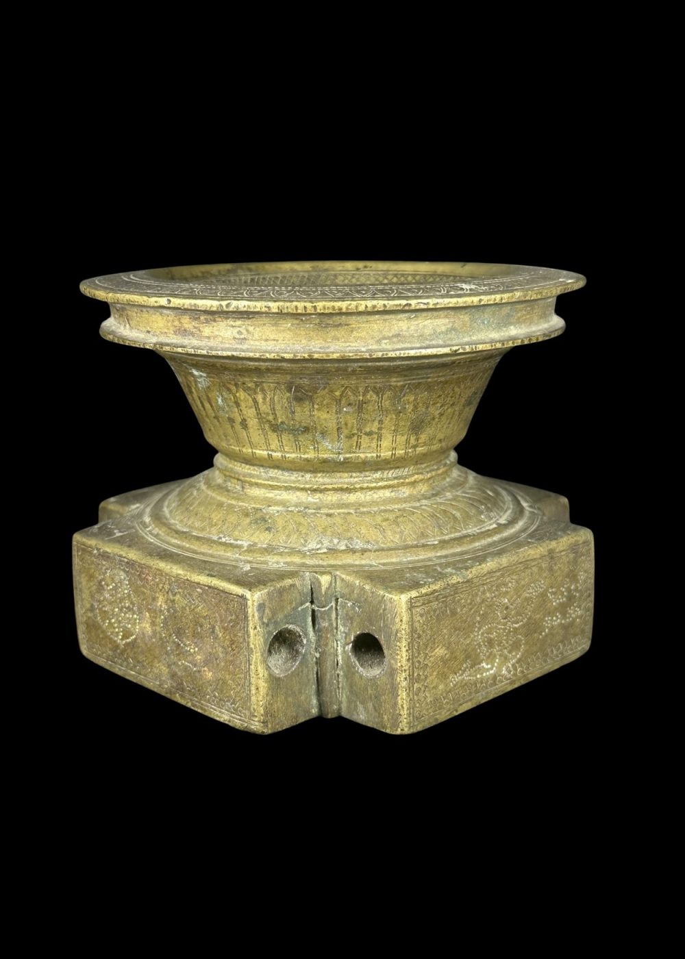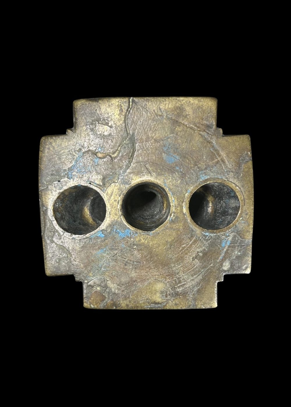 This traditional bronze agricultural funnel, with a wide flaring rim and a square base featuring perforations for fastening, was used in sowing seeds or channeling grains. The engraved linear and geometric patterns enhance its utilitarian form, reflecting the blend of practicality and skilled craftsmanship in rural agricultural tools.