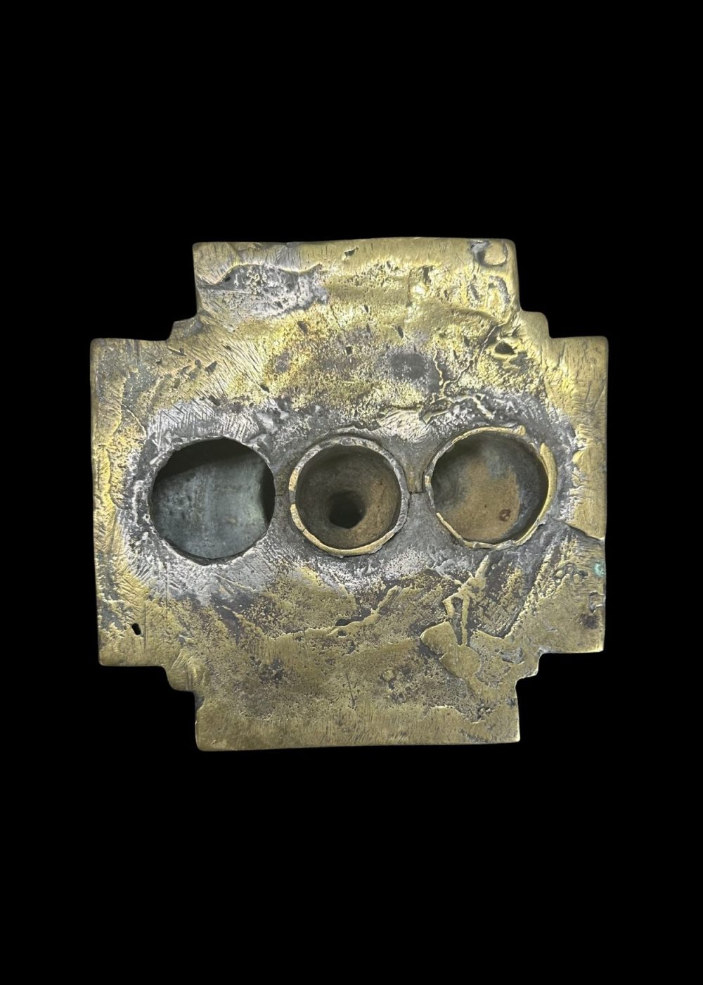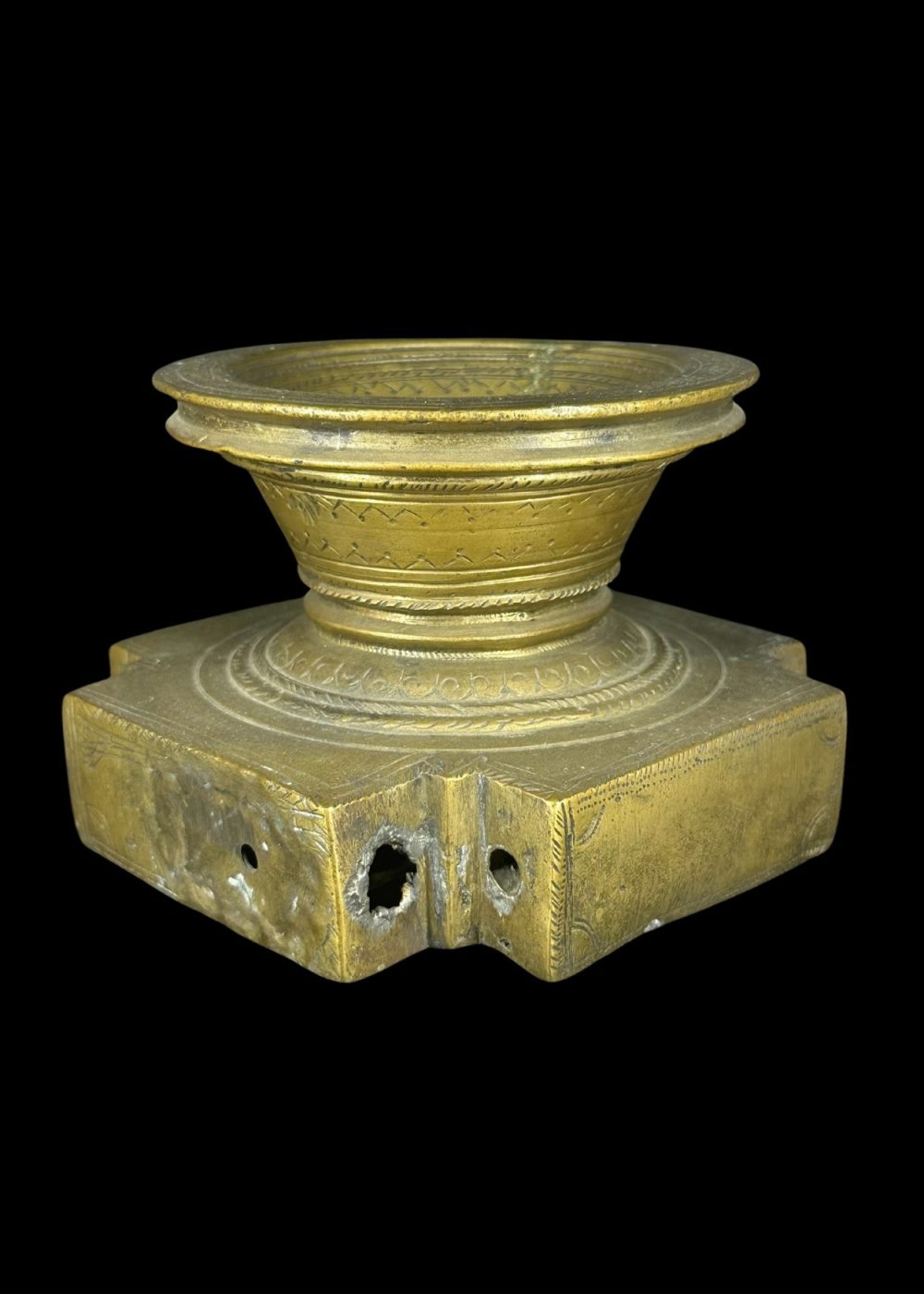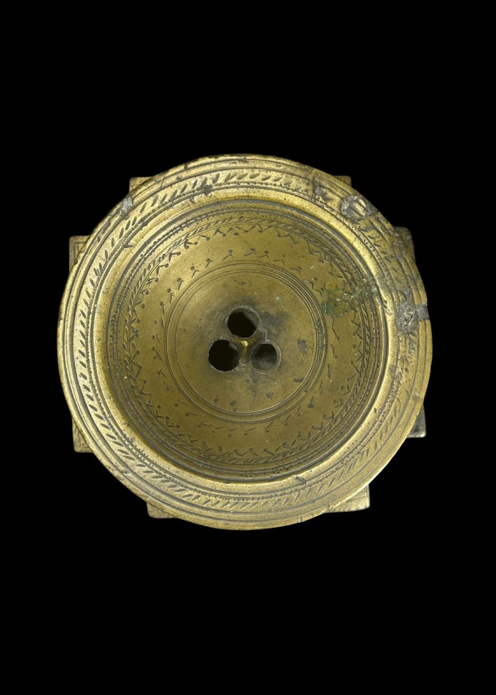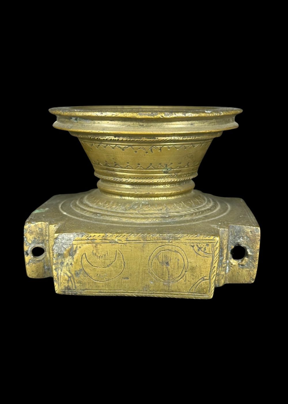 This traditional bronze agricultural funnel, with a wide flaring rim and a square base featuring perforations for fastening, was used in sowing seeds or channeling grains. The engraved linear and geometric patterns enhance its utilitarian form, reflecting the blend of practicality and skilled craftsmanship in rural agricultural tools.