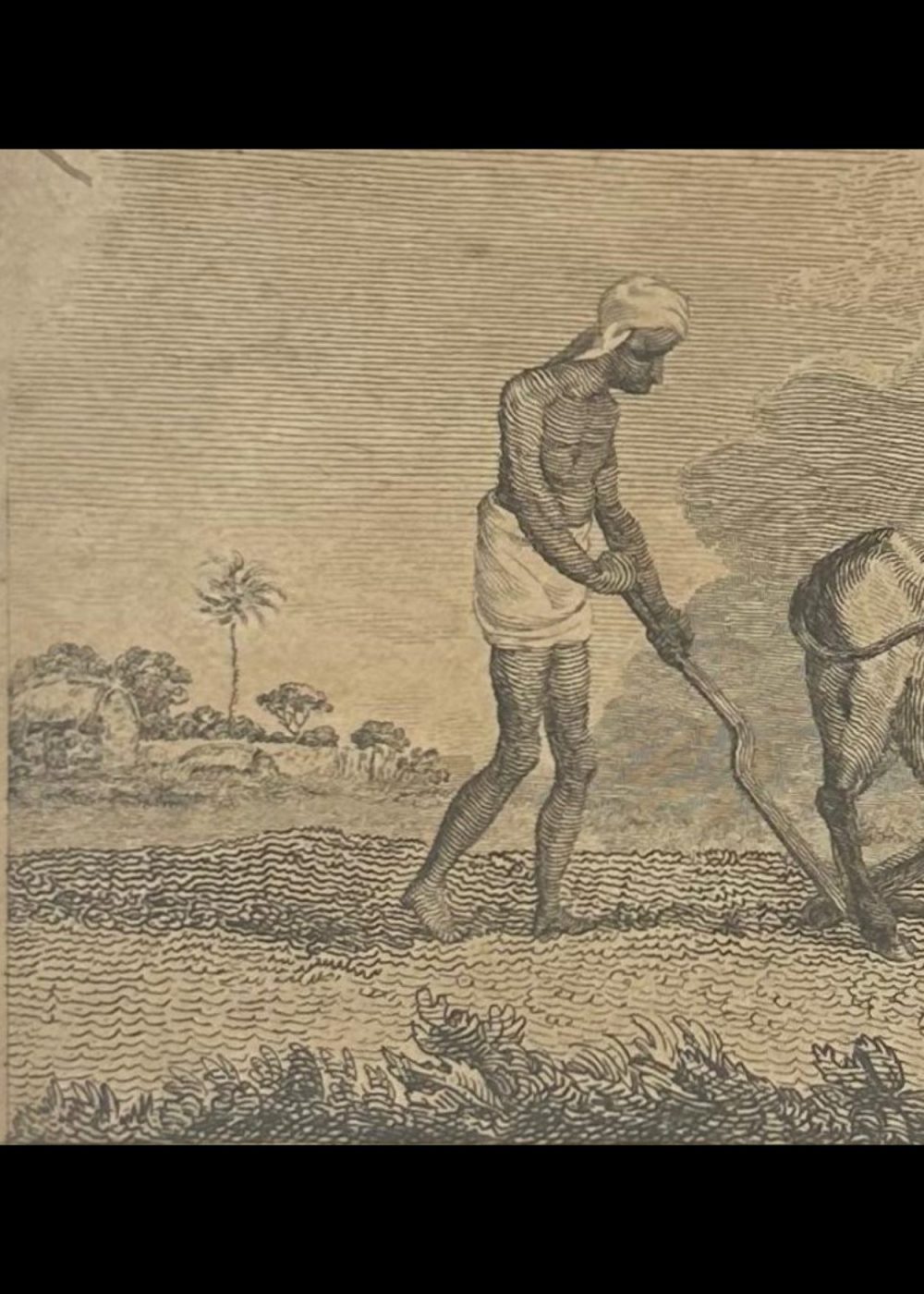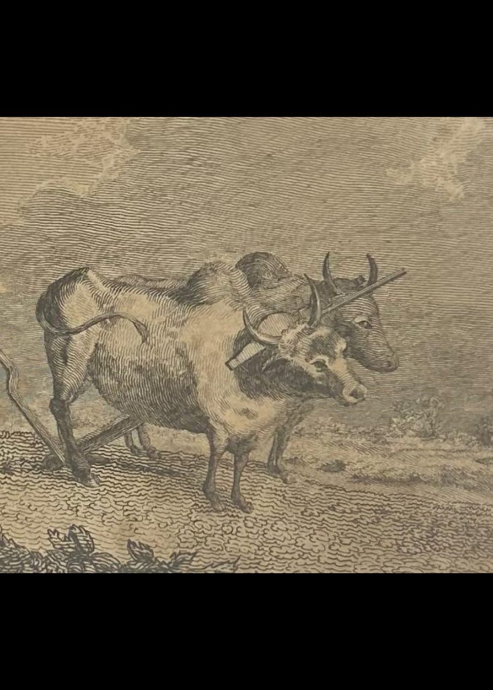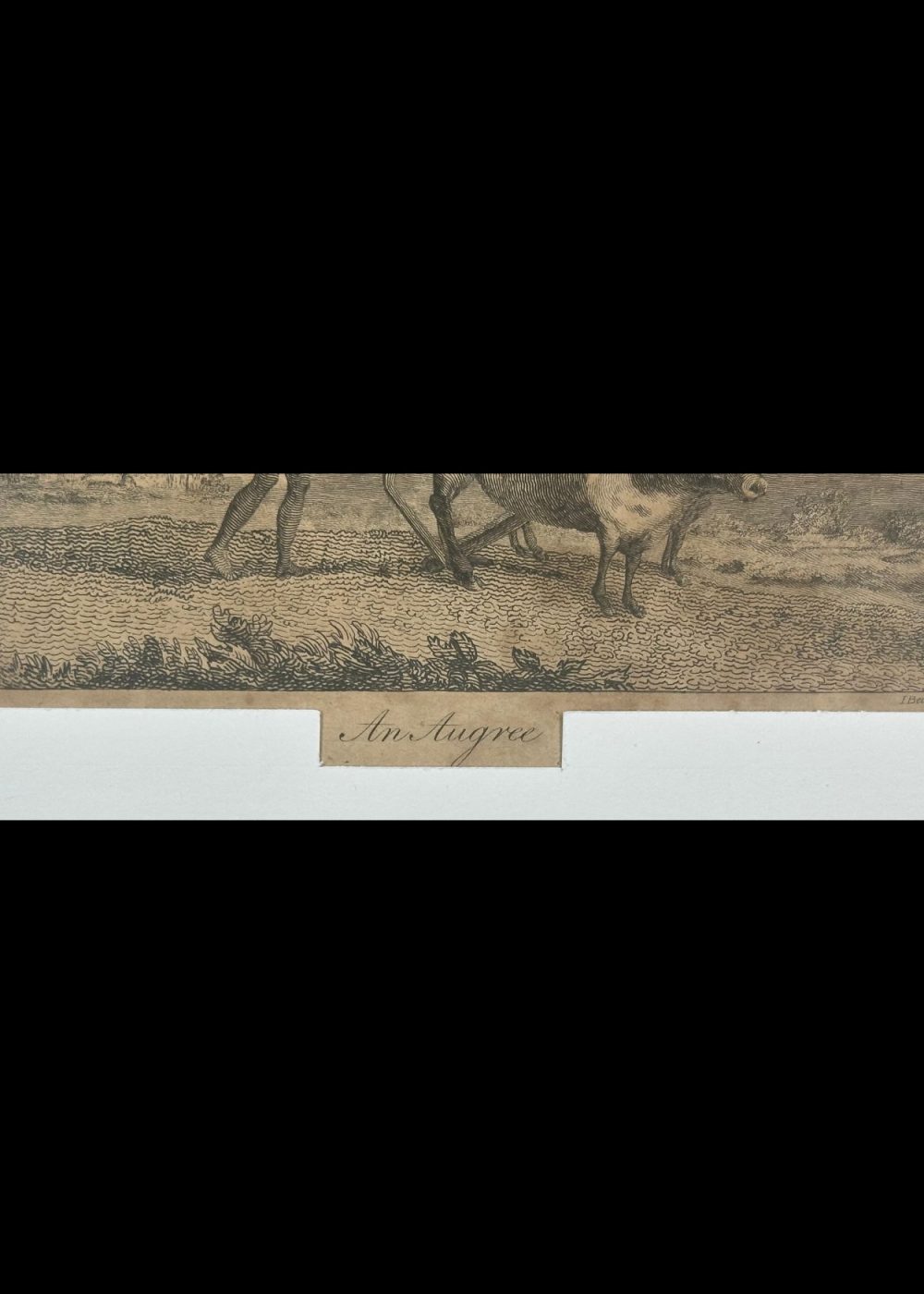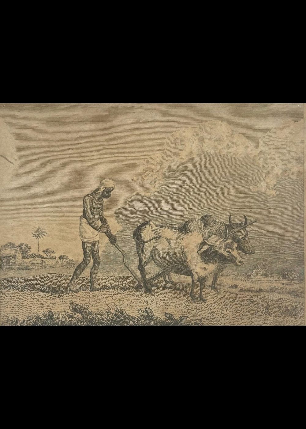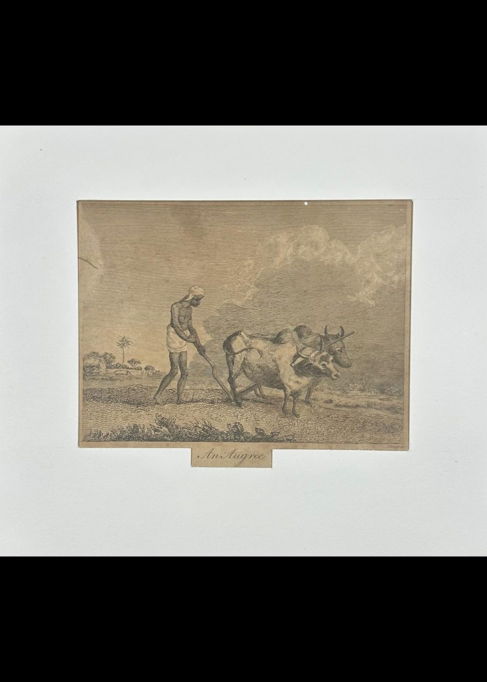 This is a finely detailed vintage etching titled “An Augree”, portraying a traditional agrarian scene in rural India, created in 1804 and published in London. The composition features a lone farmer, bare-chested and wearing a simple loincloth and turban, guiding a plow pulled by two yoked oxen. The animals are depicted in motion, suggesting the active tilling of the soil, a crucial moment in the preparation of the land for cultivation. The background includes a minimalist landscape with distant trees, a few hut-like structures, and a singular palm tree that hints at the tropical climate. The sky is rendered with etched horizontal lines and swirling cloud forms, adding texture and atmosphere to the scene. The word “Augree” is likely an anglicized form of a regional term for an agricultural laborer or ploughman. The etching is signed “I. Baugé” in the bottom right corner, indicating the artist. The overall tone of the artwork is pastoral and respectful, offering a glimpse into the everyday labor and traditional farming techniques of rural India during the colonial era. The craftsmanship, with its delicate linework and tonal variation, suggests this was produced as part of a broader 18th or 19th-century effort to document and romanticize colonial subjects and landscapes.
