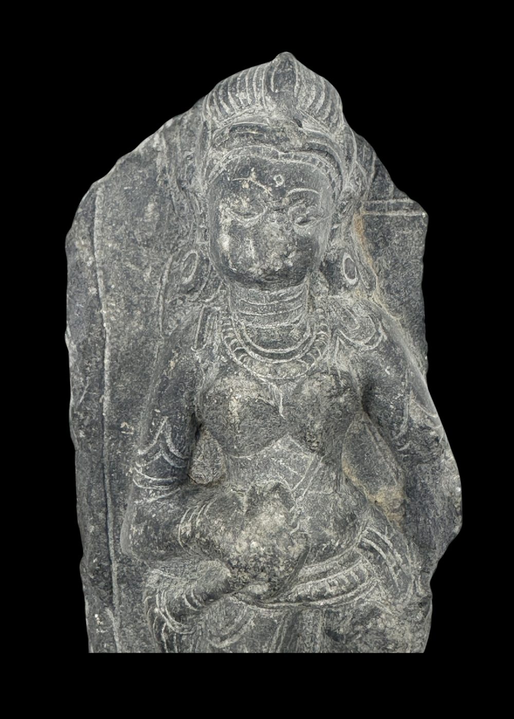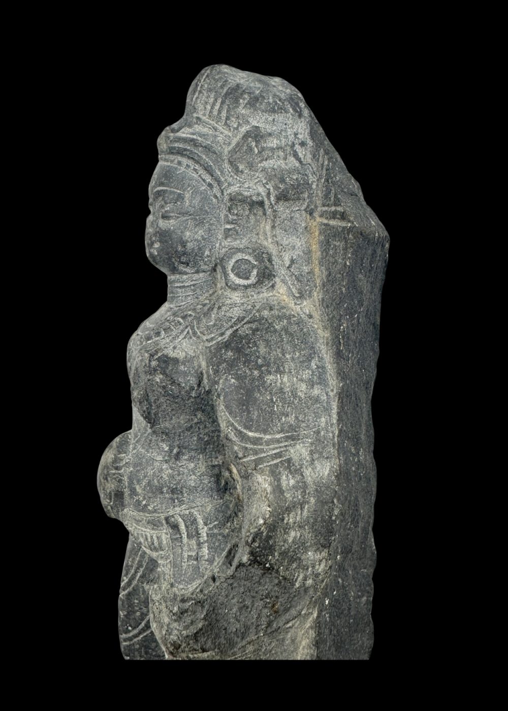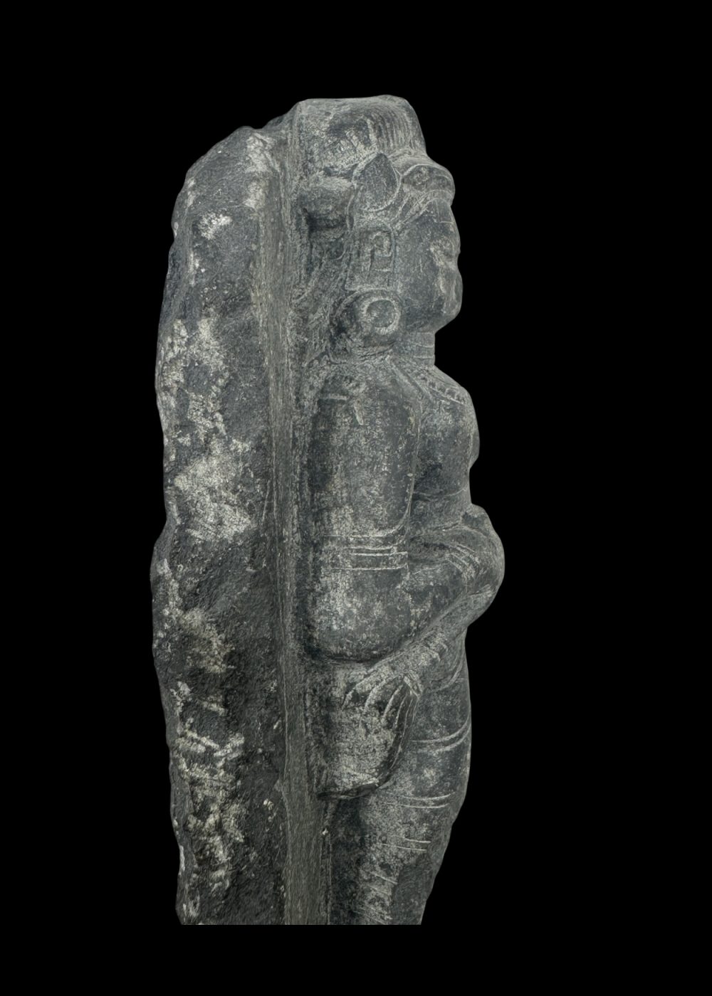 This intricately carved stone sculpture portrays a figure adorned with detailed jewelry and ceremonial attire, likely representing a deity or revered historical figure. The craftsmanship showcases refined artistry—ornate textures along the garments and expressive facial features evoke a sense of spiritual or cultural reverence. Its stylistic elements suggest origins rooted in ancient religious or royal tradition, offering a glimpse into the aesthetic and symbolic values of the era in which it was created.