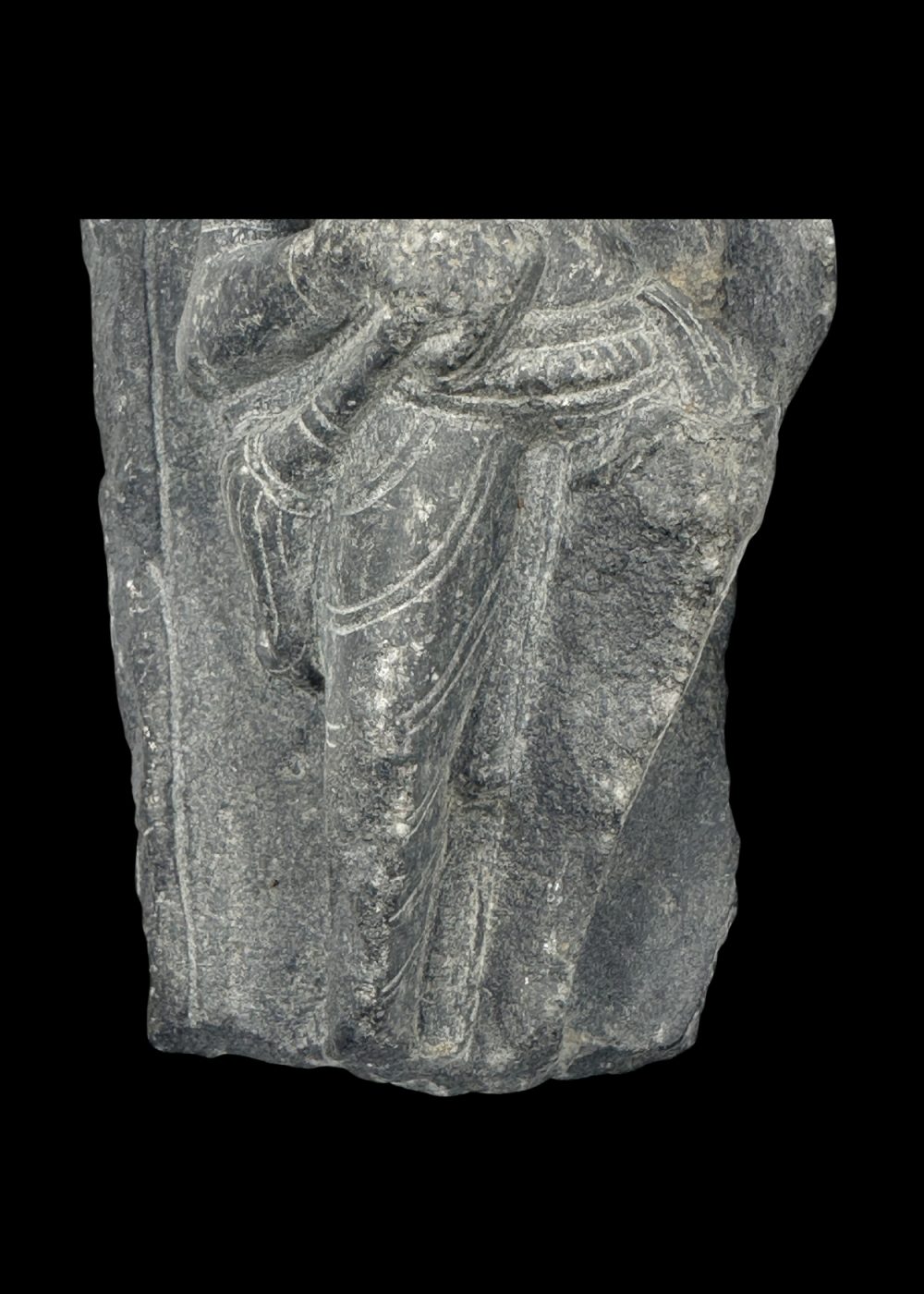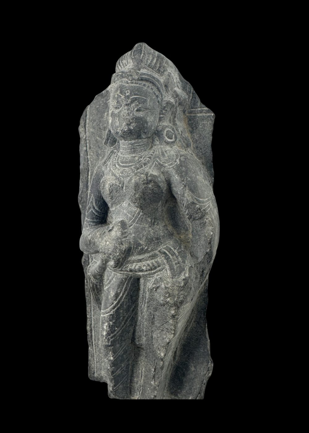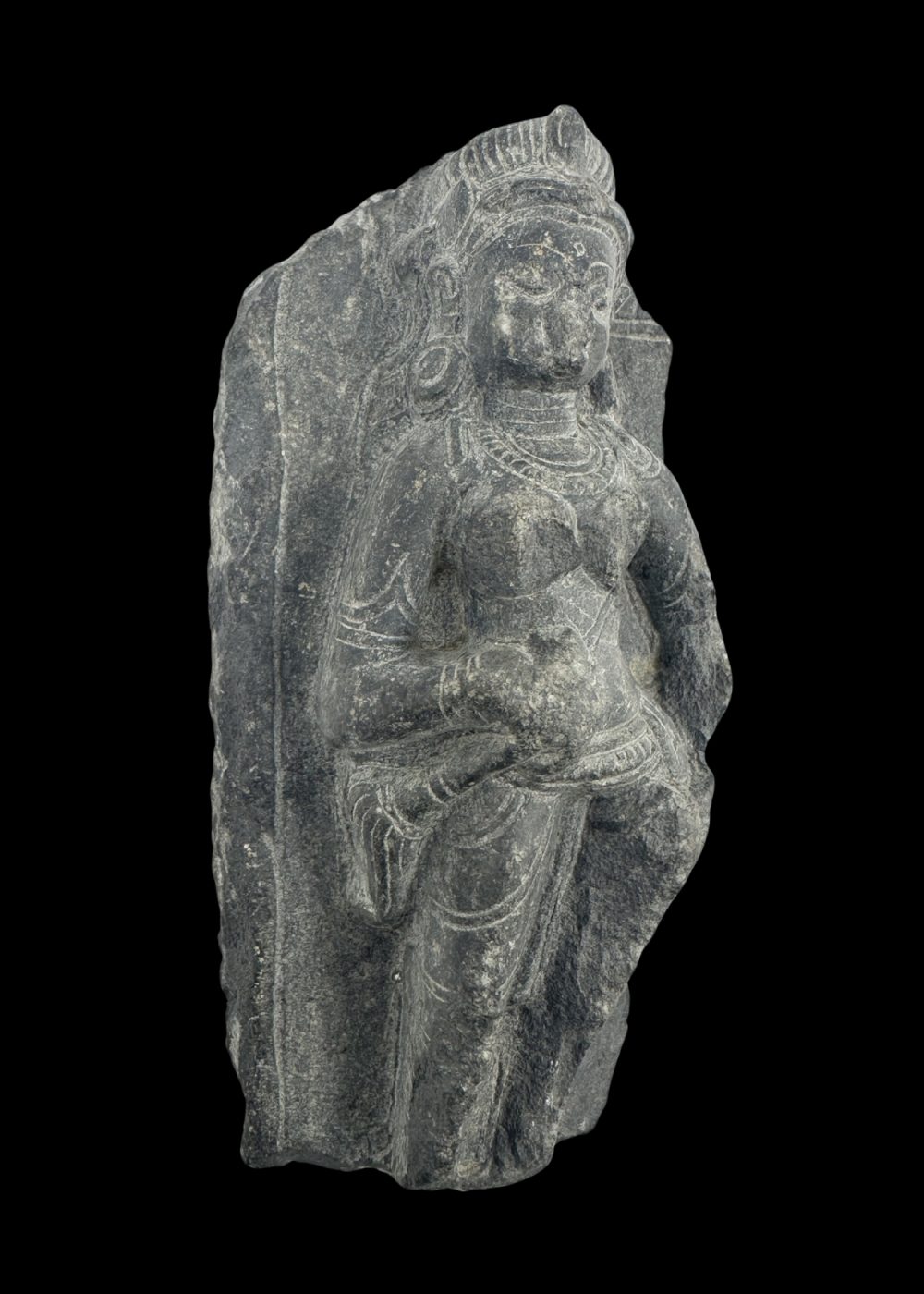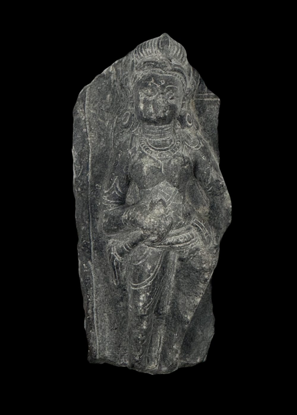 This intricately carved stone sculpture portrays a figure adorned with detailed jewelry and ceremonial attire, likely representing a deity or revered historical figure. The craftsmanship showcases refined artistry—ornate textures along the garments and expressive facial features evoke a sense of spiritual or cultural reverence. Its stylistic elements suggest origins rooted in ancient religious or royal tradition, offering a glimpse into the aesthetic and symbolic values of the era in which it was created.