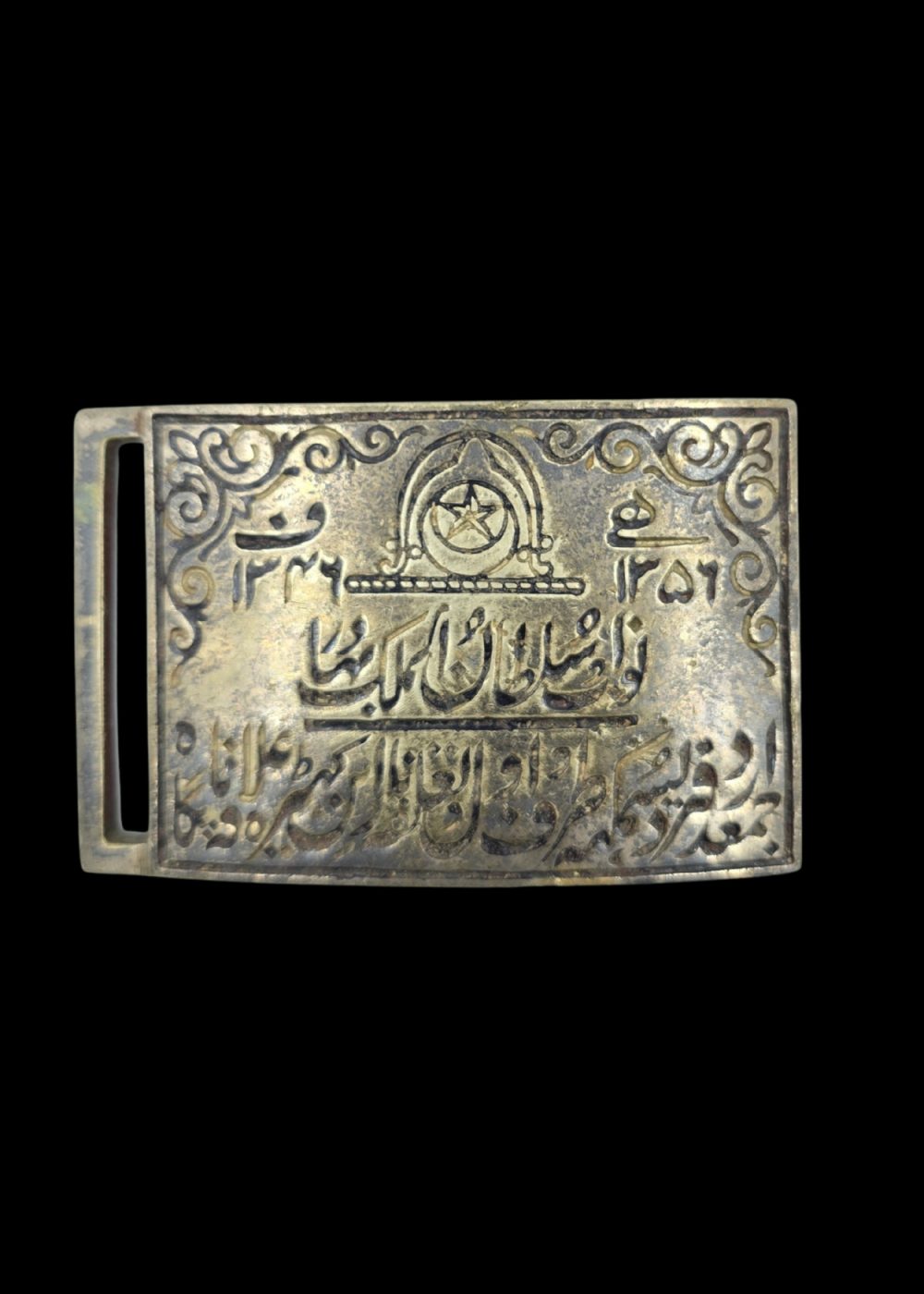 This is an antique brass belt buckle featuring intricate engravings and Arabic script, along with traditional ornamental patterns. The centerpiece displays a circular motif, possibly a symbol or emblem, surrounded by decorative designs. The Arabic inscription likely relates to a historical or cultural context, adding collectible and heritage value to the piece. This buckle exemplifies fine craftsmanship and serves as a remarkable artifact for collectors and historians.