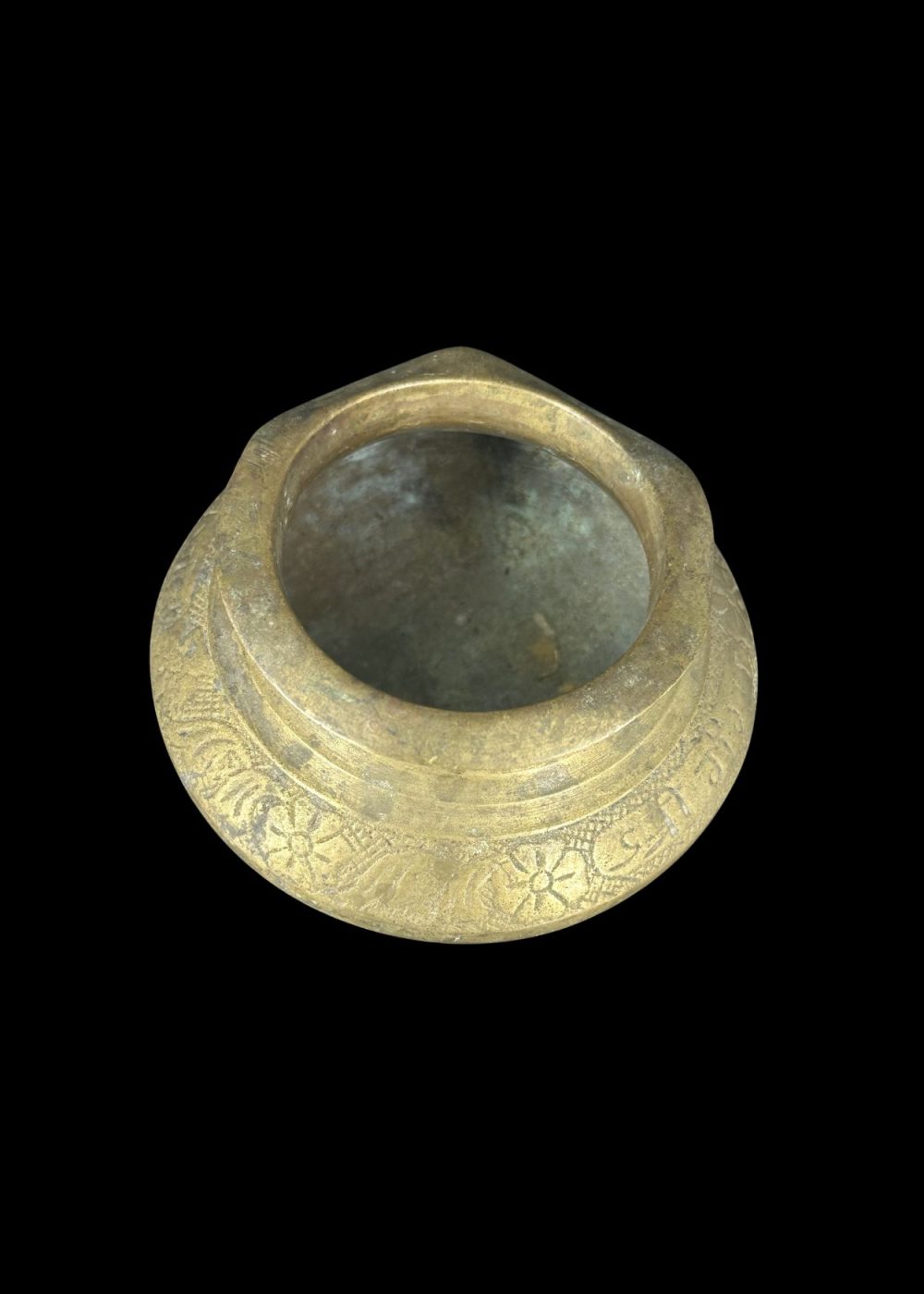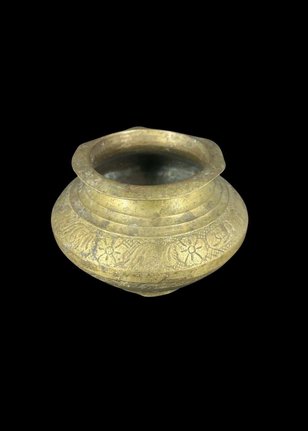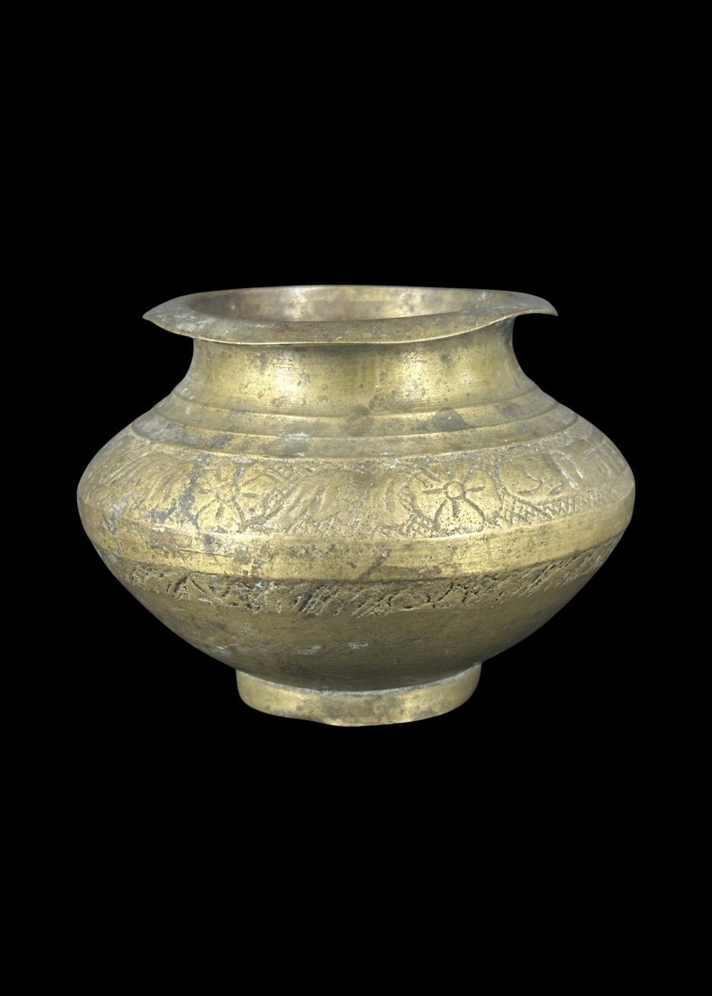 This antique bronze water pot, showcases the traditional craftsmanship of South Asia. The vessel features a broad, rounded body tapering to a narrow foot, with a gently flared spout at the rim for easy pouring. Intricately engraved floral and geometric patterns encircle the upper portion, adding decorative appeal to its utilitarian form. Such pots were commonly used for storing or pouring water during daily use or in religious rituals, symbolizing purity and sustenance. The warm patina and hand-etched designs speak to its age and artisanal heritage.