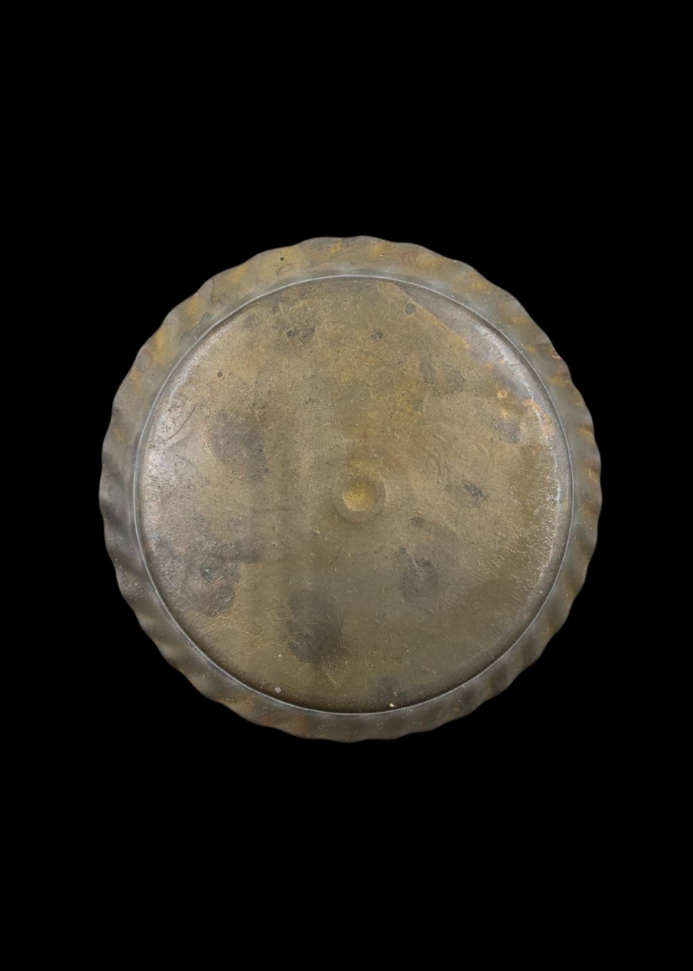 This is an antique brass bowl featuring hand-engraved patterns on its interior surface. The bowl’s design includes geometric and floral motifs, highlighting skilled traditional craftsmanship. Such items were commonly used for ceremonial, household, or decorative purposes and are valued by collectors for their historical and artistic significance.