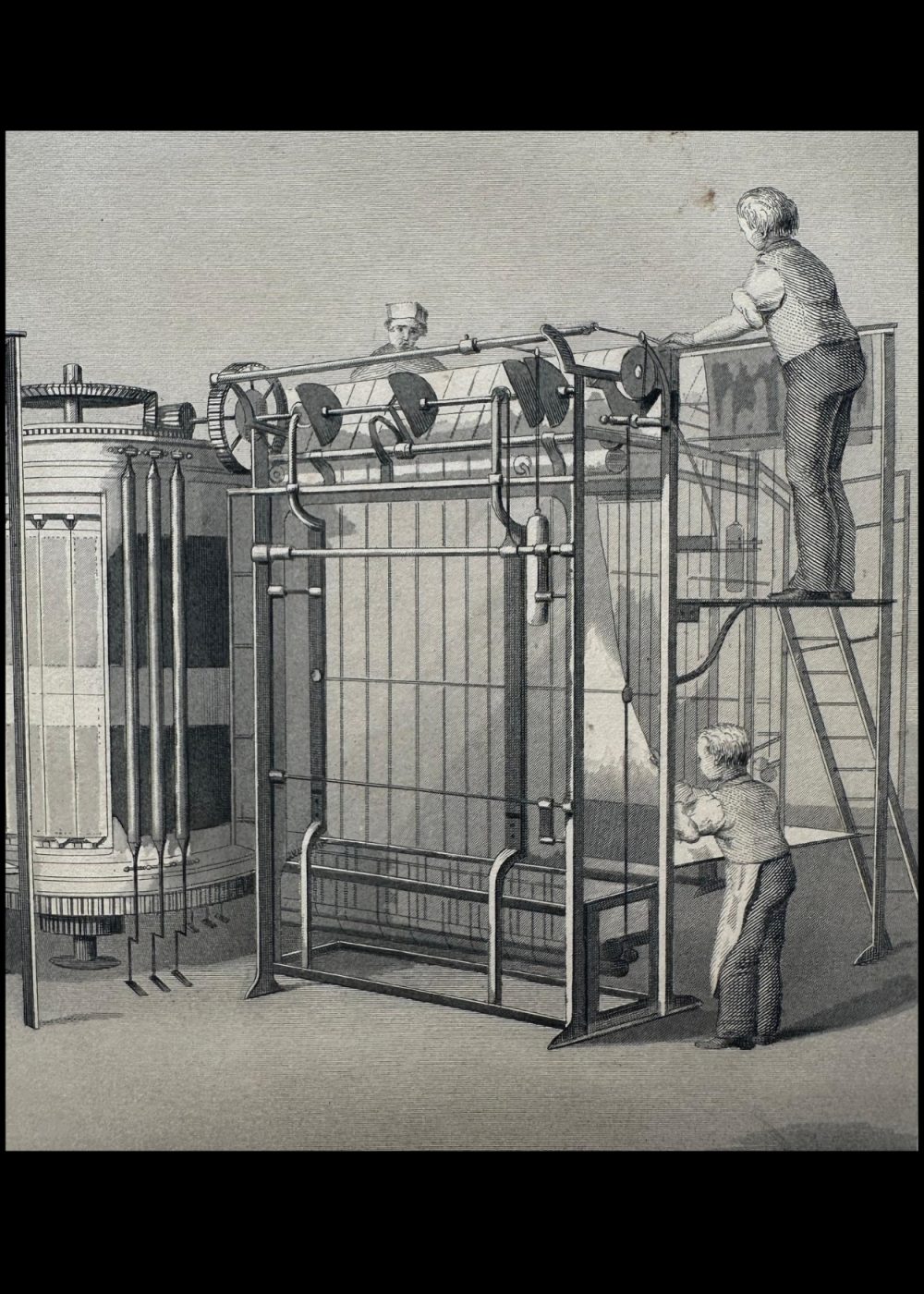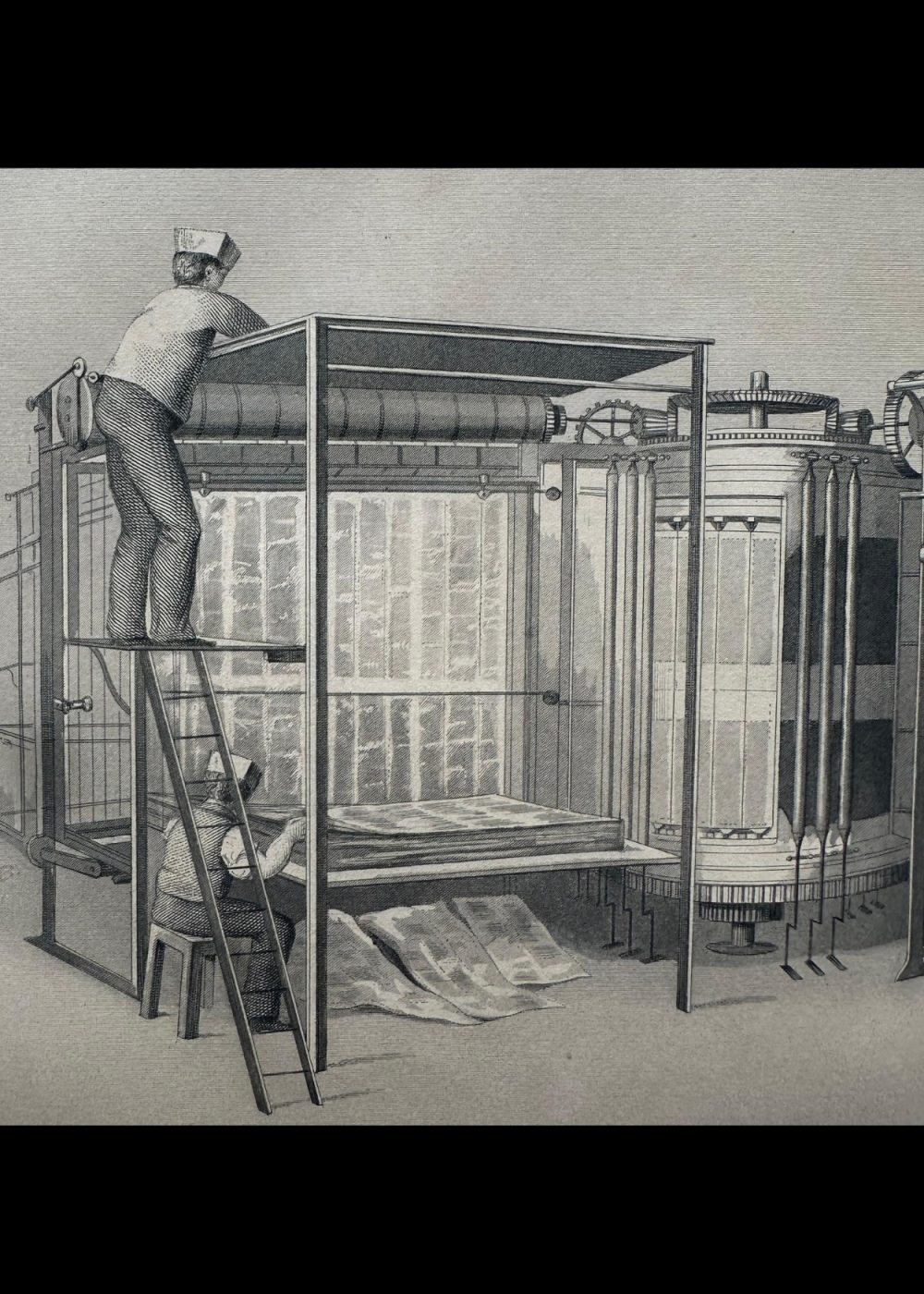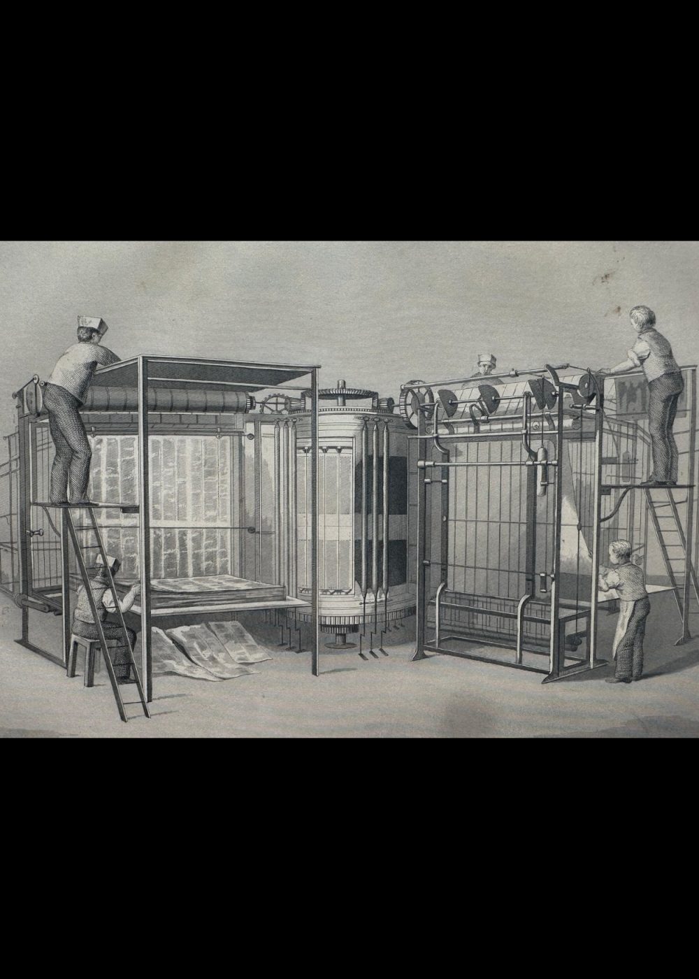 This engraving illustrates “Applegarth’s Vertical Printing Machine,” a groundbreaking piece of technology used in the production of newspapers like The Illustrated News and The Times. The machine is shown in action with workers operating it, climbing ladders and managing the printing process. The vertical design of the machine allows for efficient and large-scale printing, symbolizing the industrial innovations of the time. Featured in the Crystal Palace book, this engraving highlights the advancements in printing technology during the Victorian era, contributing to the rapid spread of information through newspapers.