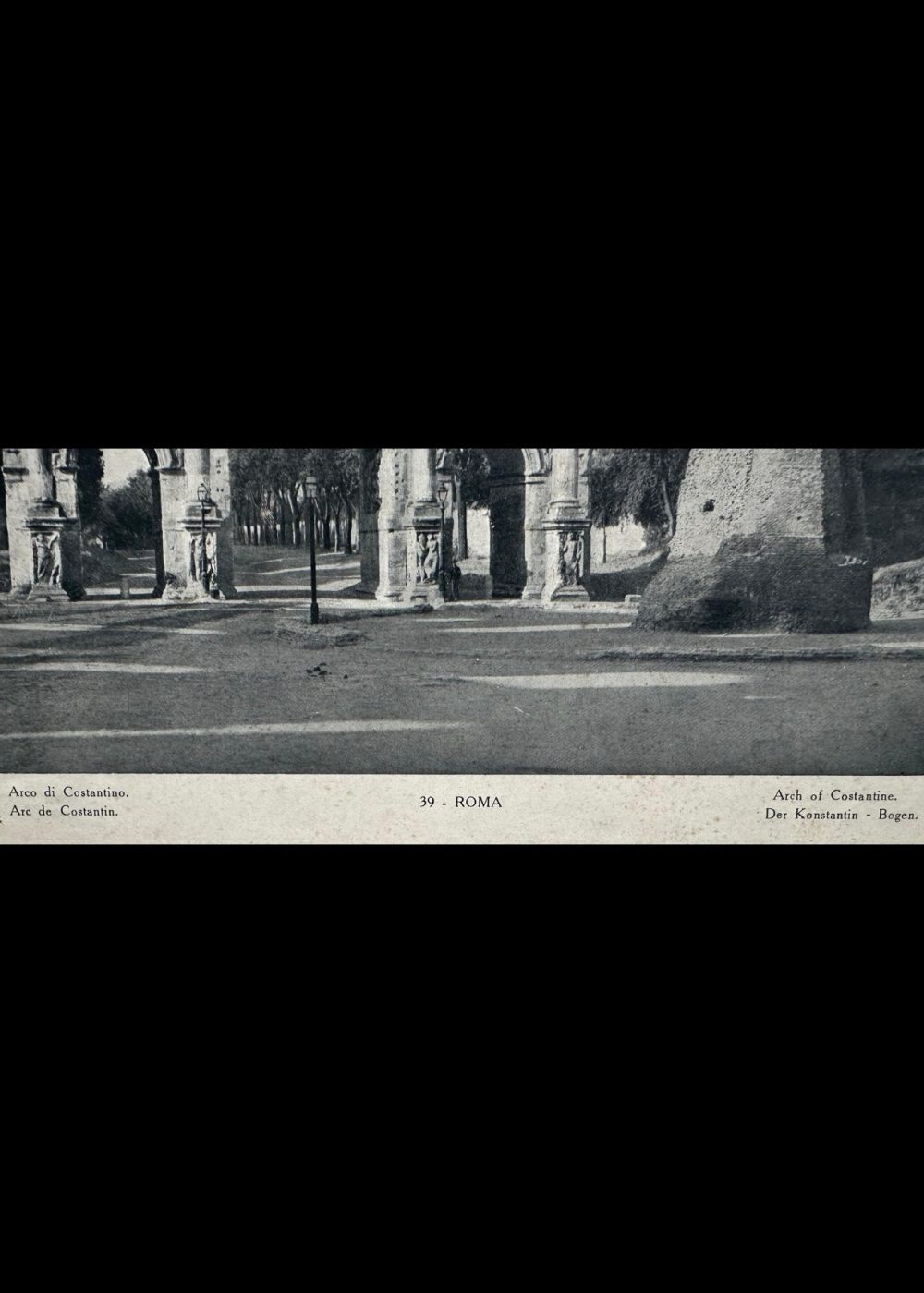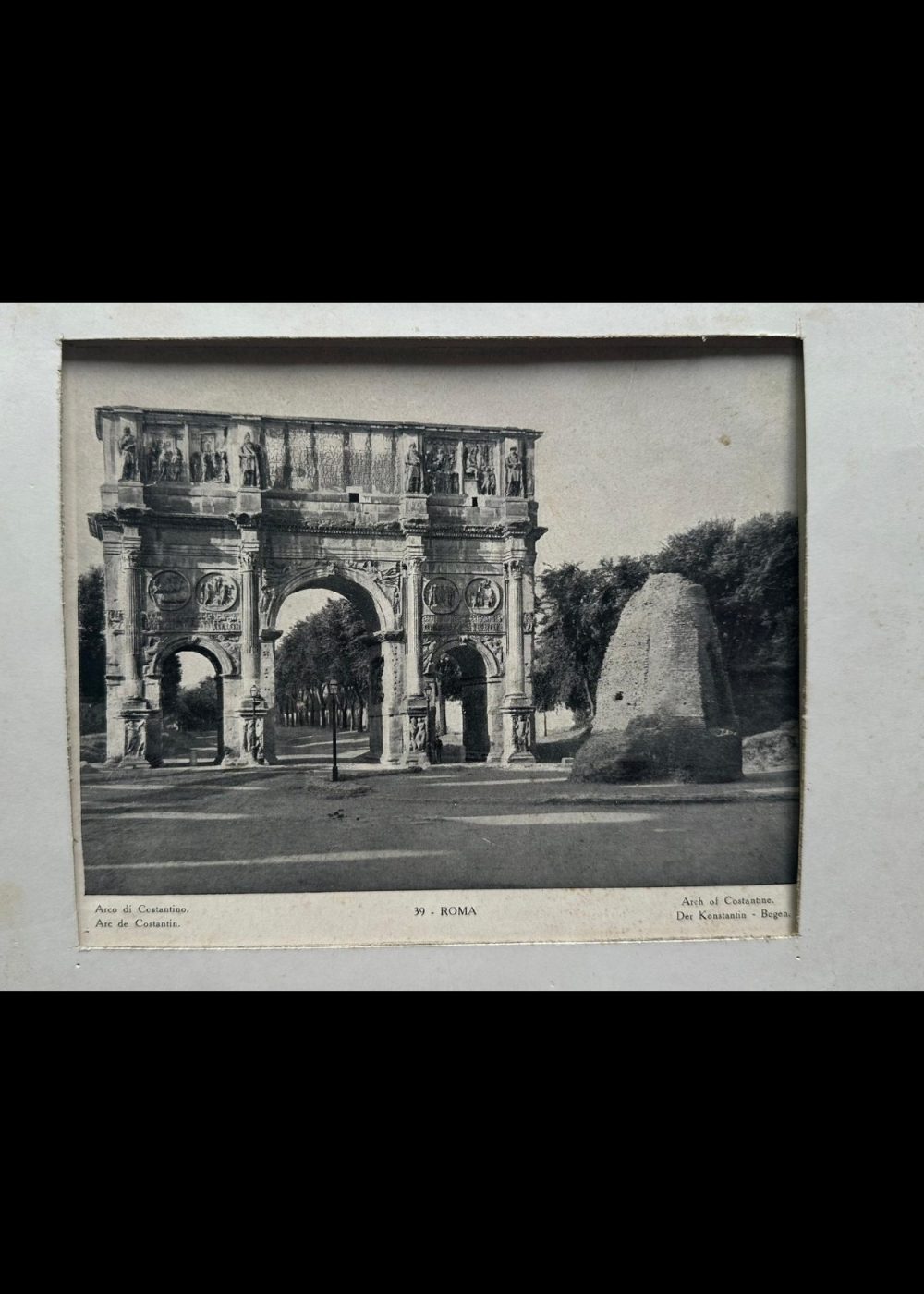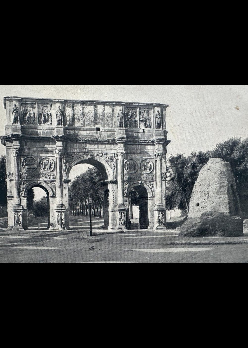 This vintage photograph features the Arch of Constantine, one of Rome’s most iconic triumphal monuments. Erected in 315 AD near the Colosseum, the arch commemorates Emperor Constantine the Great’s victory over Maxentius. Showcasing a blend of classical Roman reliefs and reused sculptures from earlier emperors, the structure stands as a powerful symbol of imperial authority and early Christian influence. Surrounded by ancient ruins and a tree-lined path, the image captures the enduring grandeur of Rome’s architectural legacy. Ideal for collectors of historical and classical imagery.
