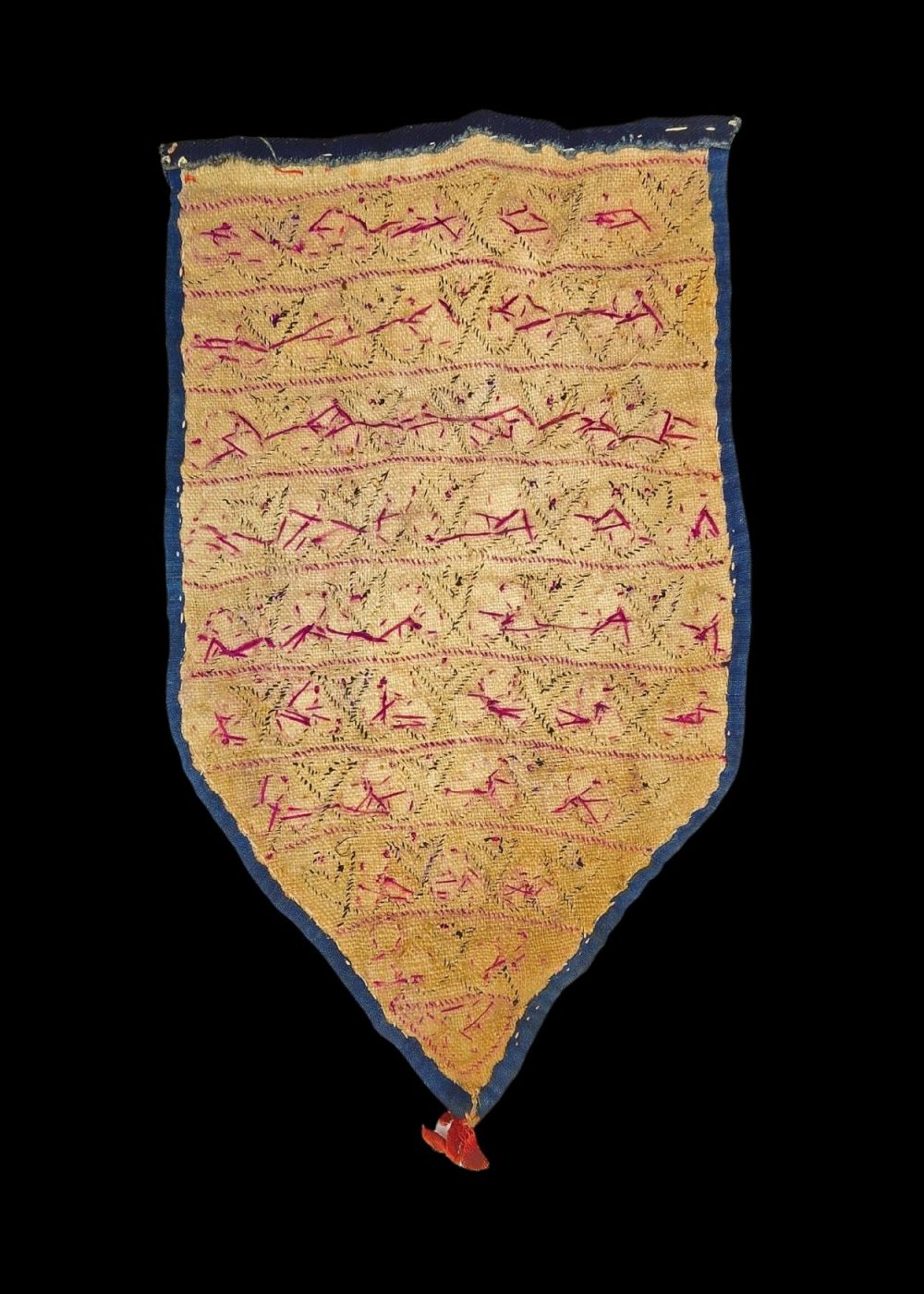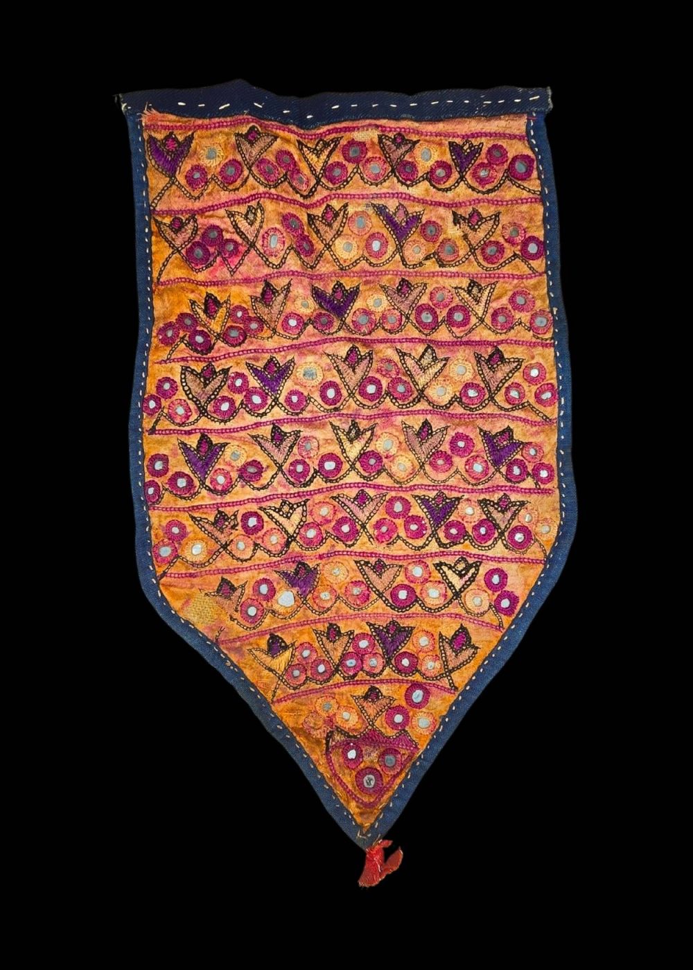 This vibrant hand-embroidered toran from Gujarat features intricate floral motifs in bright hues of pink, purple, and blue, with detailed stitching outlining the design. The colorful patterns are arranged in horizontal bands, showcasing a traditional style of embroidery known for its rich texture and meticulous craftsmanship. The border of the toran is finished with a dark blue fabric, complemented by a decorative red tassel at the bottom. This piece likely serves as both a decorative and symbolic item, often used to adorn doorways during celebrations or festive occasions.