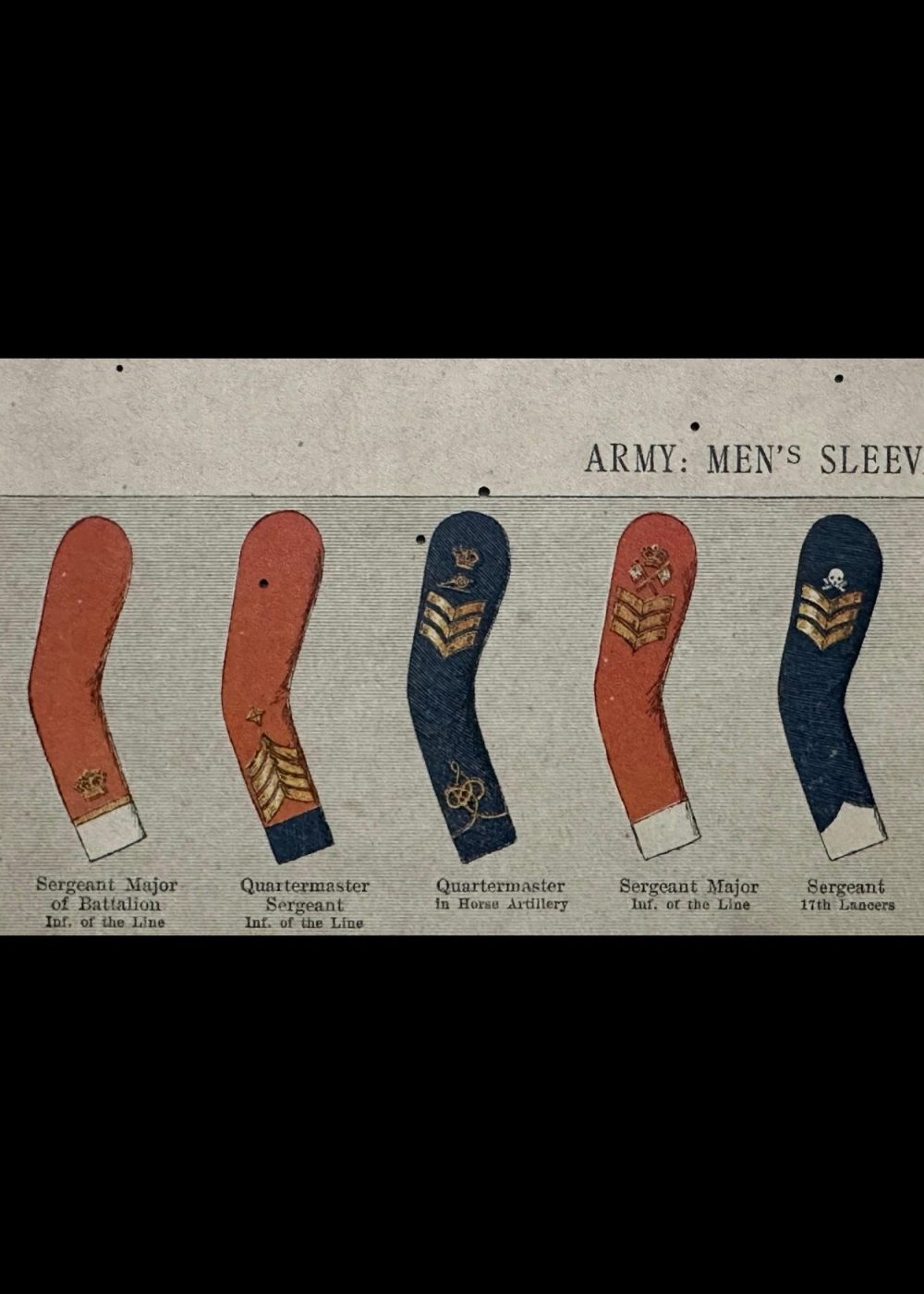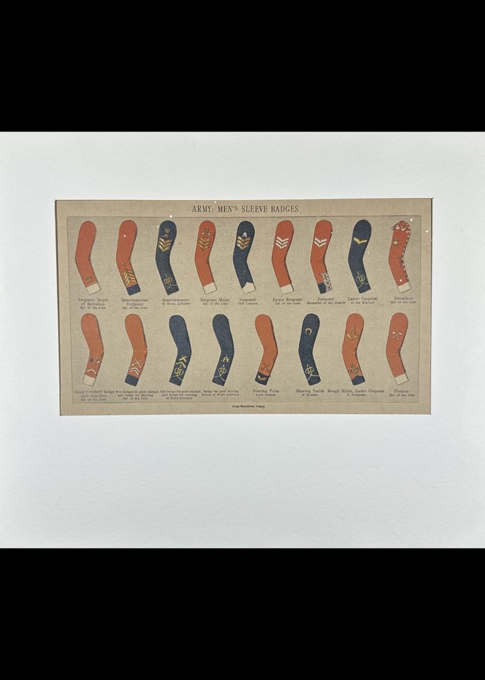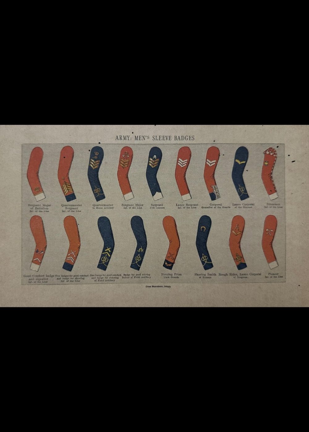 This detailed reference chart displays the sleeve insignia worn by British Army enlisted men in the 19th century. It includes badges for various ranks and roles such as Sergeant Major, Quartermaster, Corporal, Drummer, and Pioneer, as well as special distinctions like Good Conduct stripes and trade-specific emblems (e.g., Shoeing Smith, Rough Rider). Each badge is shown on the appropriate sleeve color according to the regiment, illustrating the variety of uniforms and the visual system of rank and trade identification in the Victorian-era British Army.