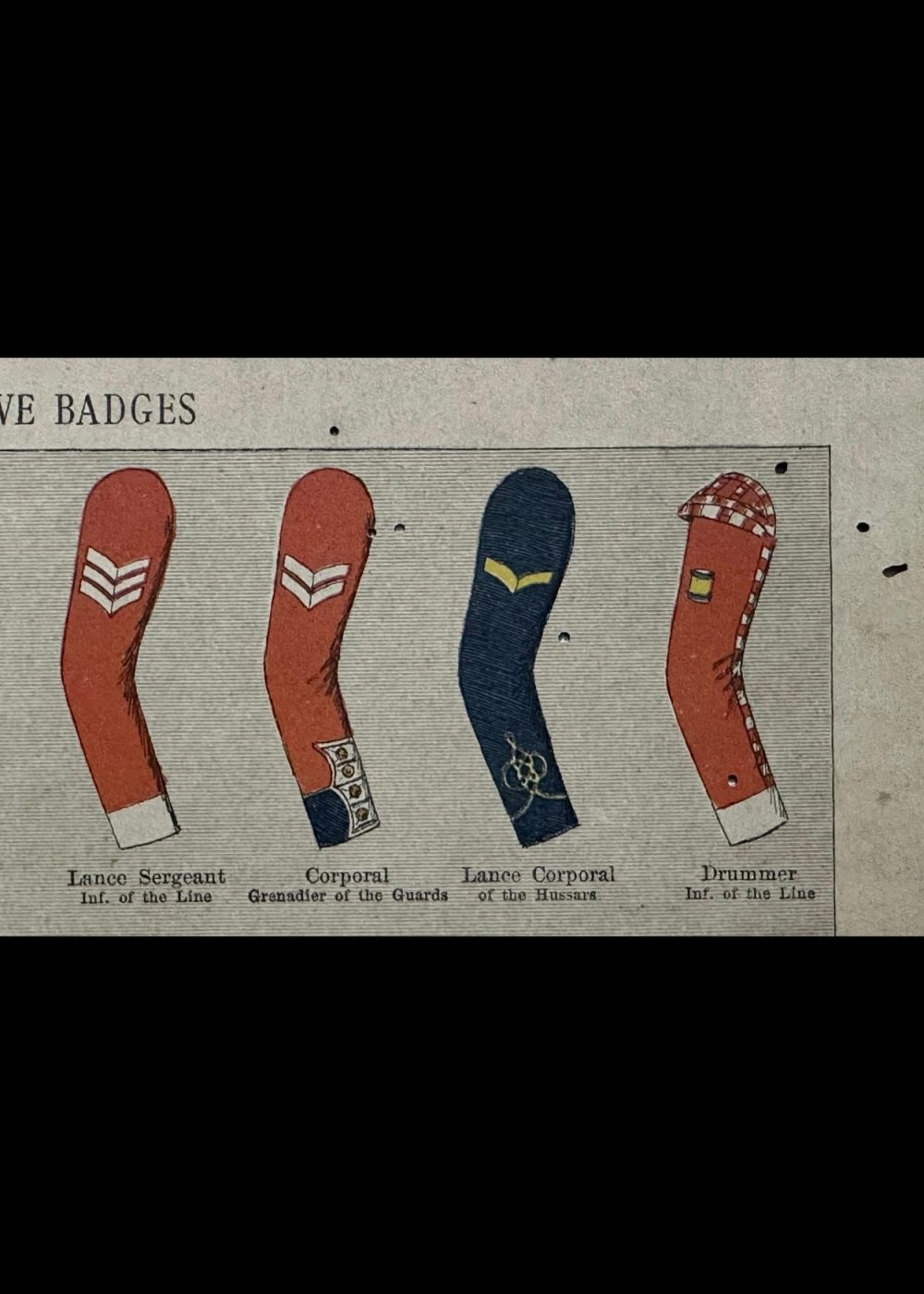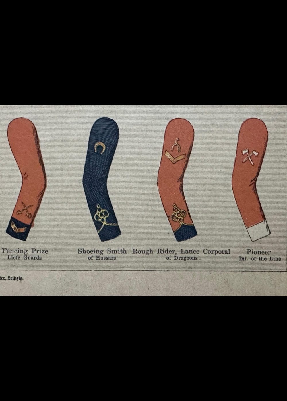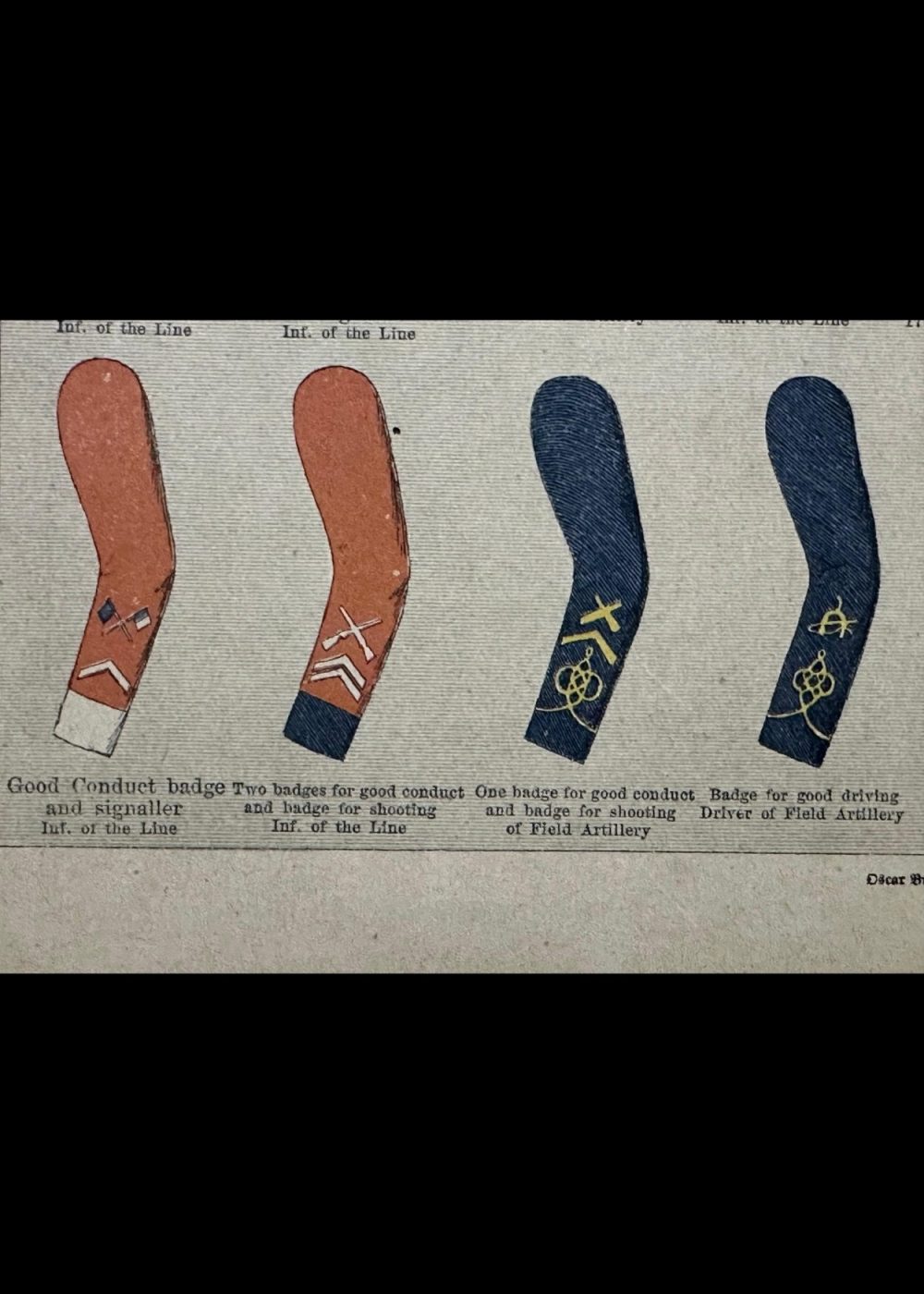 This detailed reference chart displays the sleeve insignia worn by British Army enlisted men in the 19th century. It includes badges for various ranks and roles such as Sergeant Major, Quartermaster, Corporal, Drummer, and Pioneer, as well as special distinctions like Good Conduct stripes and trade-specific emblems (e.g., Shoeing Smith, Rough Rider). Each badge is shown on the appropriate sleeve color according to the regiment, illustrating the variety of uniforms and the visual system of rank and trade identification in the Victorian-era British Army.