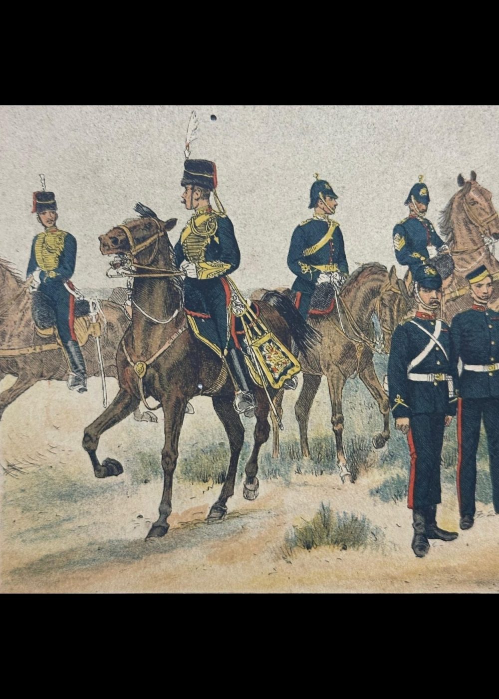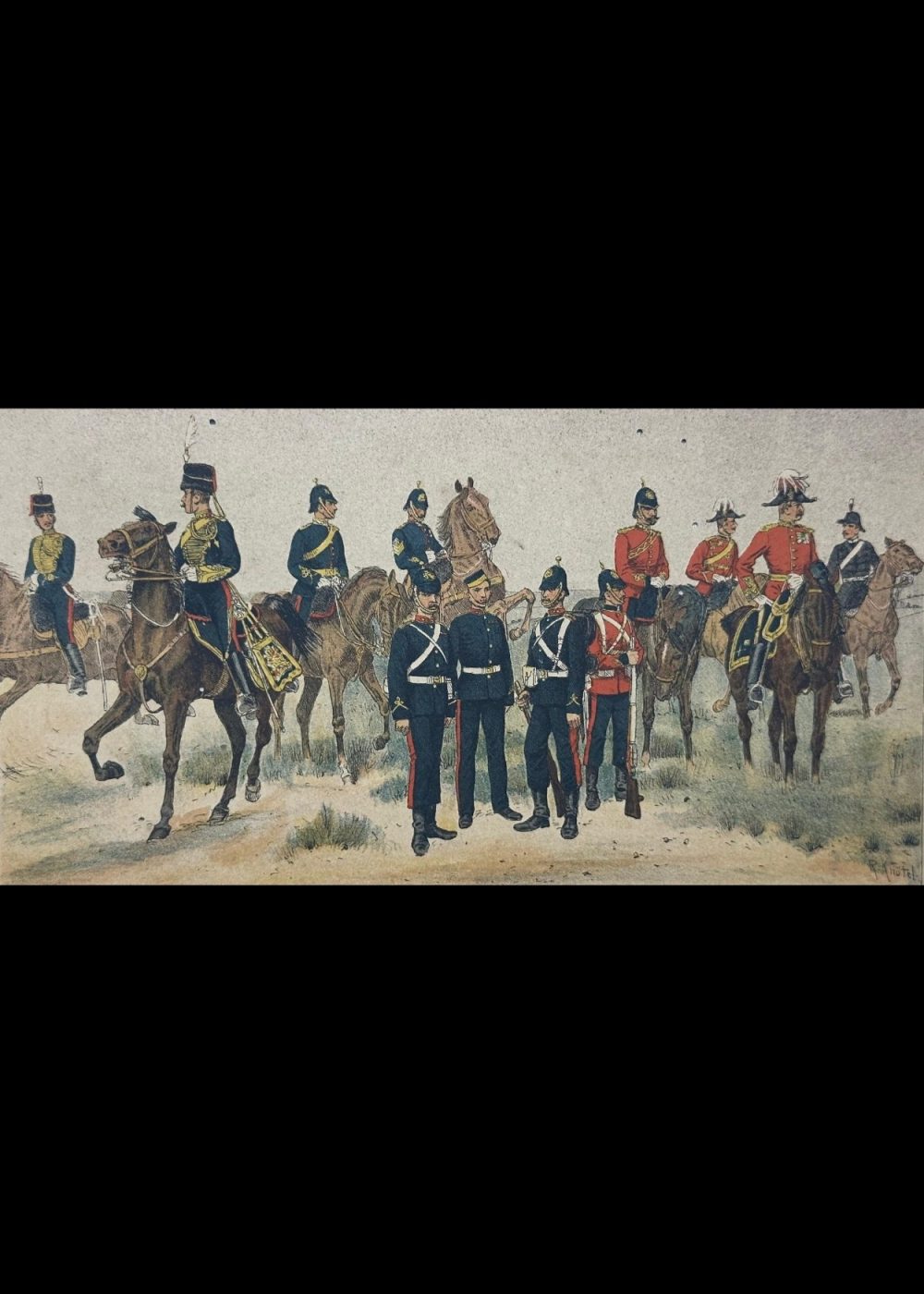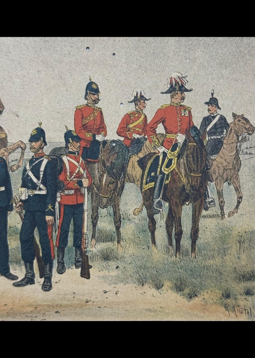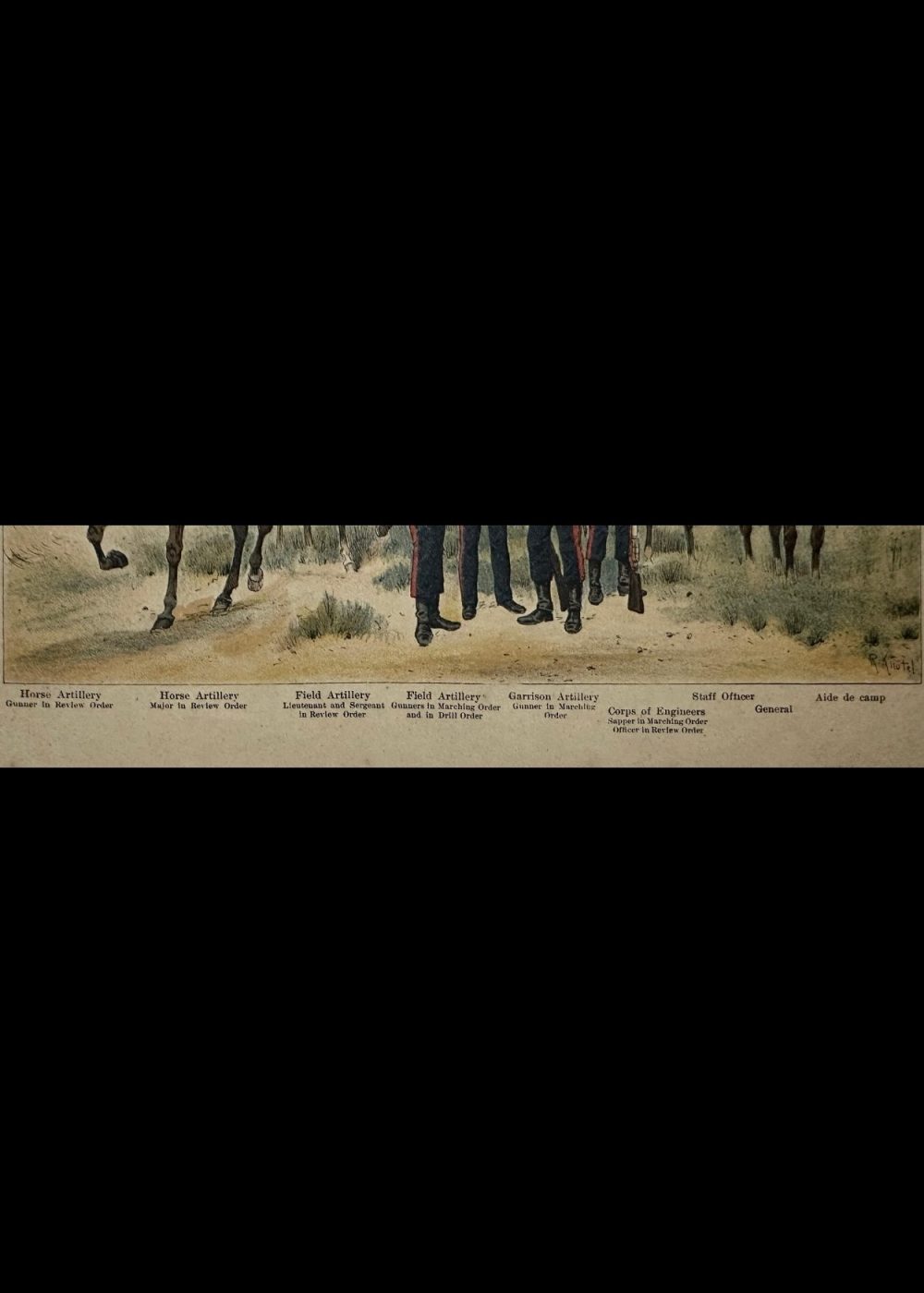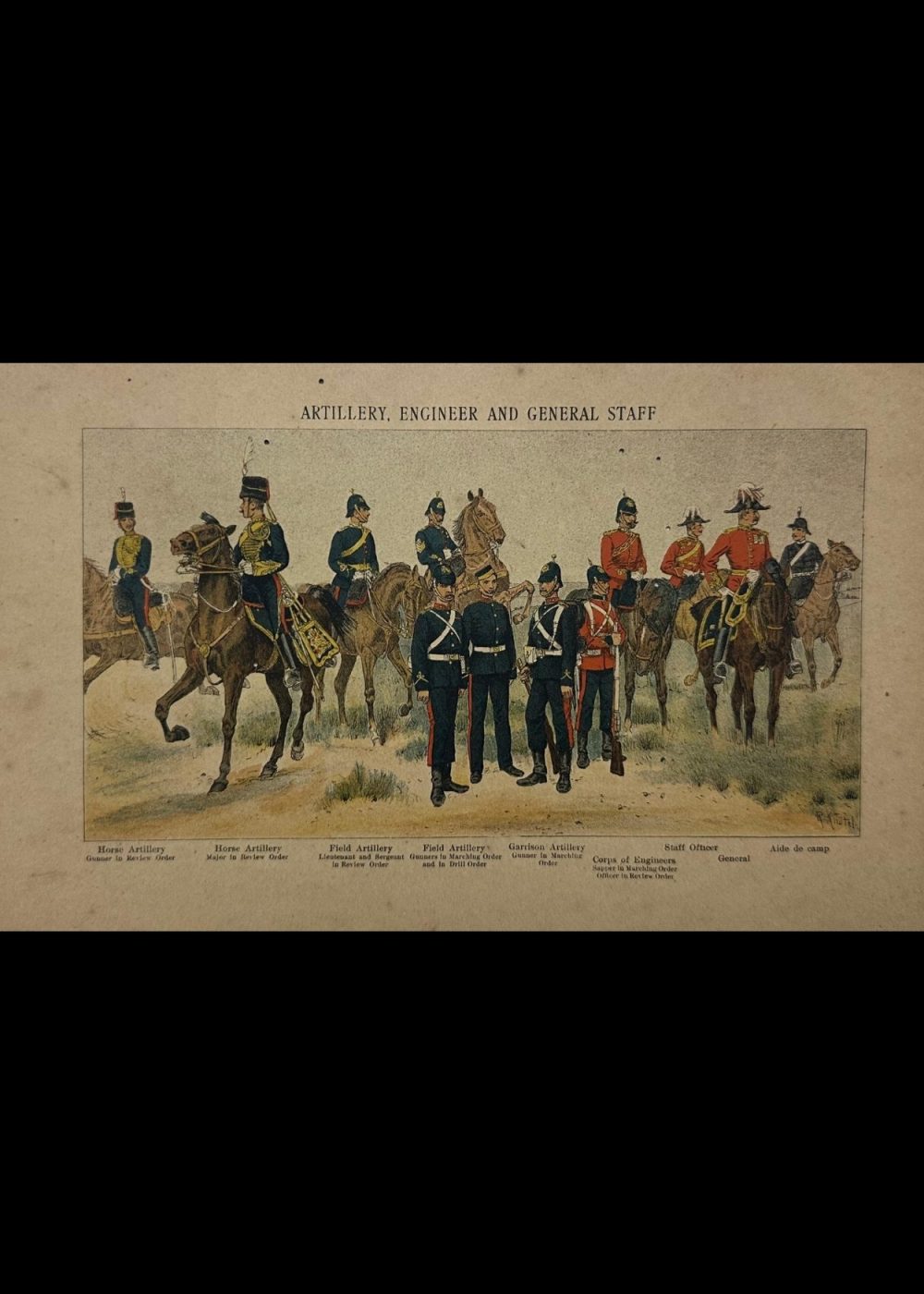 This vintage illustration presents the diverse uniforms of the British Army’s artillery units, engineers, and general staff officers. The foreground features officers from the Royal Artillery and Royal Engineers in dark blue uniforms, while the background displays mounted staff officers in varying ceremonial attire, including red and gold tunics with plumed helmets. The composition highlights the distinct roles and formal dress of these specialized military branches during the late 19th to early 20th century, showcasing the discipline, structure, and hierarchical elegance of the British Army’s support and command divisions.