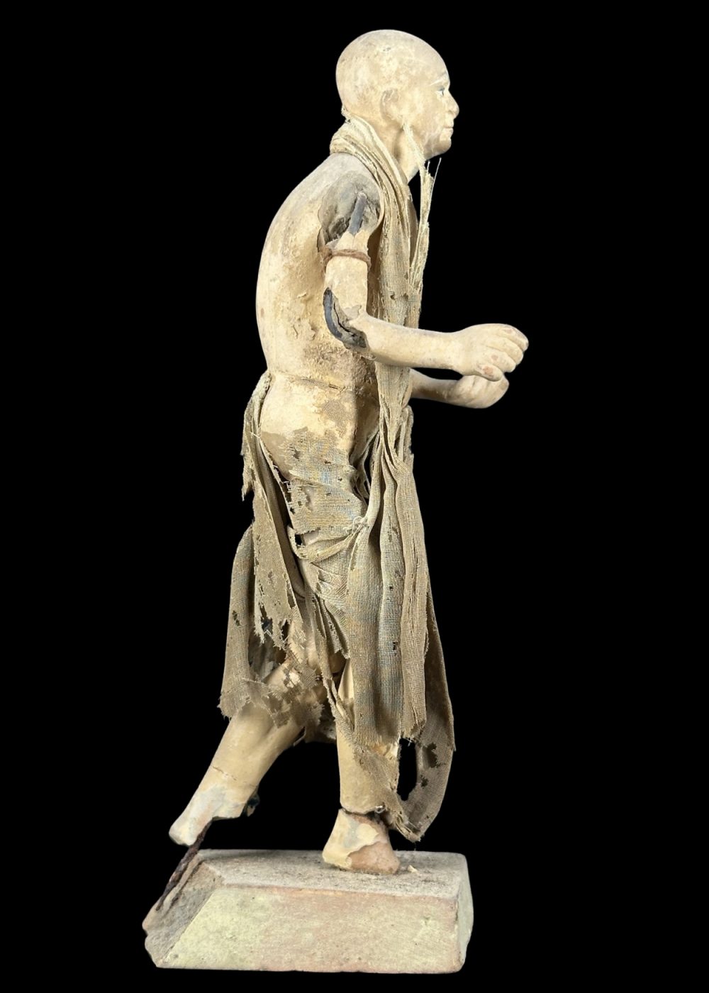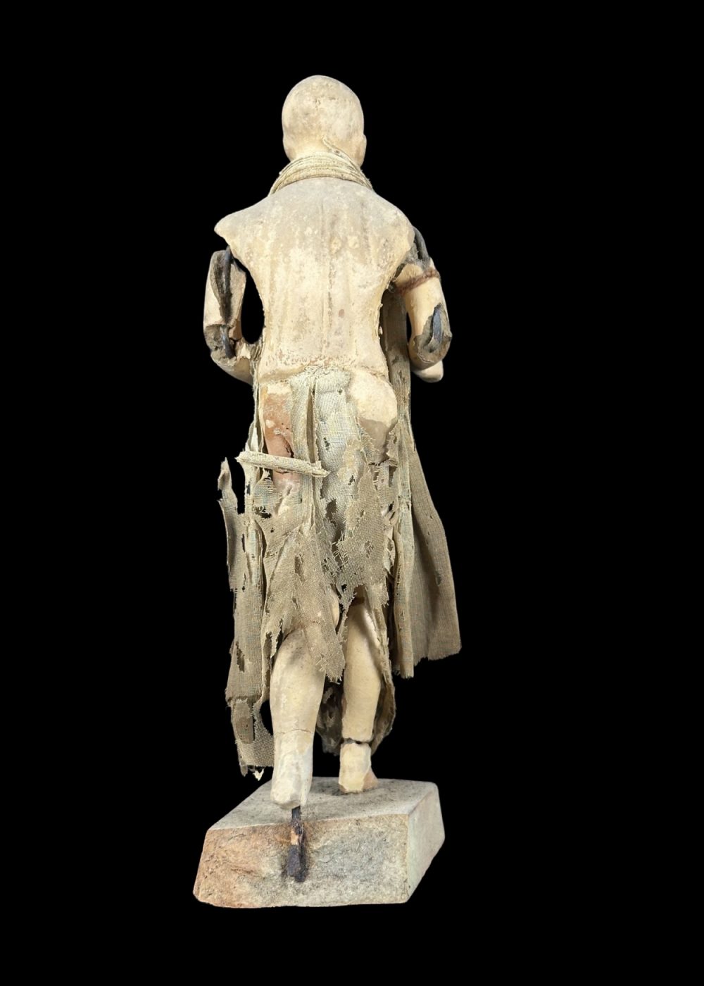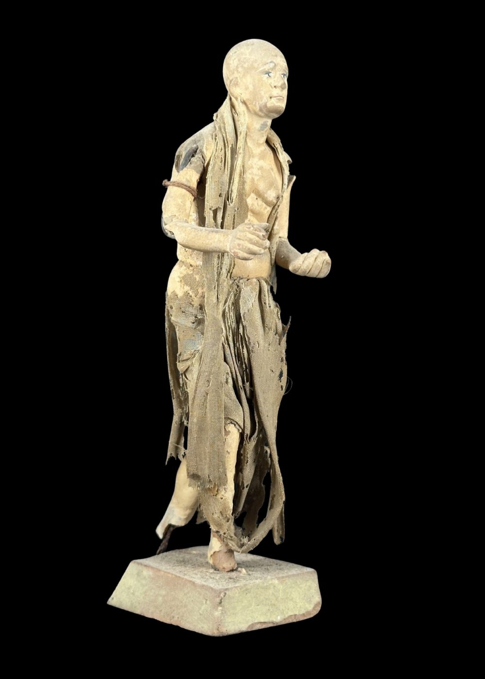 This figurine represents an ascetic or spiritual seeker, clad in tattered, earth-toned robes that emphasize renunciation and simplicity. With a bare torso, calm expression, and a purposeful stance, the figure embodies the ideals of detachment and spiritual pursuit. The worn garments and minimal adornment reflect a life dedicated to devotion, austerity, and the quest for inner peace—a common theme in many Indian religious traditions, particularly within the Bhakti and monastic orders.