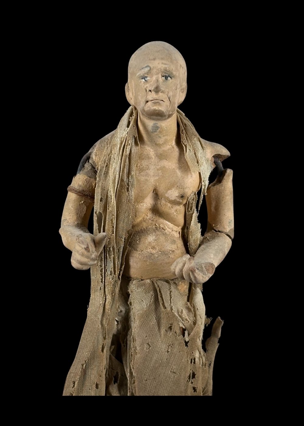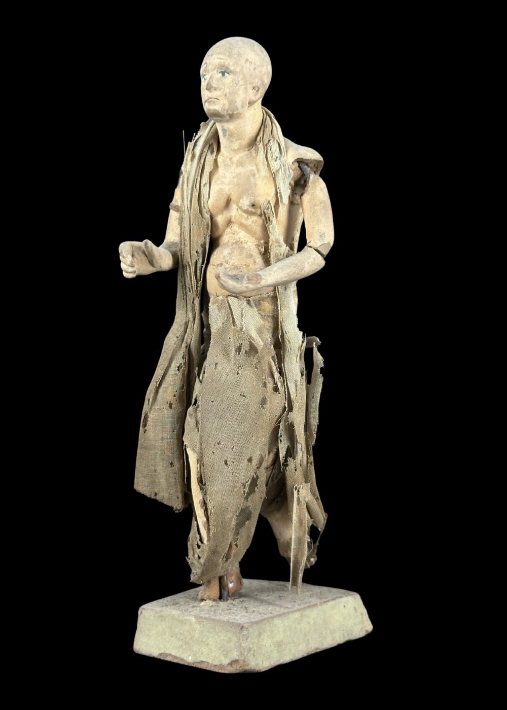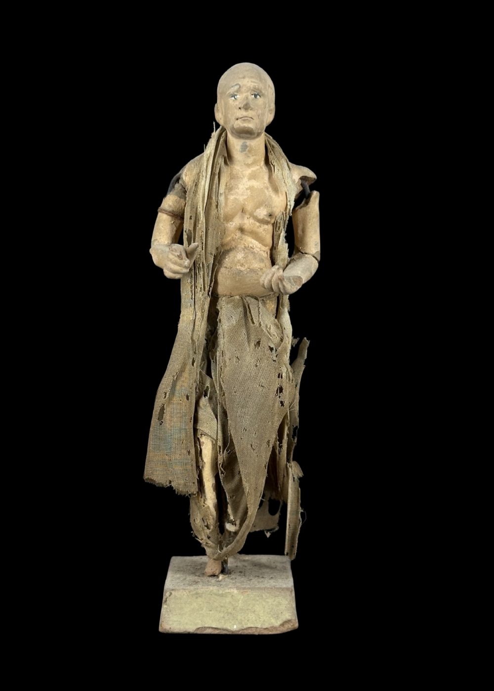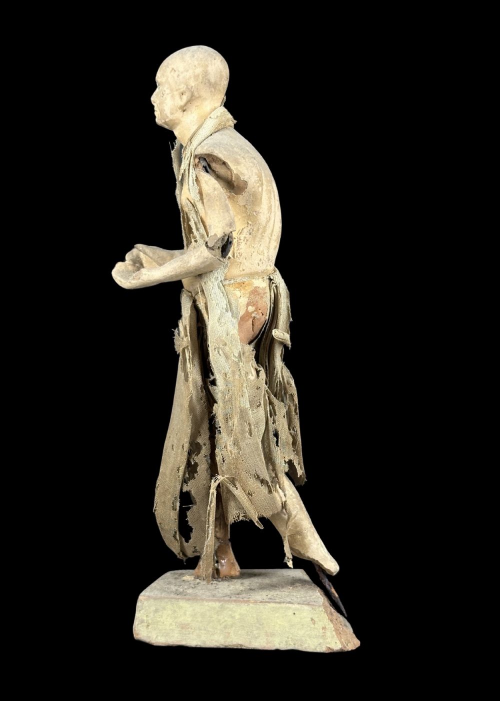 This figurine represents an ascetic or spiritual seeker, clad in tattered, earth-toned robes that emphasize renunciation and simplicity. With a bare torso, calm expression, and a purposeful stance, the figure embodies the ideals of detachment and spiritual pursuit. The worn garments and minimal adornment reflect a life dedicated to devotion, austerity, and the quest for inner peace—a common theme in many Indian religious traditions, particularly within the Bhakti and monastic orders.