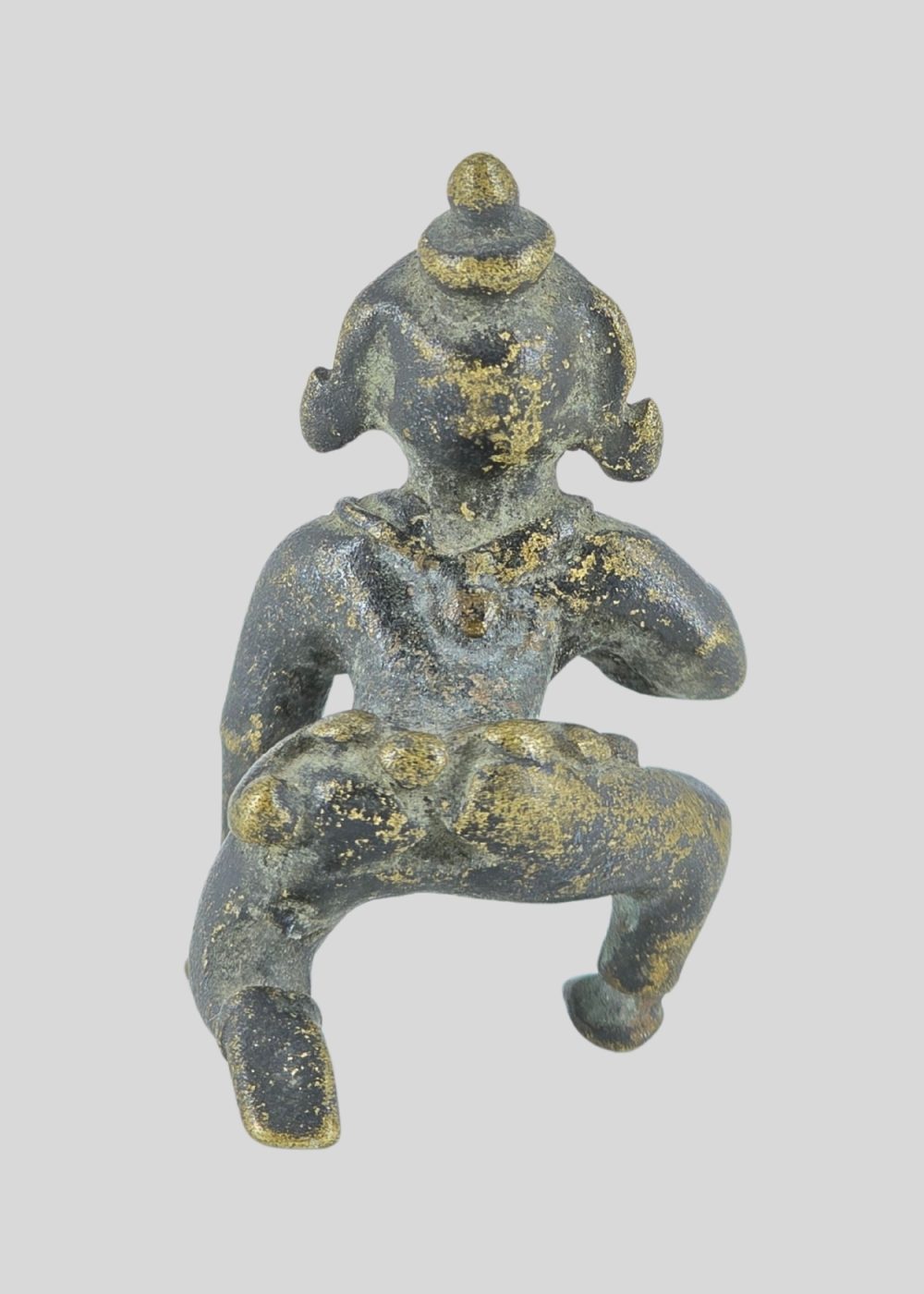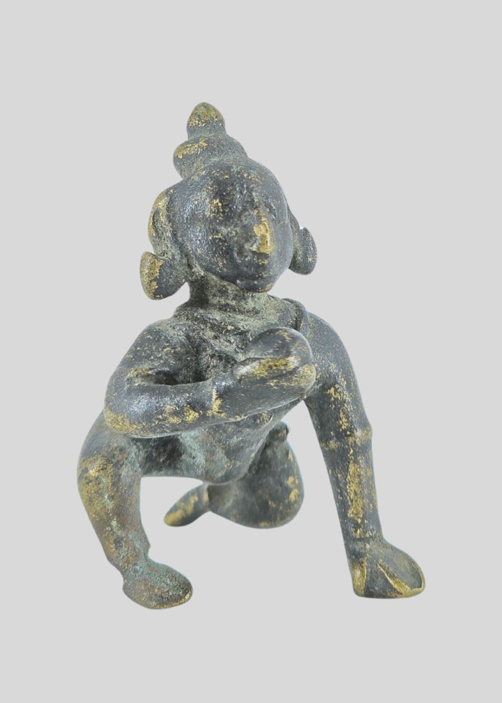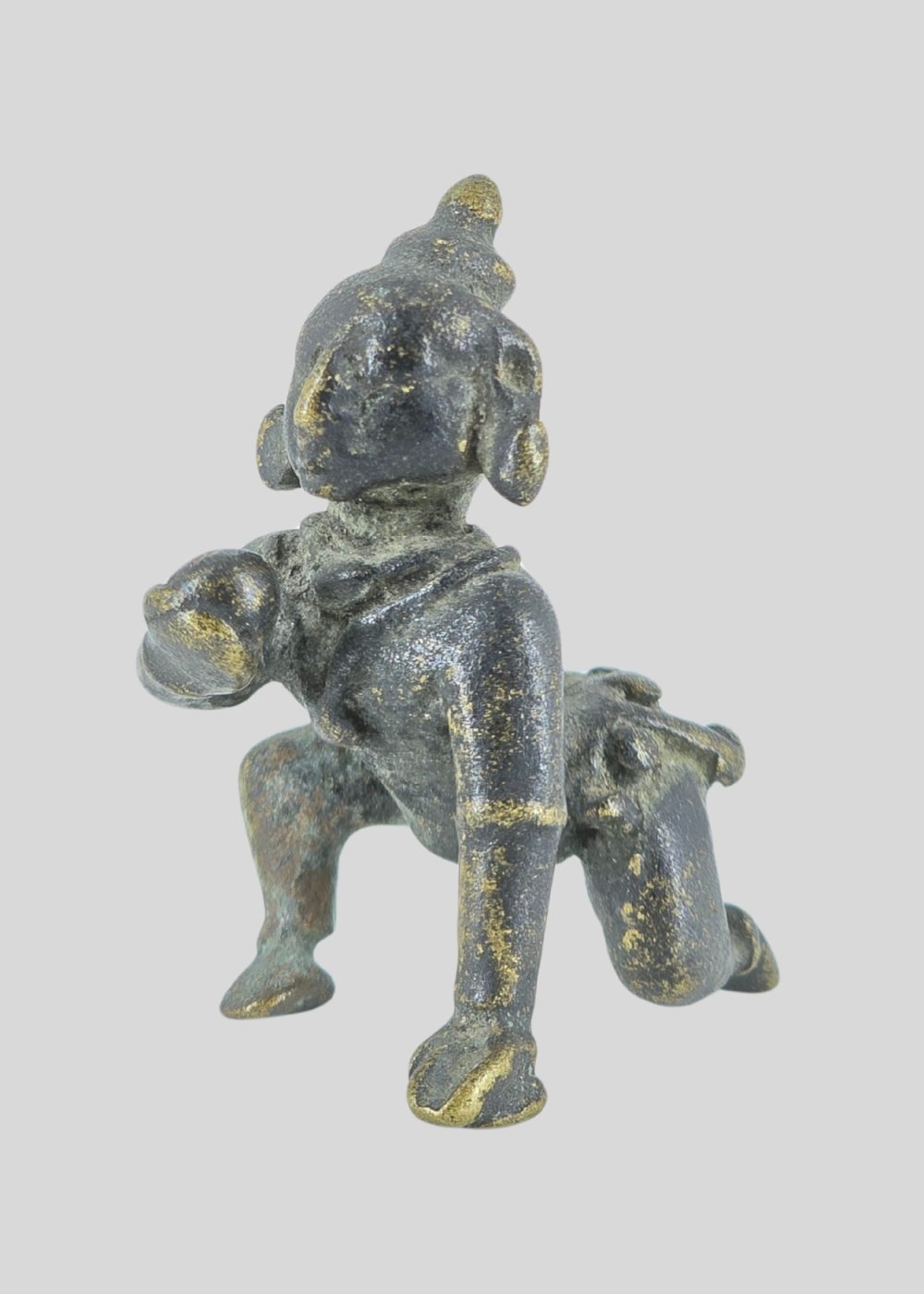 This bronze sculpture from Bengal, depicts Baby Krishna in a crawling posture, a popular iconographic form known as Balakrishna. The figure is shown with a childlike charm, symbolizing innocence and divine playfulness. Crafted with simplicity yet expressive detailing, this piece reflects the devotional art of Bengal, where images of Krishna as a child were cherished for household worship.