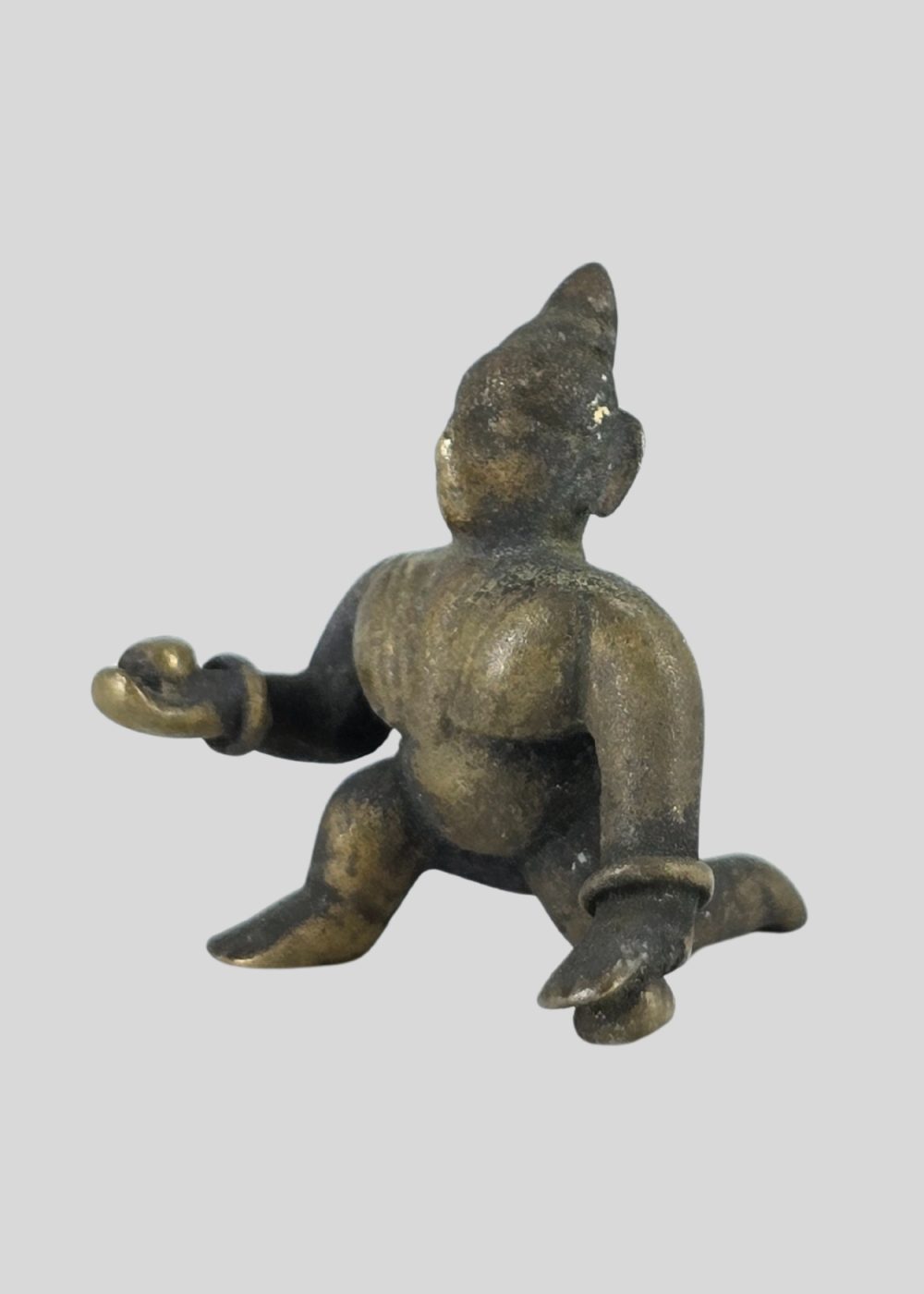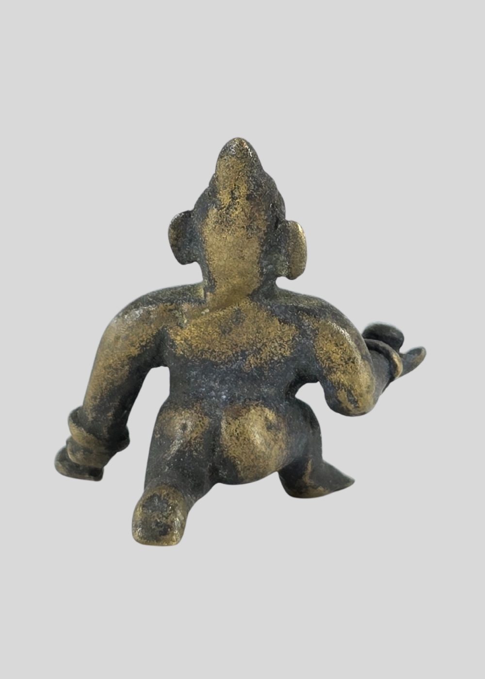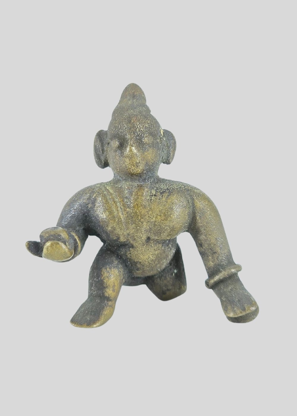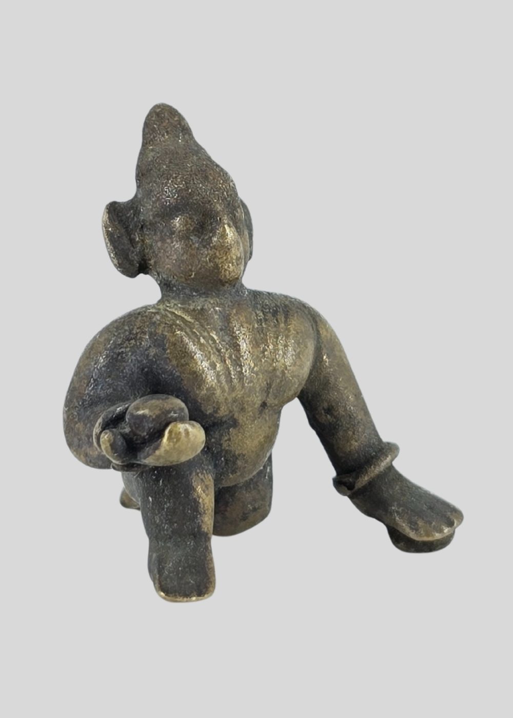 This bronze from Gujarat depicts Baby Krishna in a crawling posture, a beloved form known as Bal Gopal or Crawling Krishna. The figure shows Krishna with a topknot and adorned with simple ornaments, symbolizing innocence and divine playfulness. Such bronzes were cherished in domestic shrines, embodying devotion and maternal affection towards the child-god.