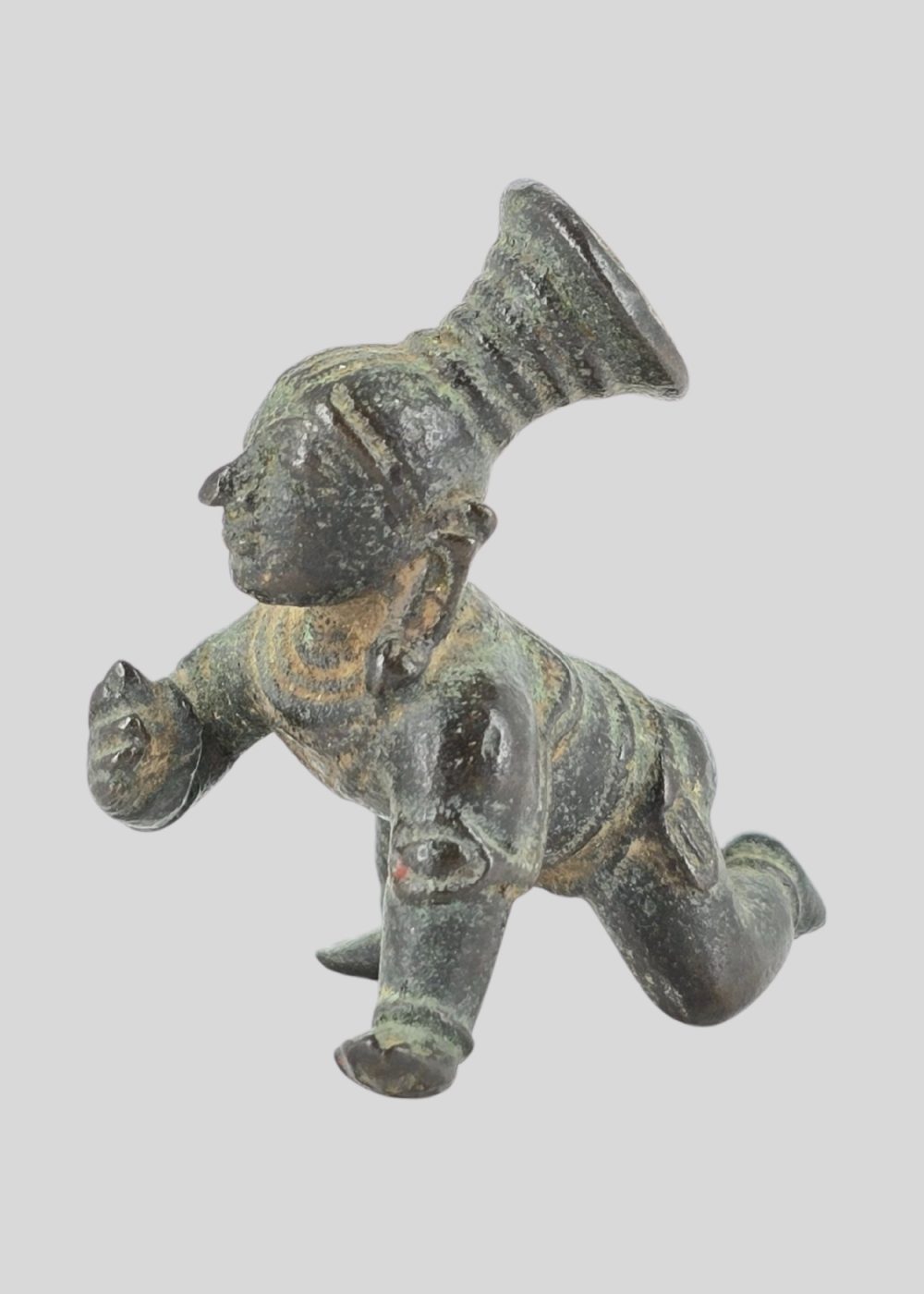 Bronze sculpture of Baby Krishna in a crawling posture, one hand reaching forward and the other supporting his movement—an iconic pose known as navanita nritya murti, symbolizing his playful theft of butter. The figure is adorned with a delicate headdress, modest jewelry, and a waist string of bells, enhancing the sense of motion and childhood charm. Crafted using the lost-wax casting technique, this Chola-period piece exemplifies the dynasty’s mastery in rendering divine figures with lifelike grace and devotional intimacy. Such images were central to temple rituals and processions, celebrating Krishna’s mischievous yet divine nature as a beloved child-god.