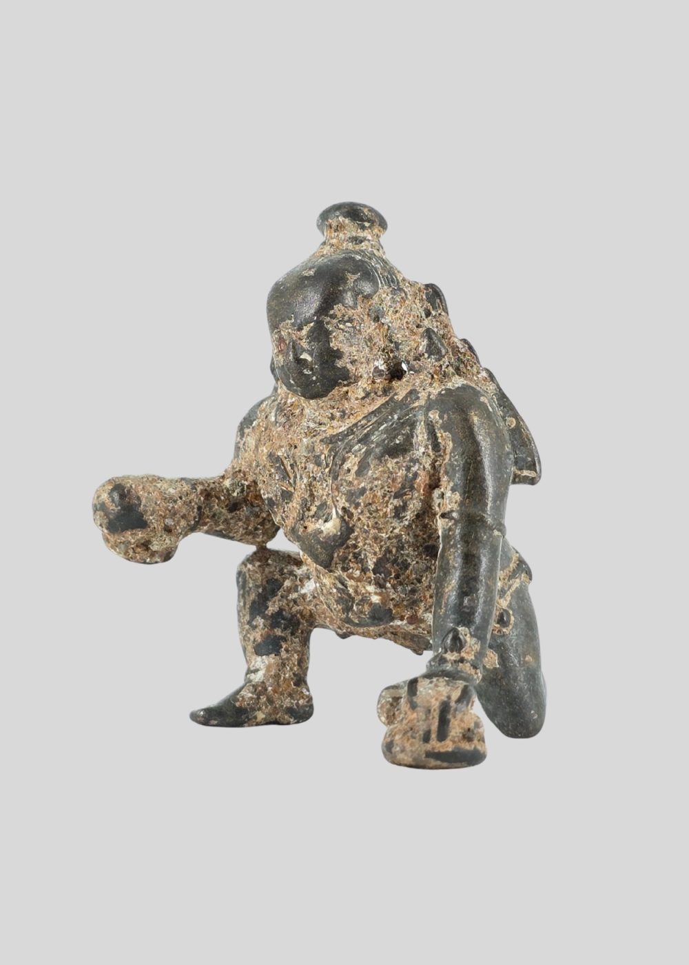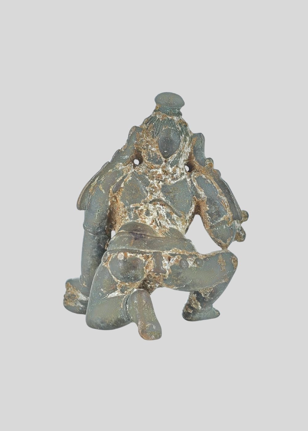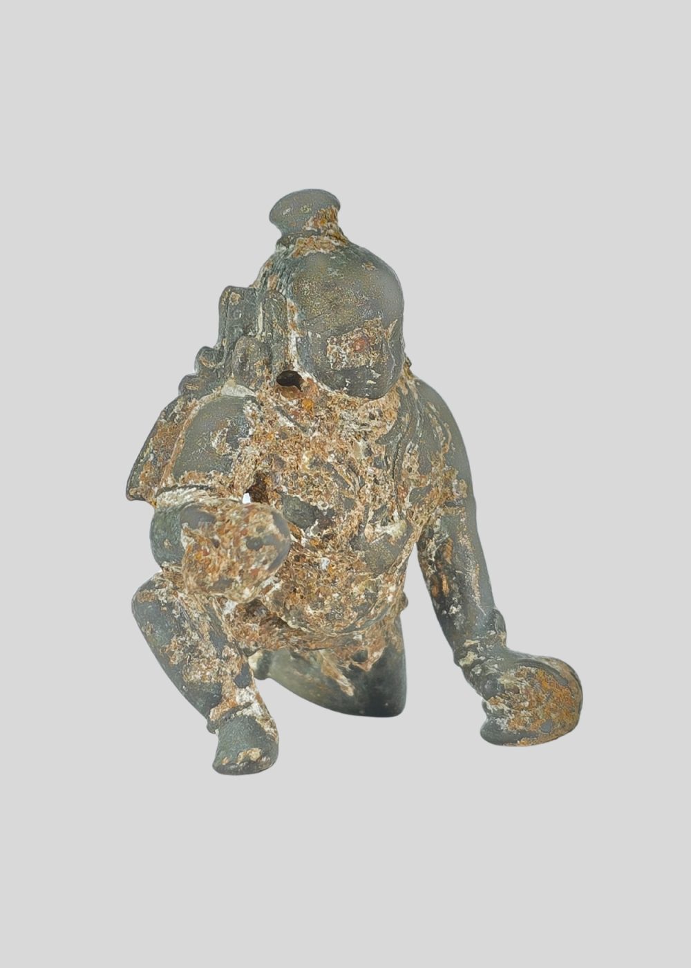 Bronze sculpture of Baby Krishna in a crawling posture, one hand reaching forward and the other supporting his movement—an iconic pose known as navanita nritya murti, symbolizing his playful theft of butter. The figure is adorned with a delicate headdress, modest jewelry, and a waist string of bells, enhancing the sense of motion and childhood charm. Crafted using the lost-wax casting technique, this Chola-period piece exemplifies the dynasty’s mastery in rendering divine figures with lifelike grace and devotional intimacy. Such images were central to temple rituals and processions, celebrating Krishna’s mischievous yet divine nature as a beloved child-god