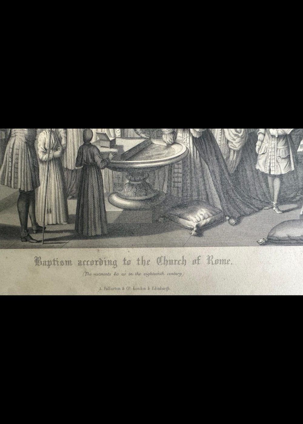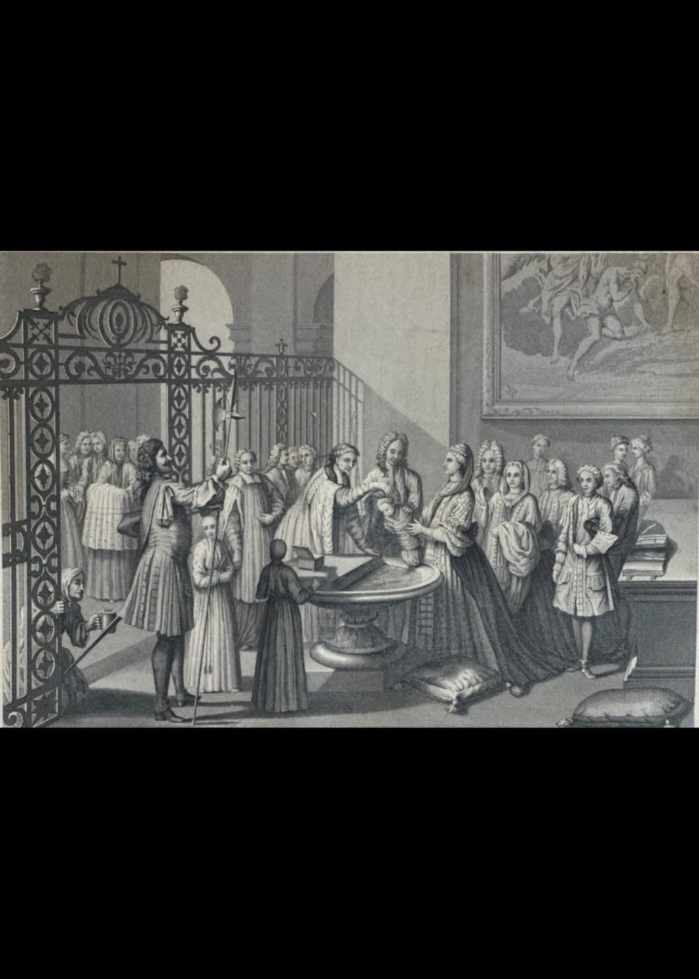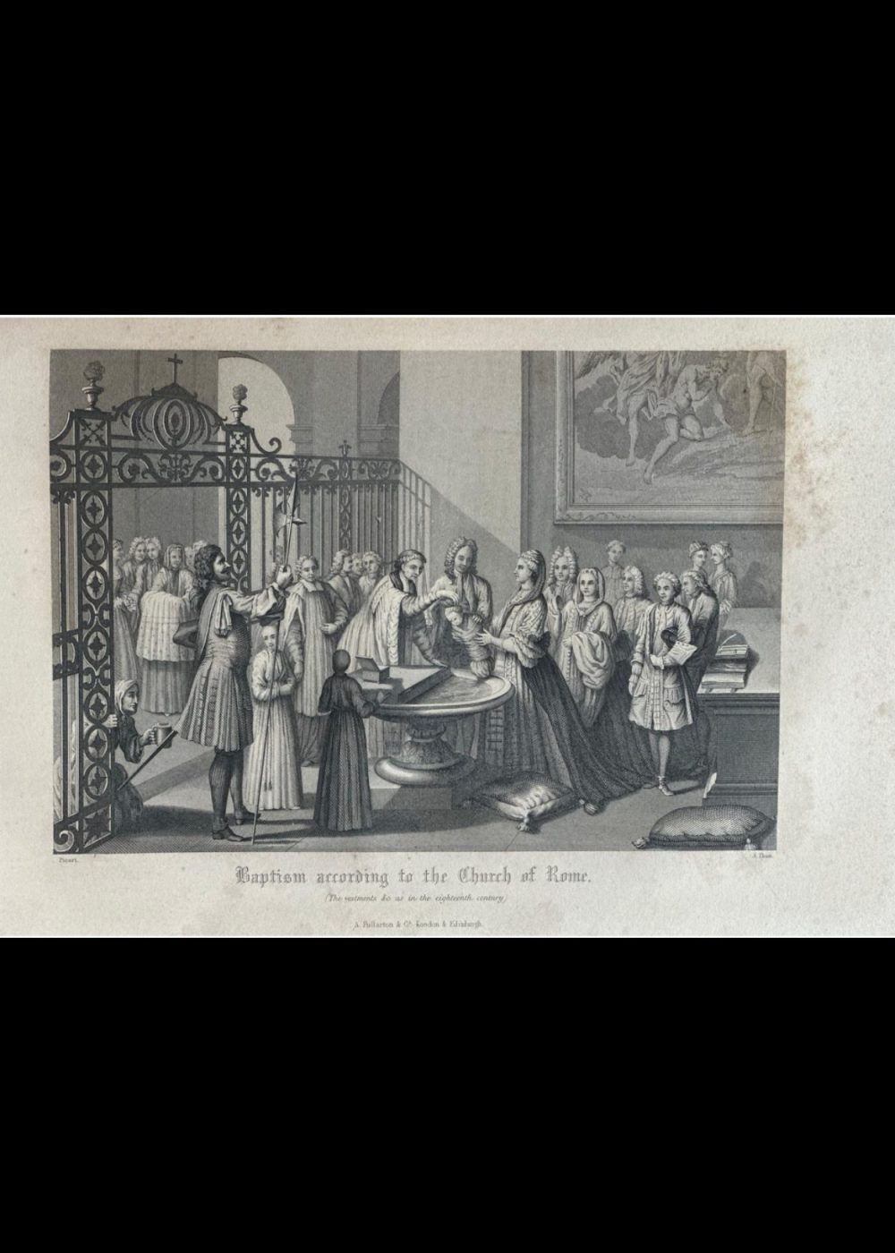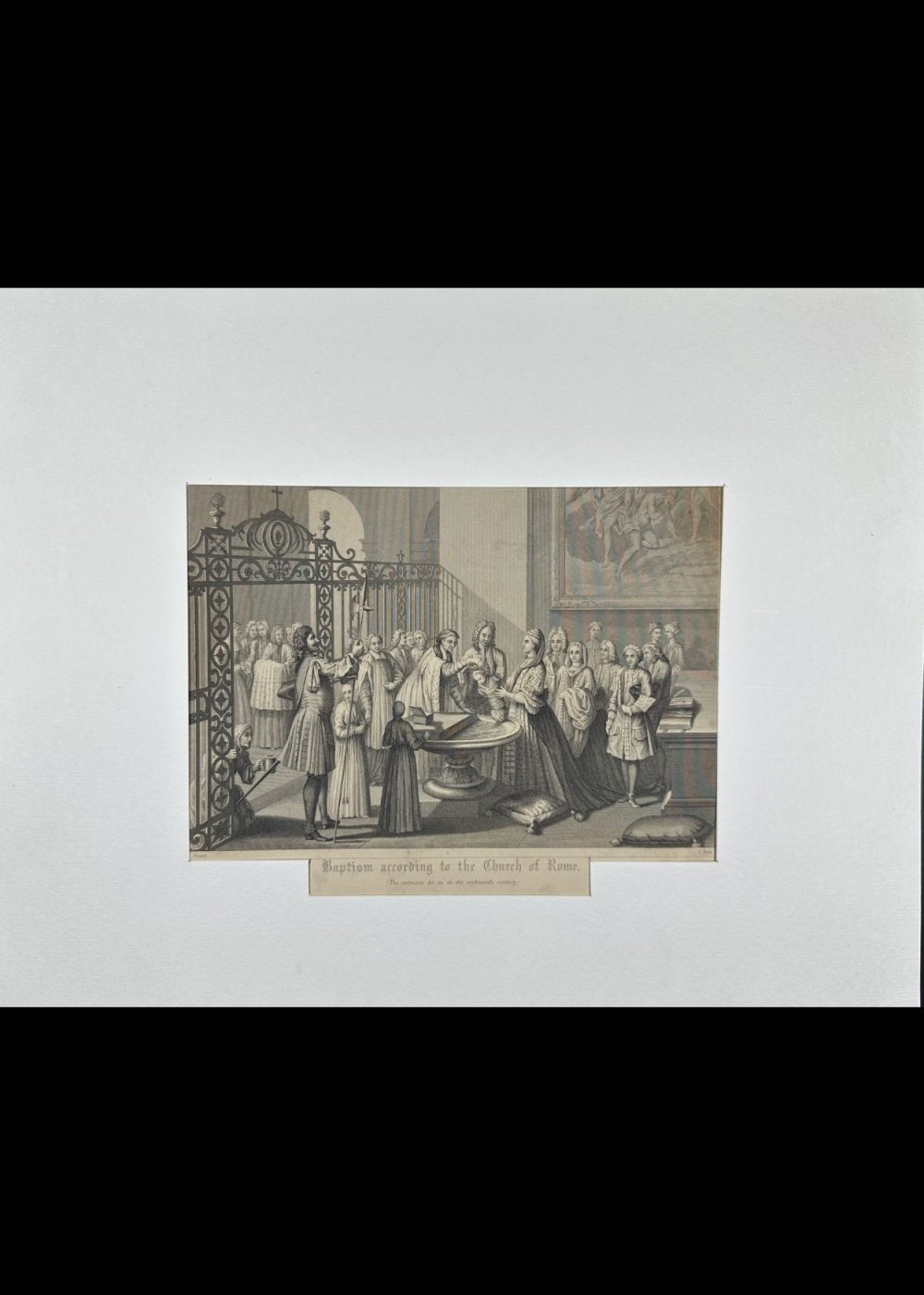 “THE FAITHS IN THE WORLD”. A dictionary of all religions and their religious sects. by The Rev. James Gardner. This engraving portrays a baptism ceremony as practiced by the Roman Catholic Church in the 18th century. Set within an ornate interior, the scene features elegantly dressed clergy and laypeople gathered around a baptismal font. A priest performs the sacrament while a woman, likely the mother or godmother, holds the infant. The intricate wrought-iron gate, religious imagery, and formal attire reflect the ceremonial grandeur and ritual precision characteristic of Catholic rites during this period.