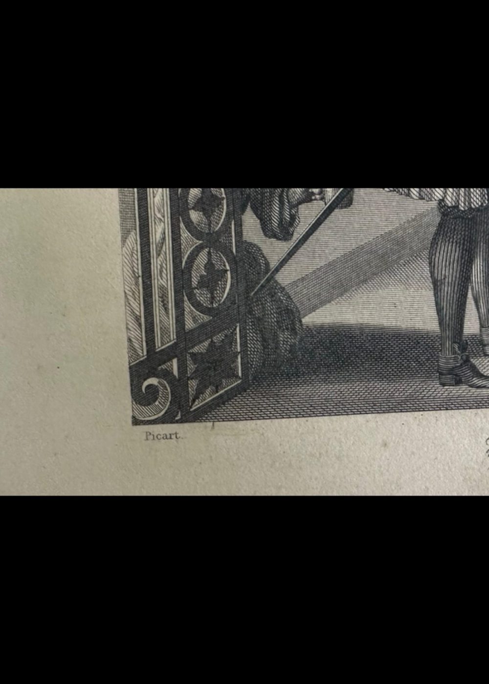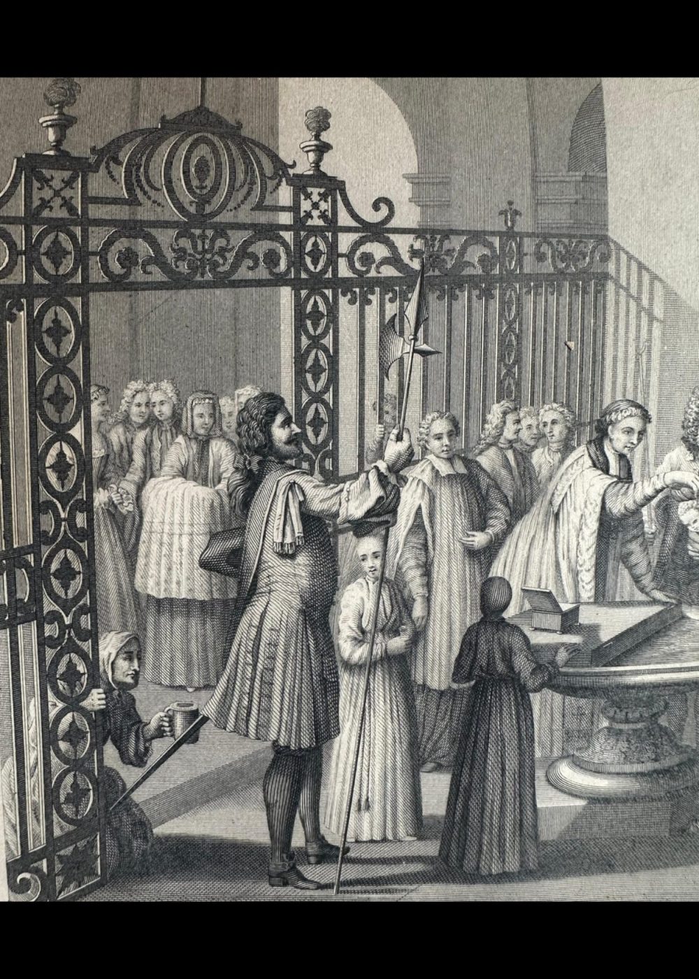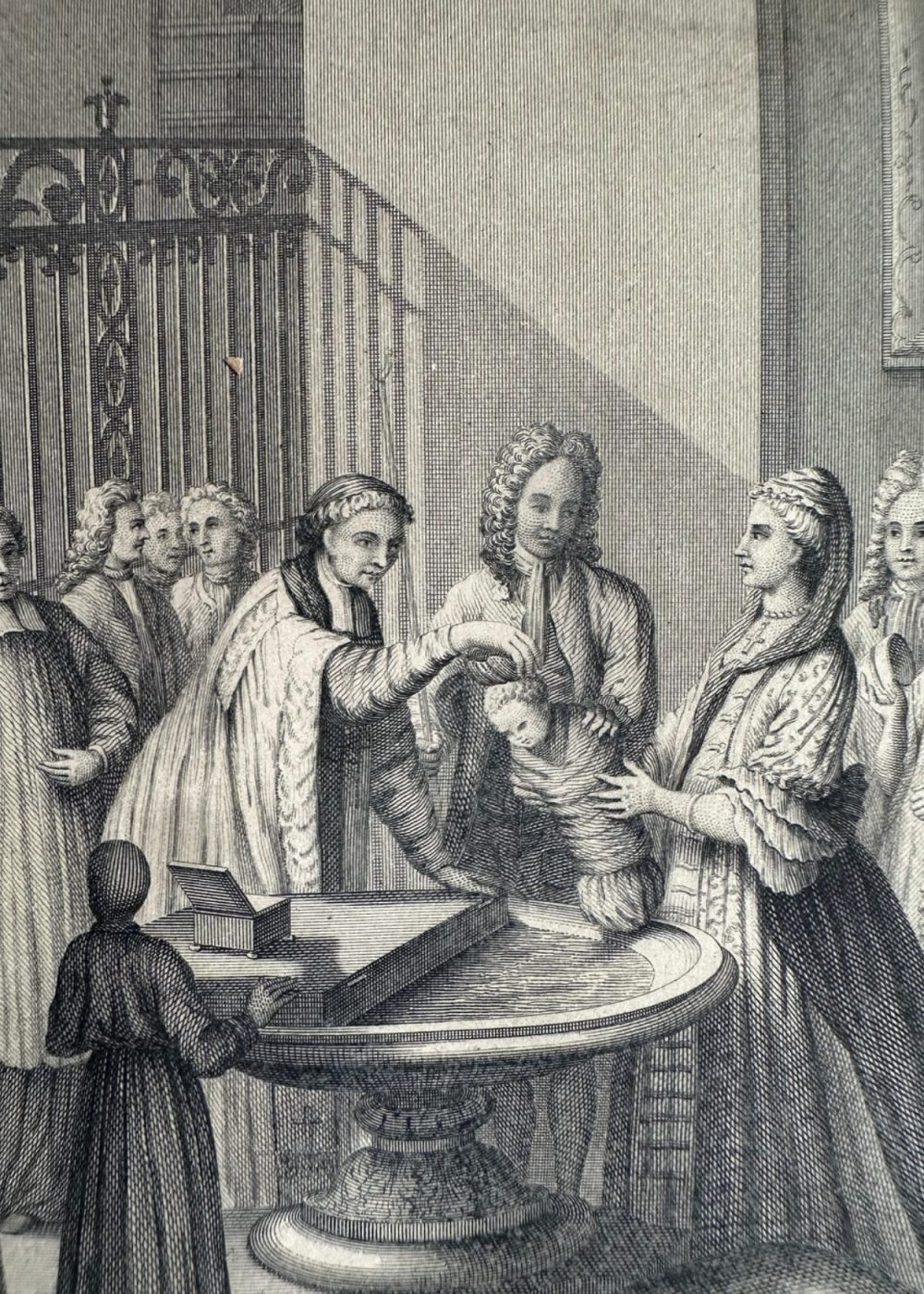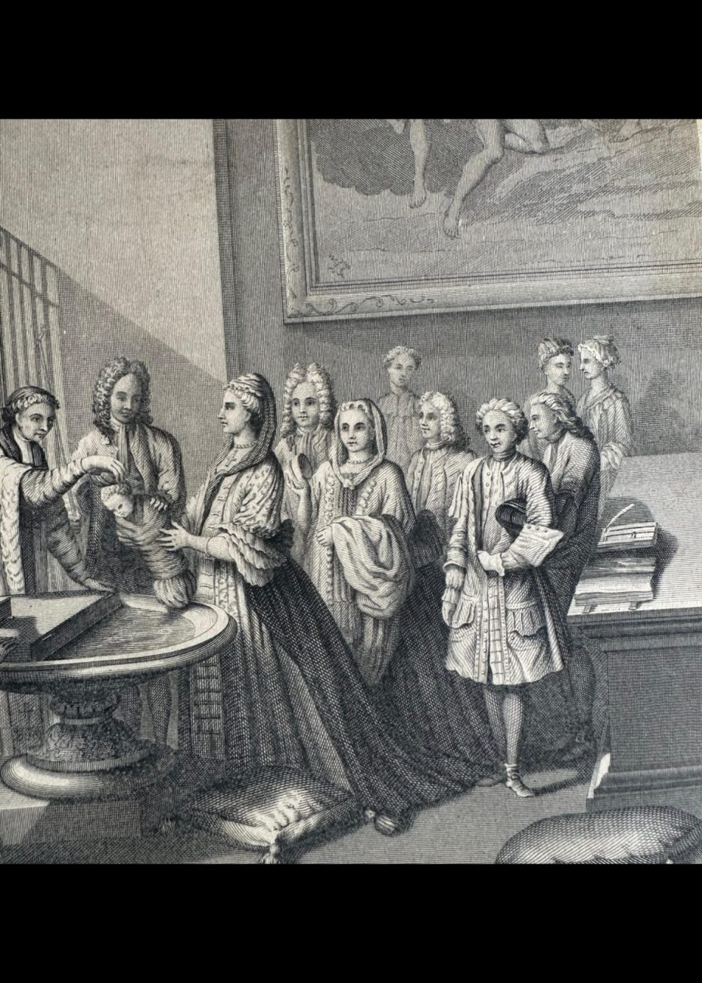 “THE FAITHS IN THE WORLD”. A dictionary of all religions and their religious sects. by The Rev. James Gardner. This engraving portrays a baptism ceremony as practiced by the Roman Catholic Church in the 18th century. Set within an ornate interior, the scene features elegantly dressed clergy and laypeople gathered around a baptismal font. A priest performs the sacrament while a woman, likely the mother or godmother, holds the infant. The intricate wrought-iron gate, religious imagery, and formal attire reflect the ceremonial grandeur and ritual precision characteristic of Catholic rites during this period.