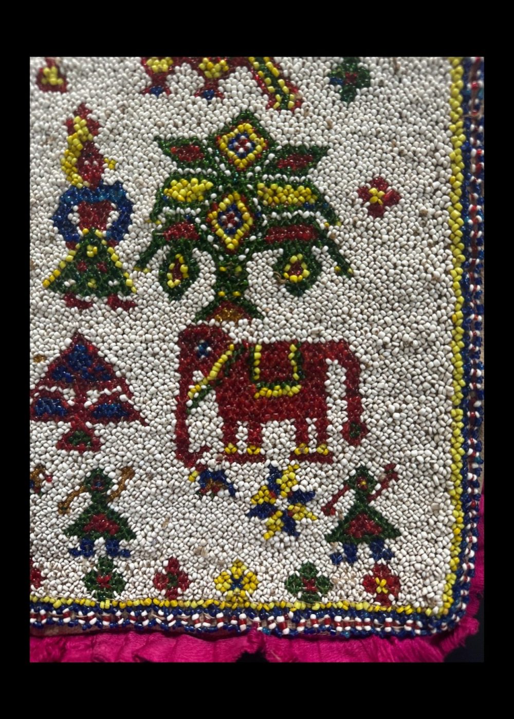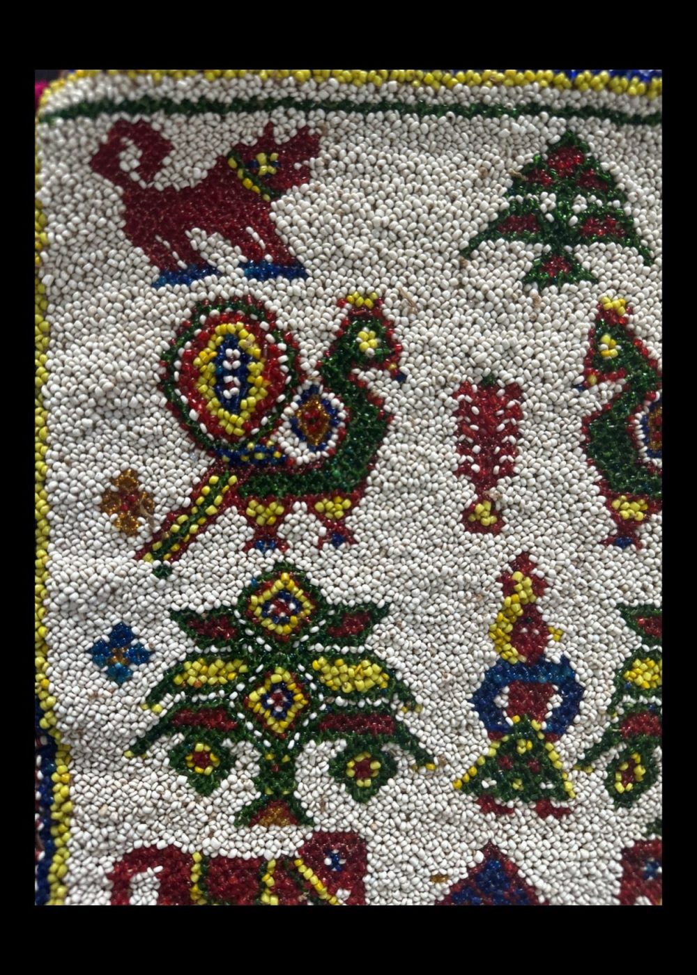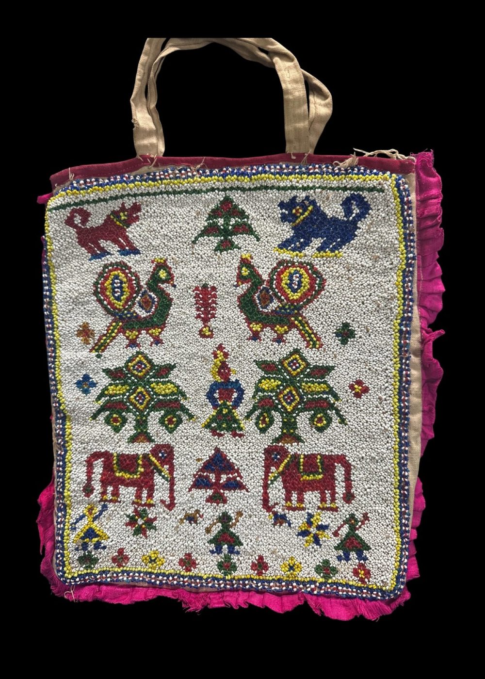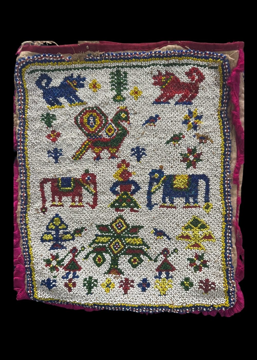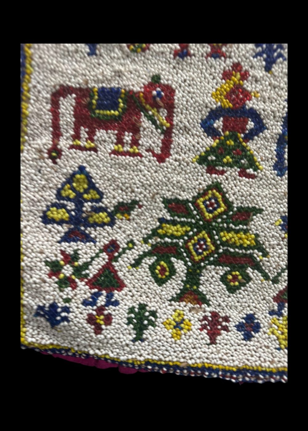 This is a vibrant handcrafted beaded artwork featured on a fabric bag. The beadwork showcases colorful depictions of animals, birds, trees, flowers, and a central human figure, all created using small, intricate beads in red, blue, yellow, green, and white. The artwork is framed with a multicolored beaded border and trimmed with pink fabric, adding to its decorative appeal. This piece reflects traditional folk artistry, symbolizing themes of nature, animals, and rural life in a celebratory and joyful style.