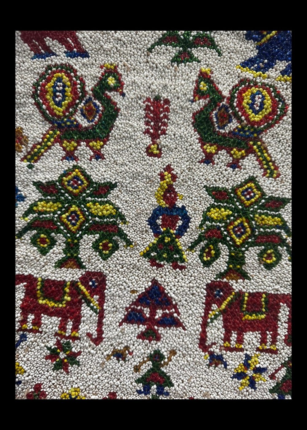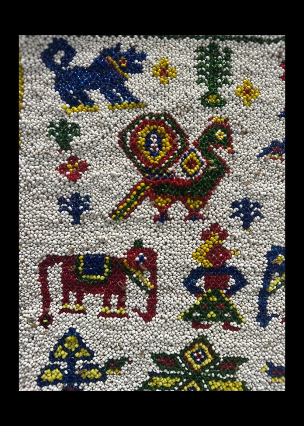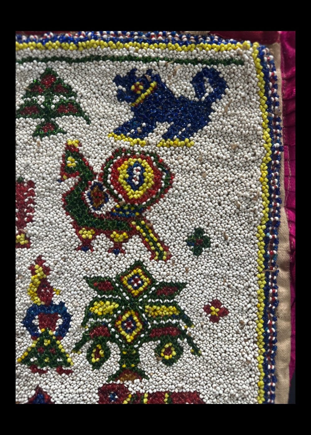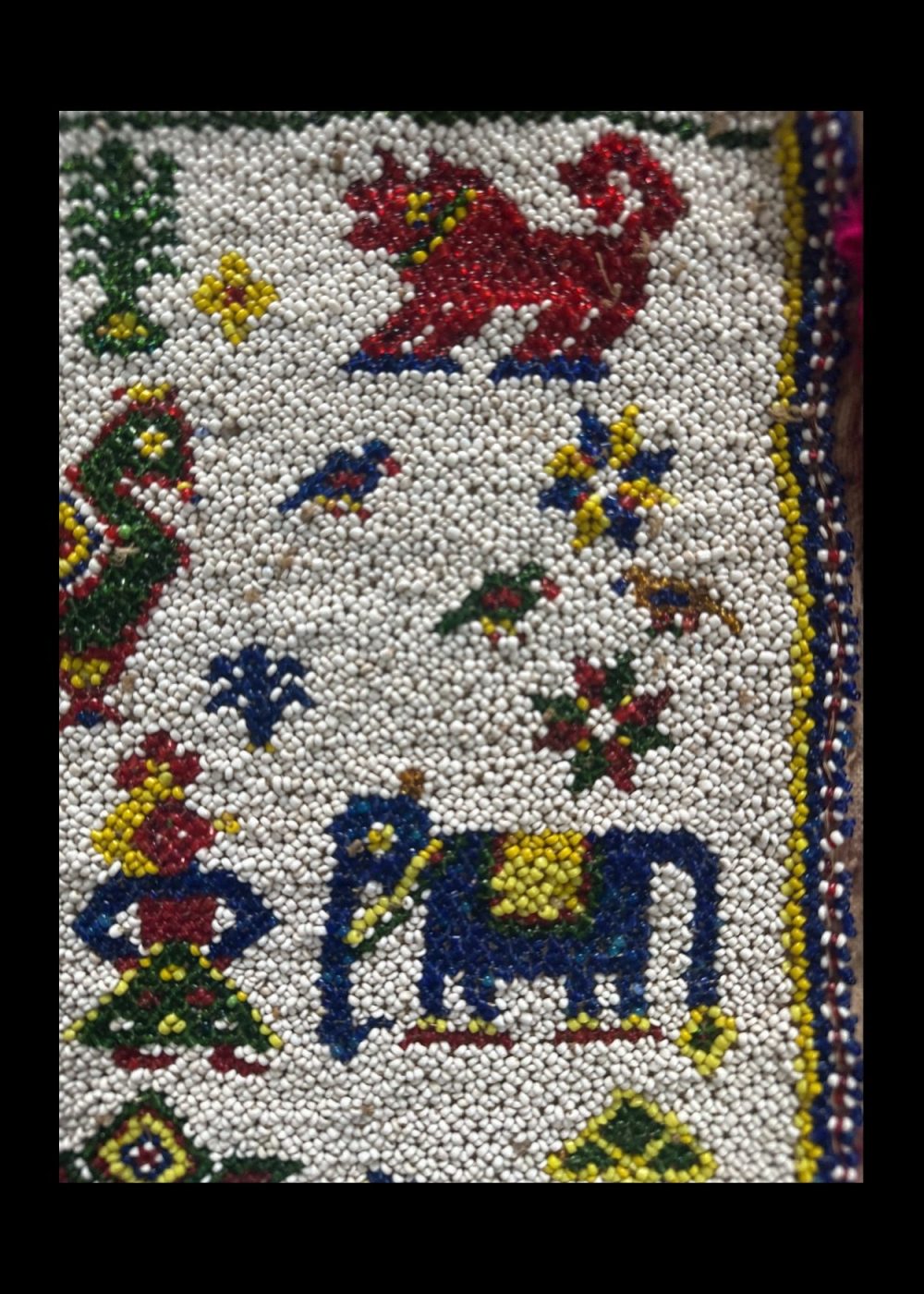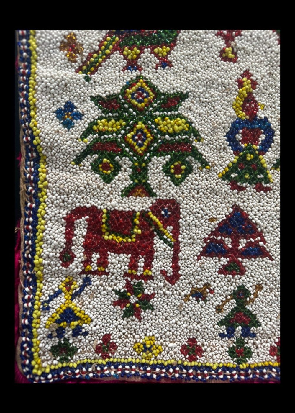This is a vibrant handcrafted beaded artwork featured on a fabric bag. The beadwork showcases colorful depictions of animals, birds, trees, flowers, and a central human figure, all created using small, intricate beads in red, blue, yellow, green, and white. The artwork is framed with a multicolored beaded border and trimmed with pink fabric, adding to its decorative appeal. This piece reflects traditional folk artistry, symbolizing themes of nature, animals, and rural life in a celebratory and joyful style.