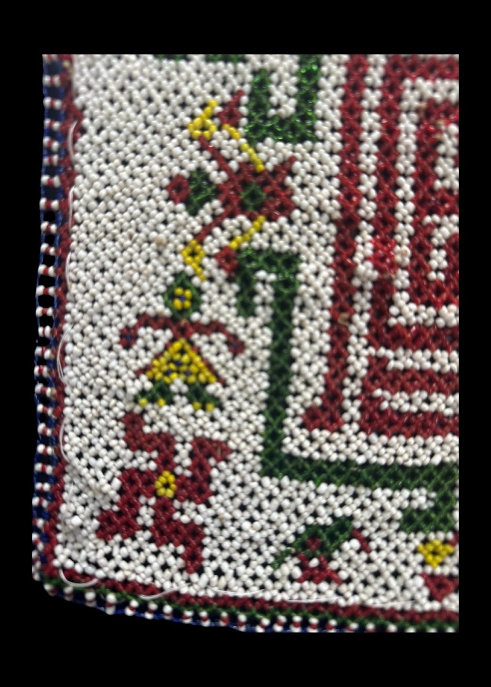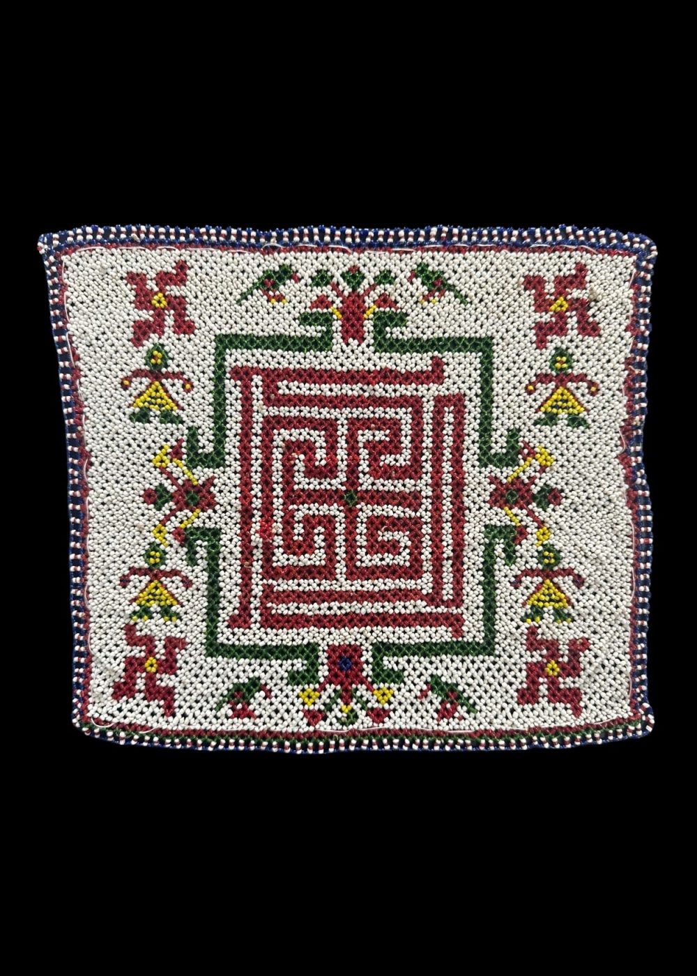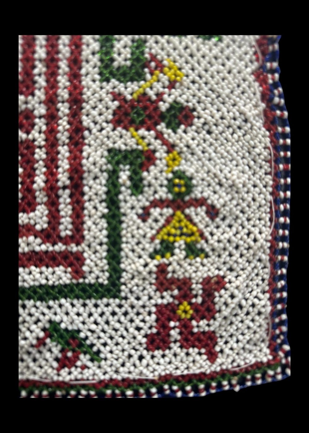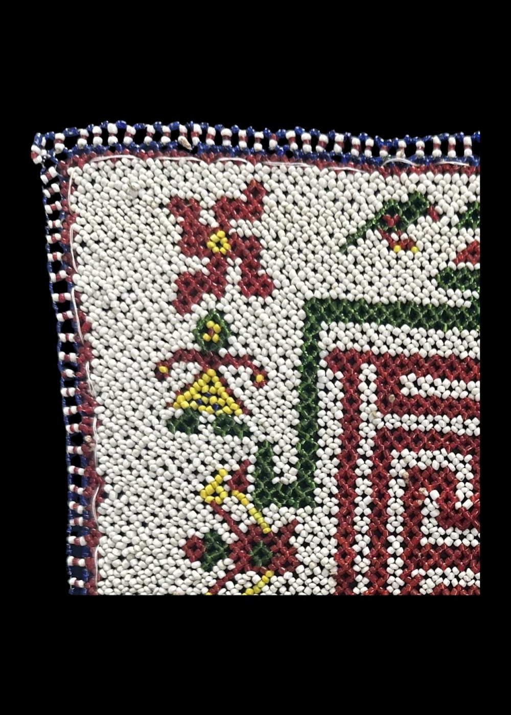 This is a traditional handcrafted beaded artwork featuring a detailed geometric and floral design. At the center is a bold red labyrinth-like pattern bordered with green lines. Surrounding the central motif are symmetrical arrangements of flowers, trees, and bird-like figures in red, yellow, green, and black beads. The beadwork is done on a white background with a decorative blue, red, and white border. This intricate piece reflects cultural symbolism, likely representing themes of nature, harmony, and protection.