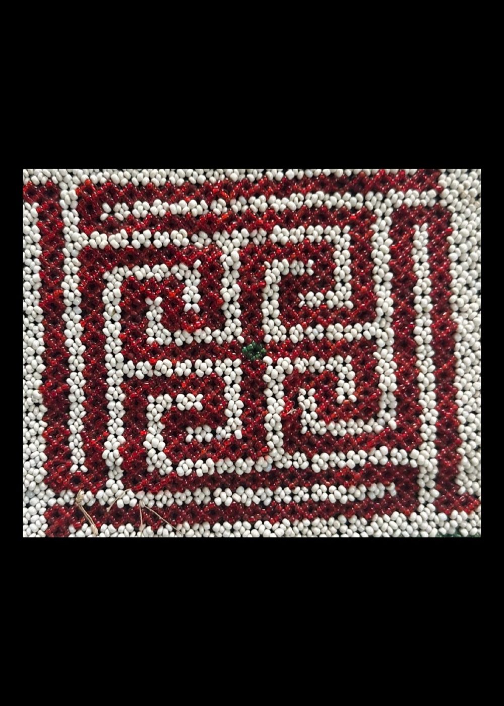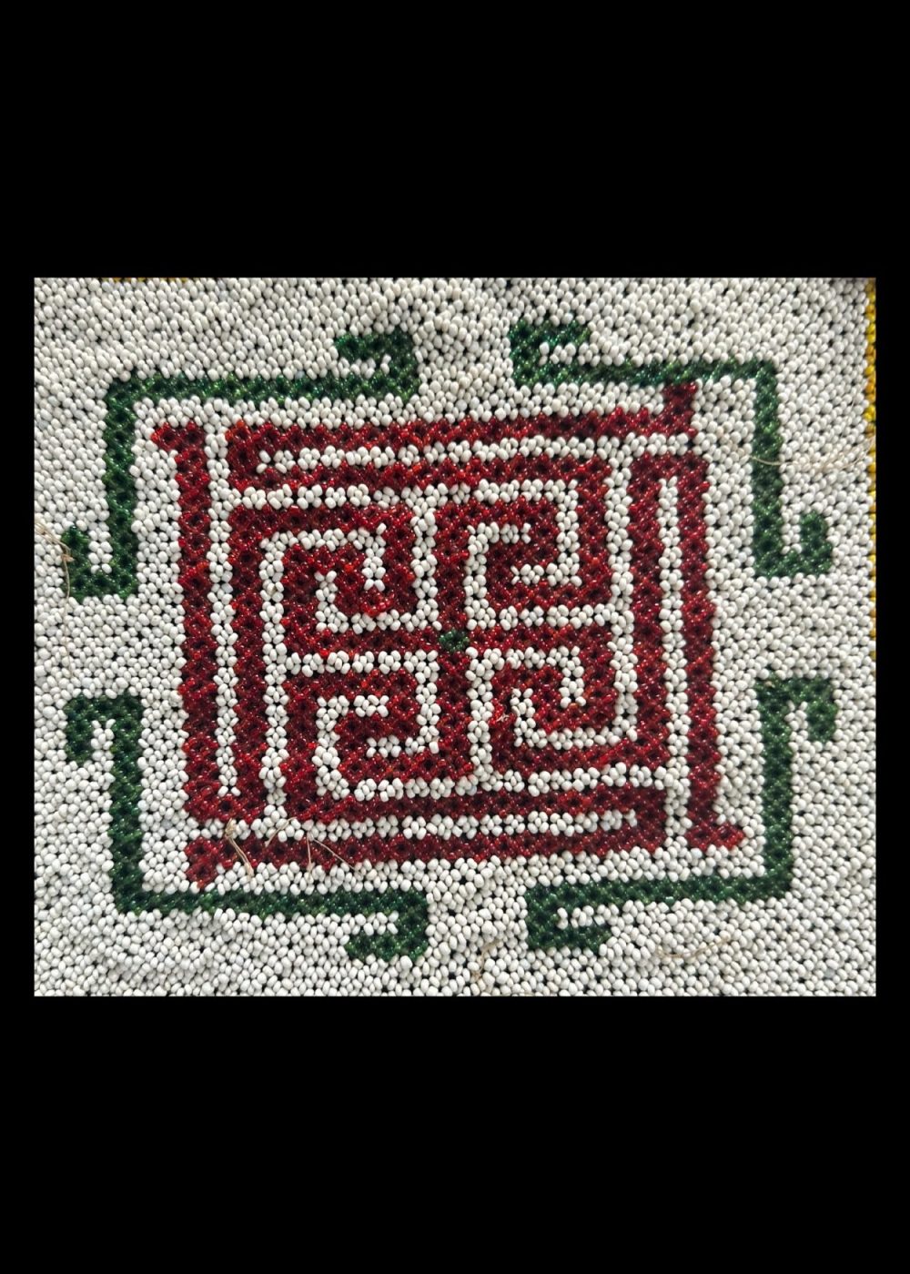 This is a traditional handcrafted beaded artwork featuring a symmetrical geometric labyrinth pattern. The central design is composed of red beads forming intricate, maze-like spirals, bordered by green angular lines on a white beaded background. The outer edges are accented with blue, white, and yellow beadwork, creating a defined frame. The piece reflects meticulous craftsmanship and symbolizes protection, continuity, and cultural heritage through its use of repetitive, balanced motifs.