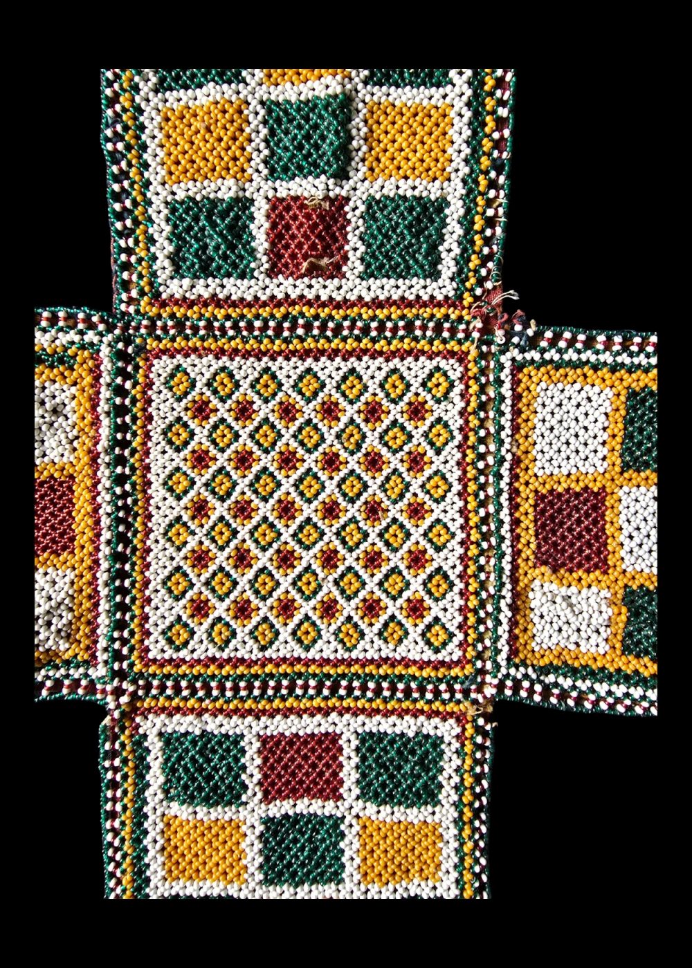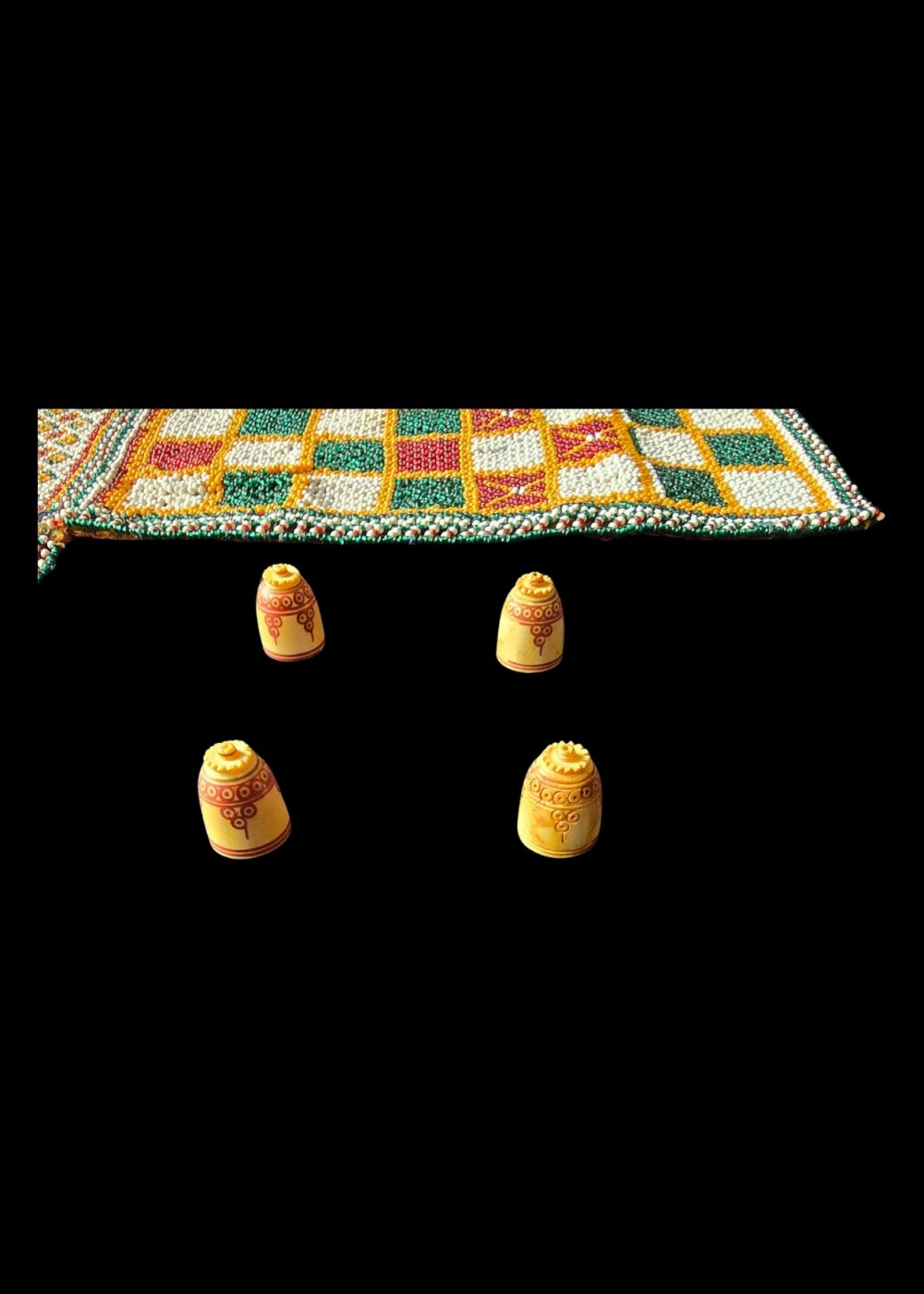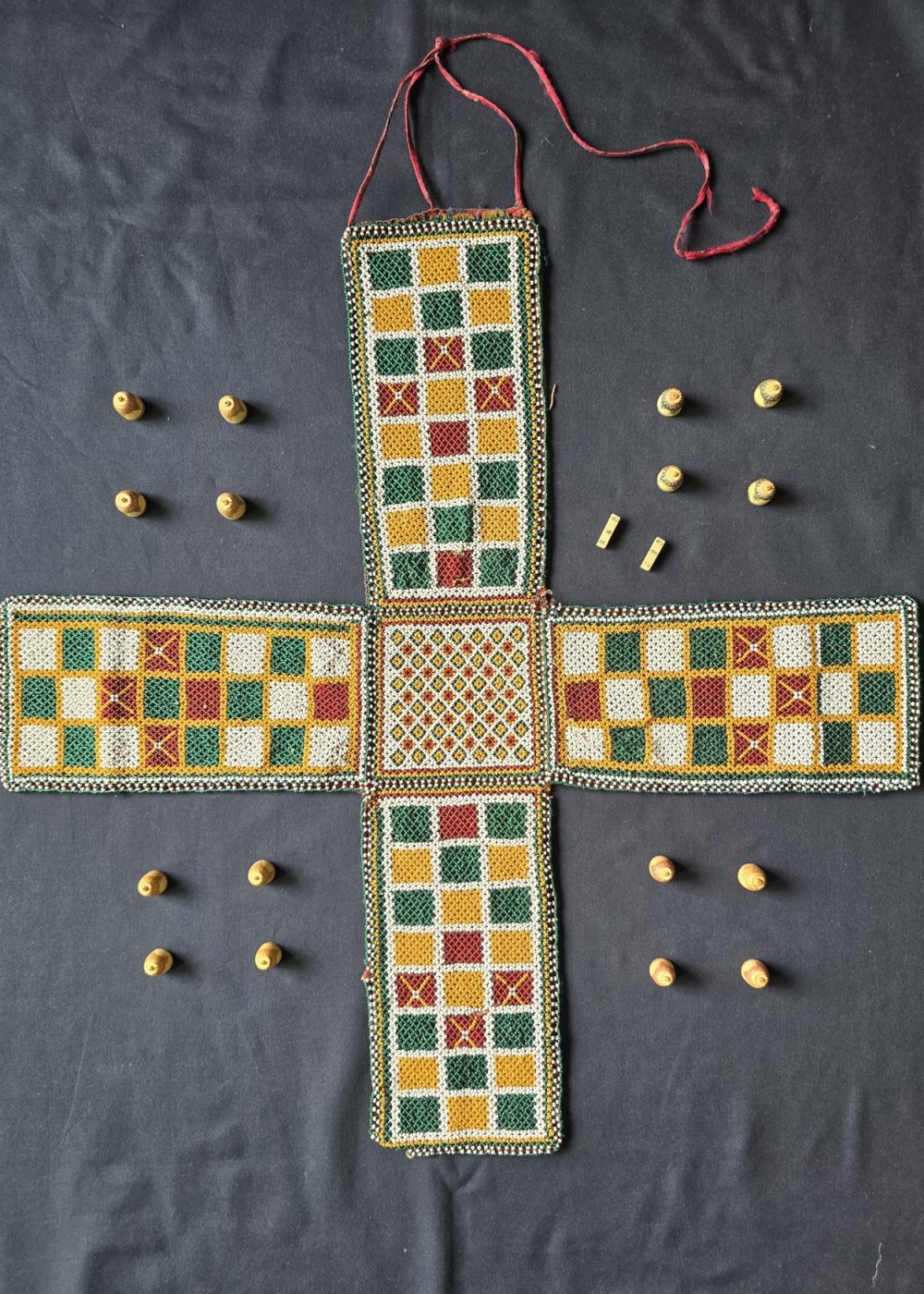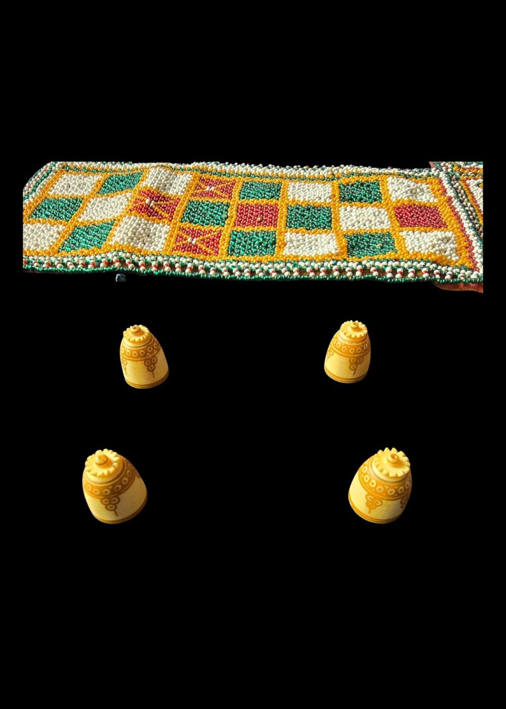 This beadwork Chaupat is indeed from Gujarat, a region known for its rich tradition of intricate craftsmanship and vibrant textiles. The use of geometric patterns and bright colors is typical of the beadwork styles found in Gujarat, particularly in the Kutch and Saurashtra regions.The Chaupat game, often depicted in this beadwork form, is a traditional Indian board game with a long history in Gujarat. The game is not only a social and recreational activity but also a symbol of the region’s artistic heritage. The vibrant beads and the accompanying wooden pieces you see in this image reflect the skillful handiwork of artisans, highlighting the cultural significance of Gujarat’s textile and craft traditions.