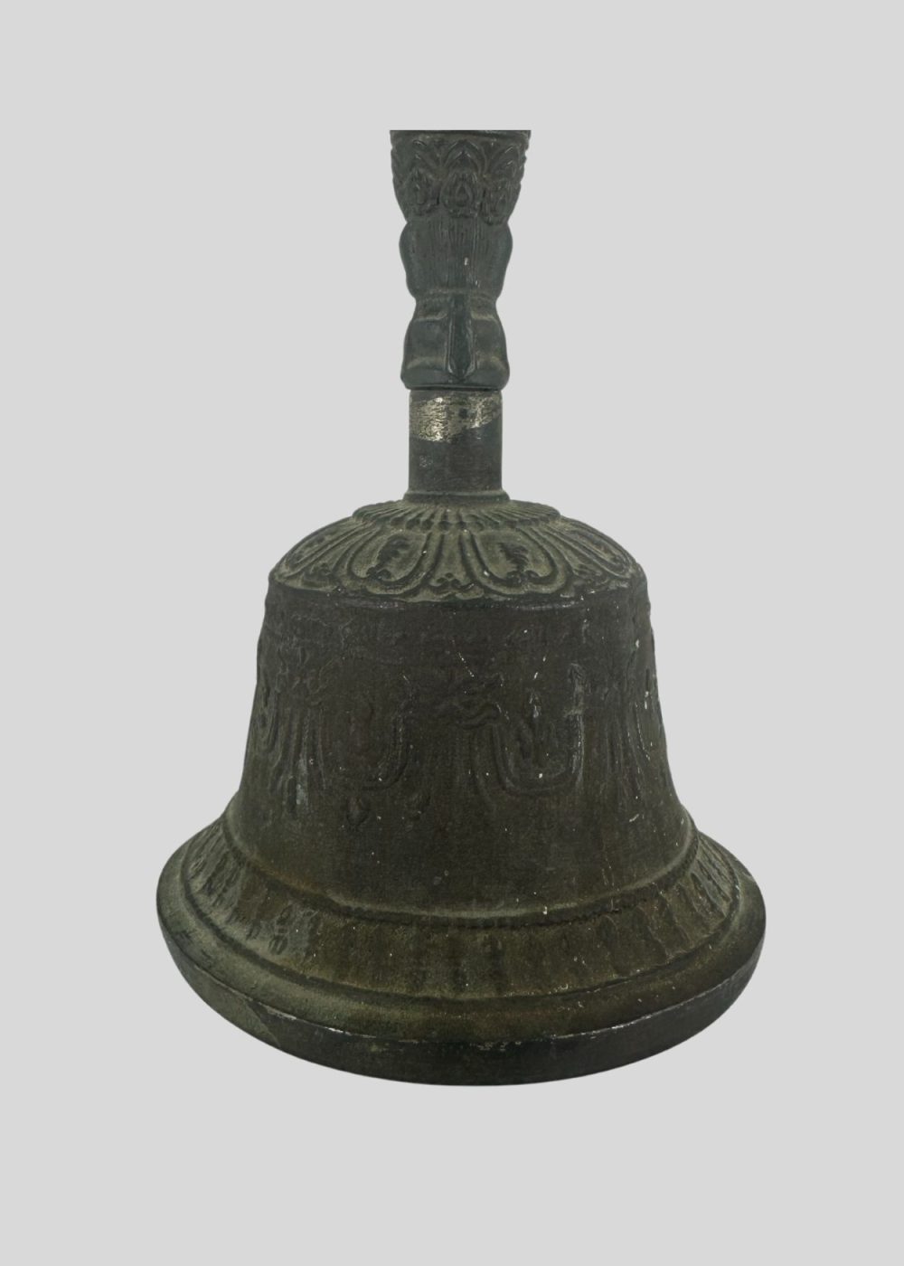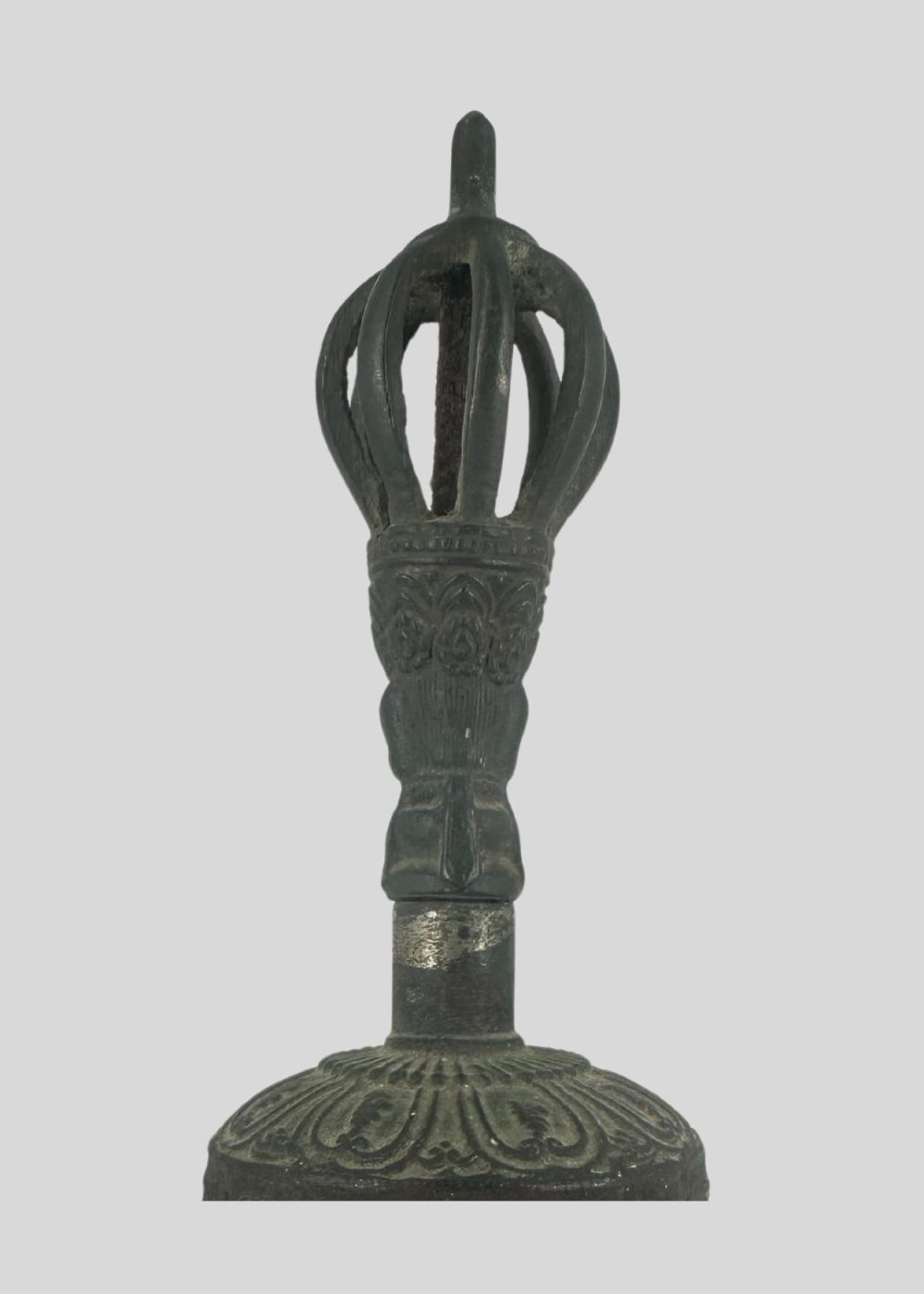 This bell metal bowl, cast in a copper-tin alloy renowned for its sonorous qualities, served as an offering vessel in Nepalese temples and domestic shrines. Its gently flared rim and deep hemispherical basin channel both light and sound, while the exterior is encircled with delicate repoussé work depicting lotus petals—symbols of purity—and scrolling vines. A band of incised dharma wheels and stylized flames parallels the rim, invoking both Buddhist and Hindu cosmologies. The dark, lustrous patina testifies to generations of ritual use, where offerings of water, grains, or incense were consecrated within its form.