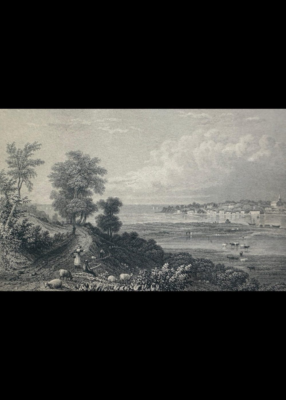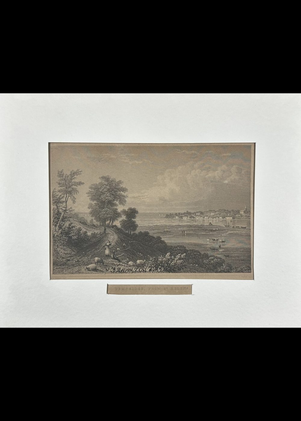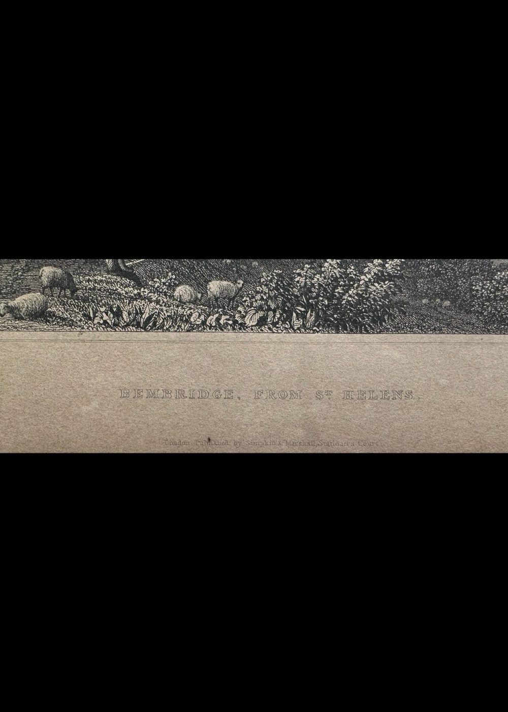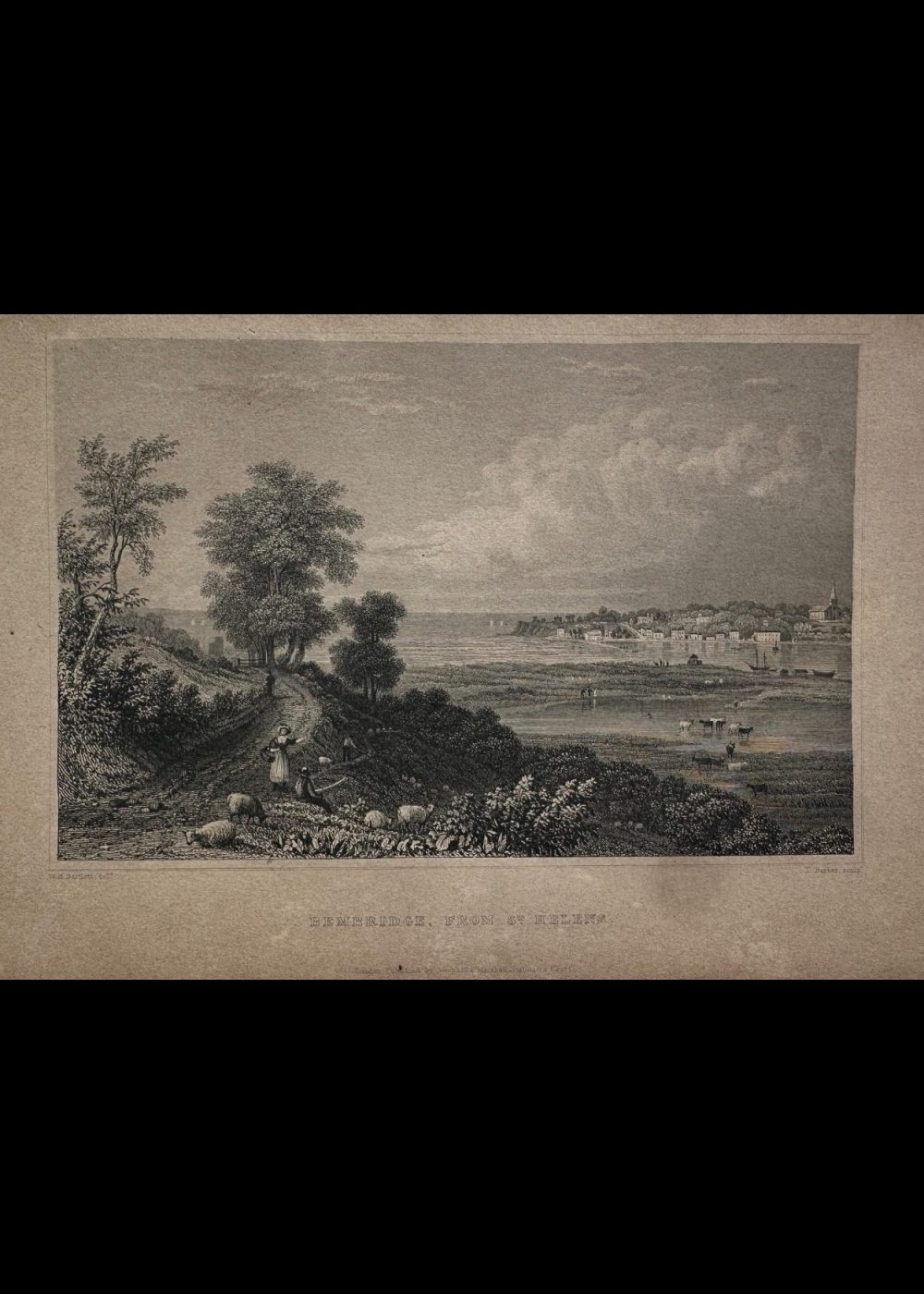 This detailed engraving, titled “Bembridge, from St. Helens,” offers a scenic rural and coastal view from the Isle of Wight, England. The composition gracefully blends pastoral charm with seaside activity, illustrating the island’s diverse character. In the foreground, a gently winding country path leads through lush vegetation and trees, where a shepherd and a woman tend to a small flock of sheep. A child is also visible, perhaps assisting or simply enjoying the peaceful surroundings. The rough, cobbled path and rustic setting emphasize the simplicity of rural life. Beyond the treeline, the view opens to the coast, revealing the village of Bembridge stretched along the shoreline. Small buildings with pitched roofs and a prominent church spire rise from the clustered settlement, giving a strong sense of place. Along the water’s edge, cattle wade and graze, while small boats and figures suggest quiet activity on the tidal flats. The sky is gently animated with clouds, lending atmosphere and depth to the landscape. The balance of human, animal, land, and sea in this engraving captures the tranquil rhythm of 19th-century life in coastal England—both industrious and idyllic.