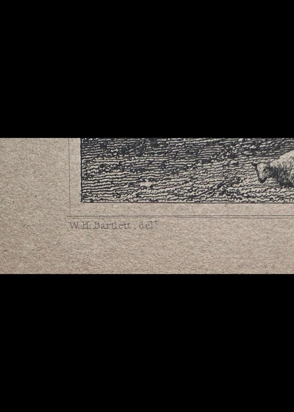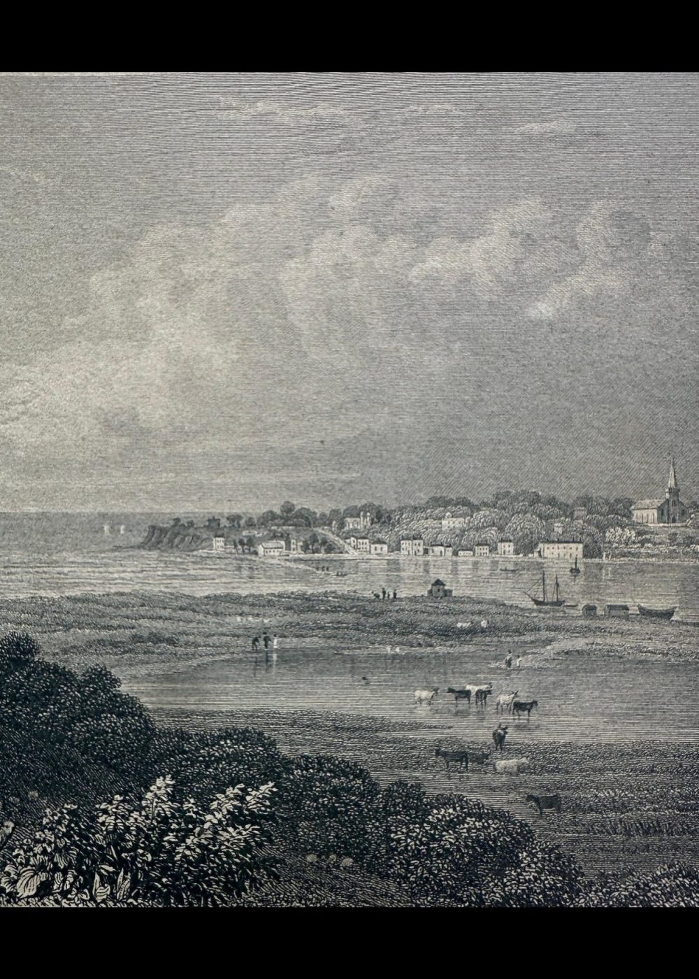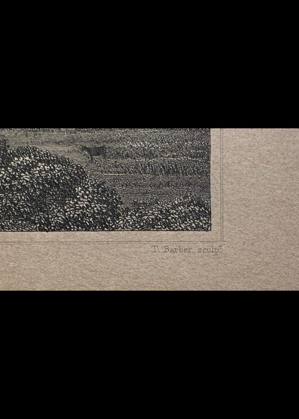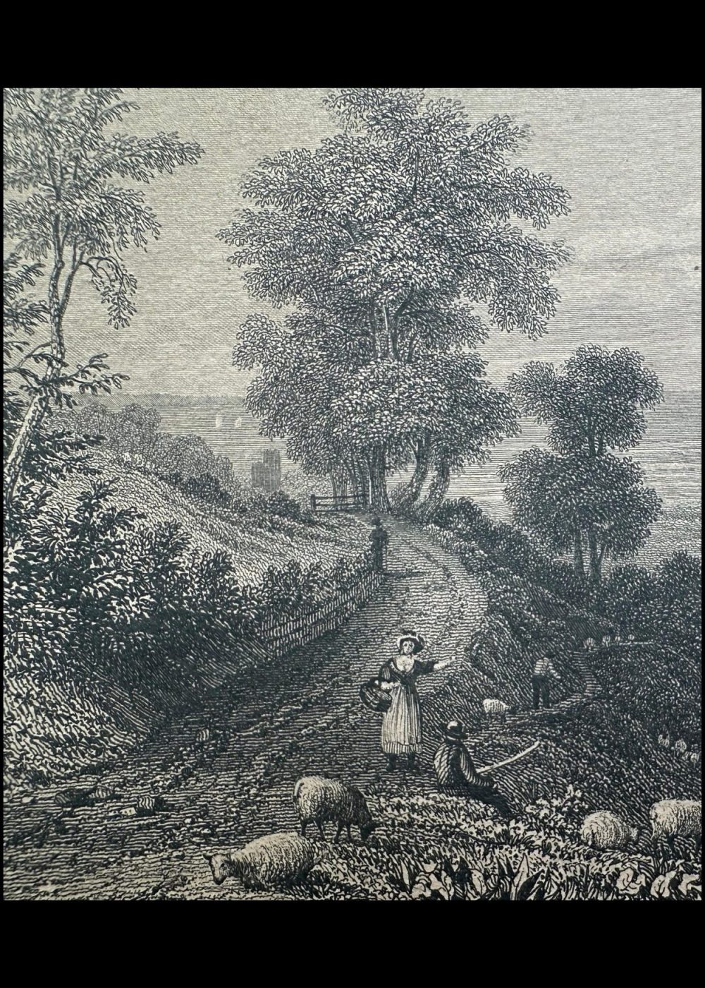 This detailed engraving, titled “Bembridge, from St. Helens,” offers a scenic rural and coastal view from the Isle of Wight, England. The composition gracefully blends pastoral charm with seaside activity, illustrating the island’s diverse character. In the foreground, a gently winding country path leads through lush vegetation and trees, where a shepherd and a woman tend to a small flock of sheep. A child is also visible, perhaps assisting or simply enjoying the peaceful surroundings. The rough, cobbled path and rustic setting emphasize the simplicity of rural life. Beyond the treeline, the view opens to the coast, revealing the village of Bembridge stretched along the shoreline. Small buildings with pitched roofs and a prominent church spire rise from the clustered settlement, giving a strong sense of place. Along the water’s edge, cattle wade and graze, while small boats and figures suggest quiet activity on the tidal flats. The sky is gently animated with clouds, lending atmosphere and depth to the landscape. The balance of human, animal, land, and sea in this engraving captures the tranquil rhythm of 19th-century life in coastal England—both industrious and idyllic.