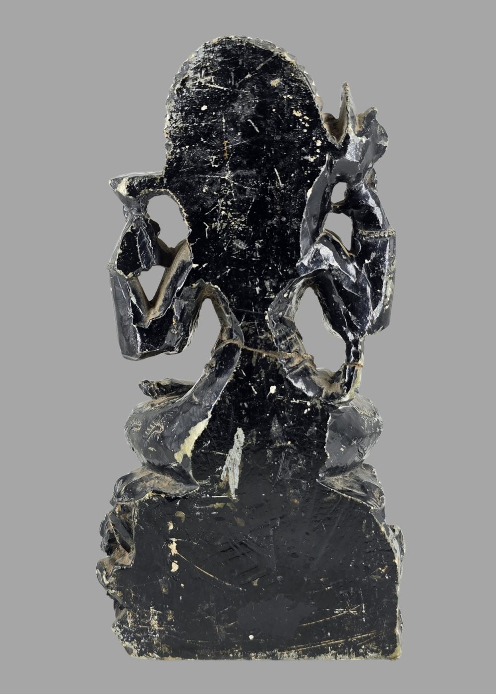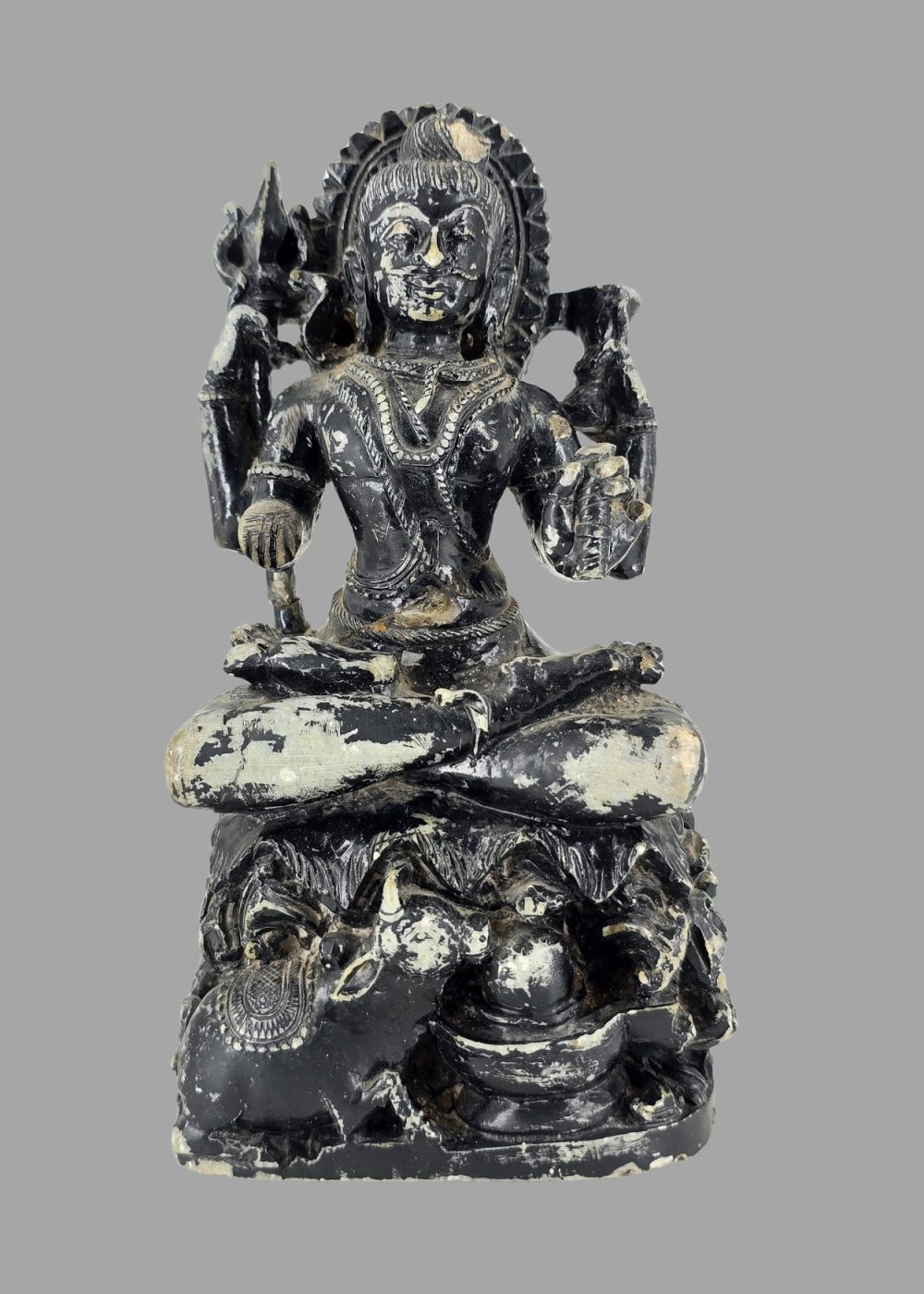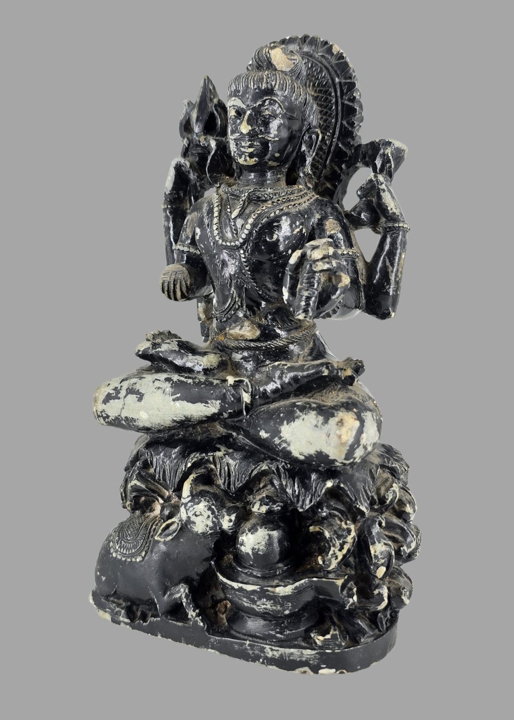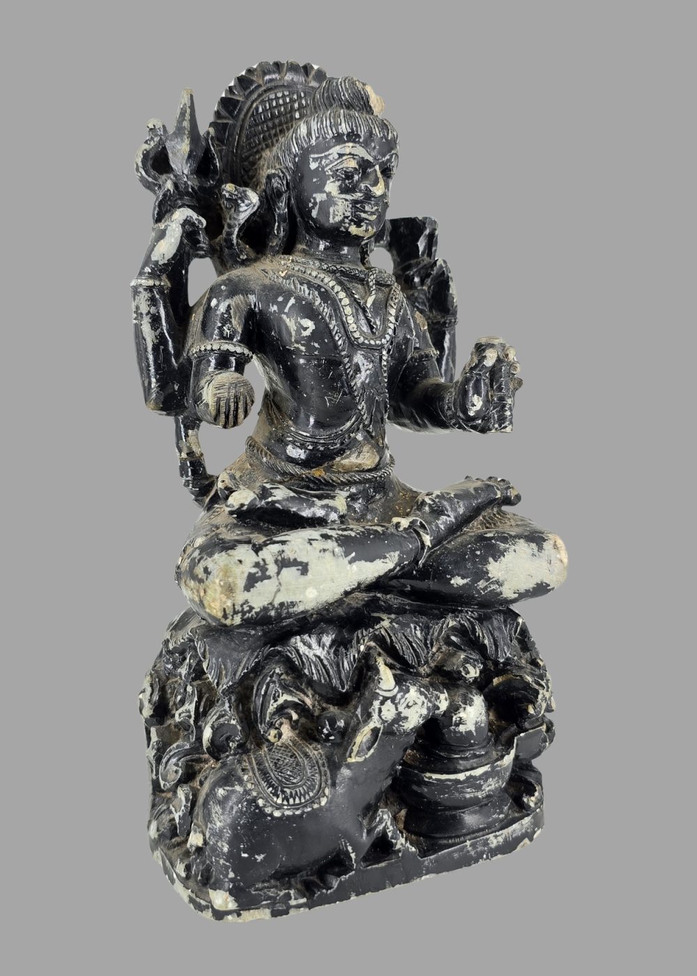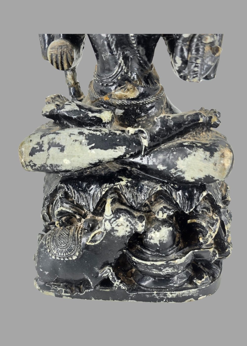 This is a black stone idol depicting Goddess Parvati, seated in a meditative pose with multiple arms, holding her symbolic trident and other attributes. The detailed carving includes a decorative base with Nandi (bull) and kalash elements, embodying artistic Indian iconography and devotional importance.