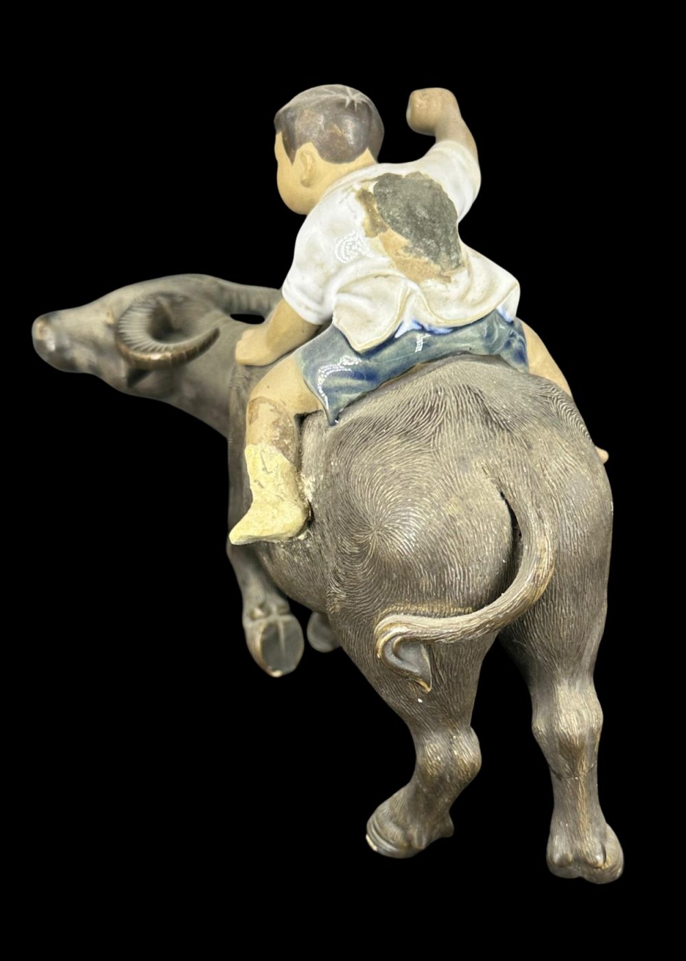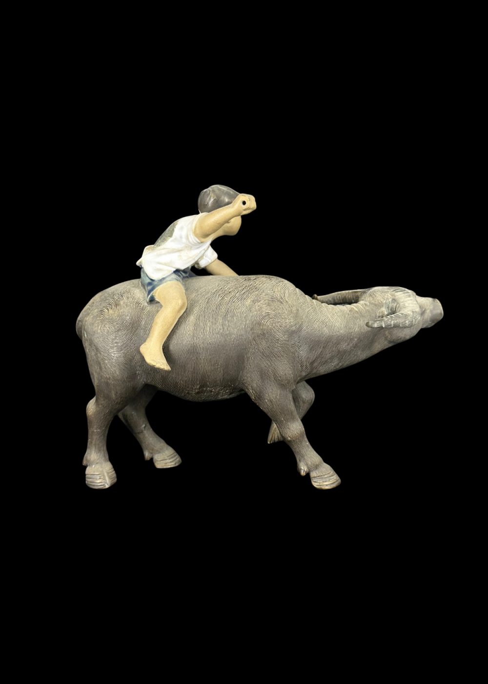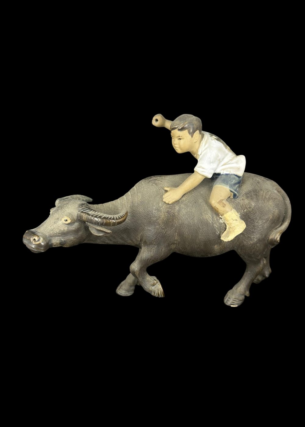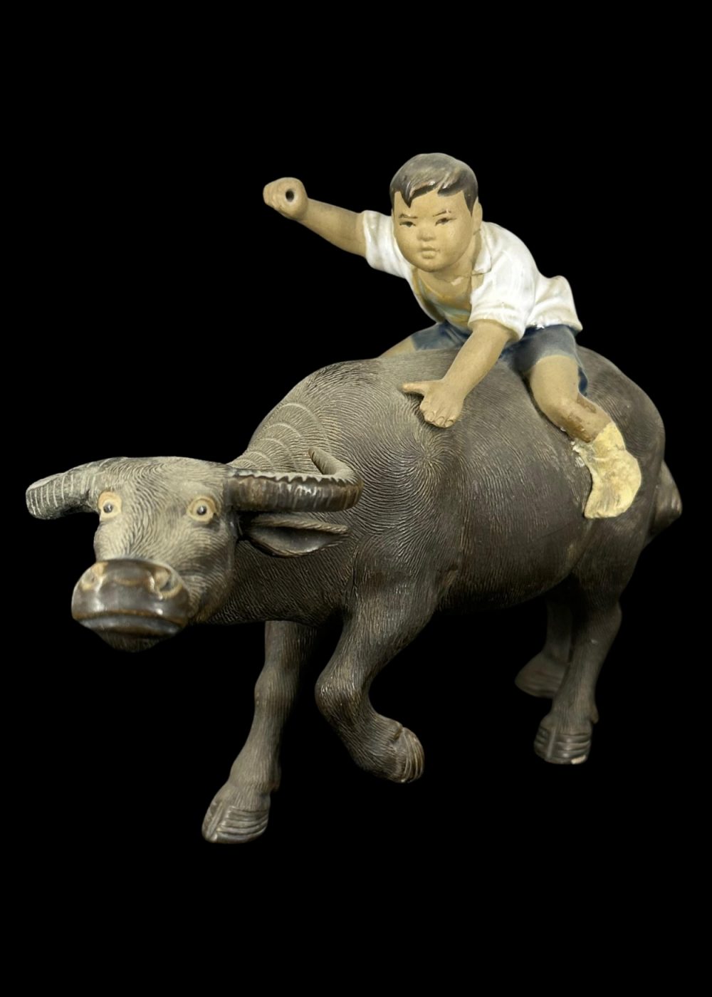 An authentic clay figurine from the 18th–19th century, crafted in Krishna Nagar, West Bengal — a region celebrated for its lifelike terracotta art. This piece depicts a spirited boy riding a buffalo, showcasing remarkable attention to detail and expressive charm. A rare collectible that beautifully reflects rural life and traditional Bengali craftsmanship. Ideal for collectors of folk art and antique décor.