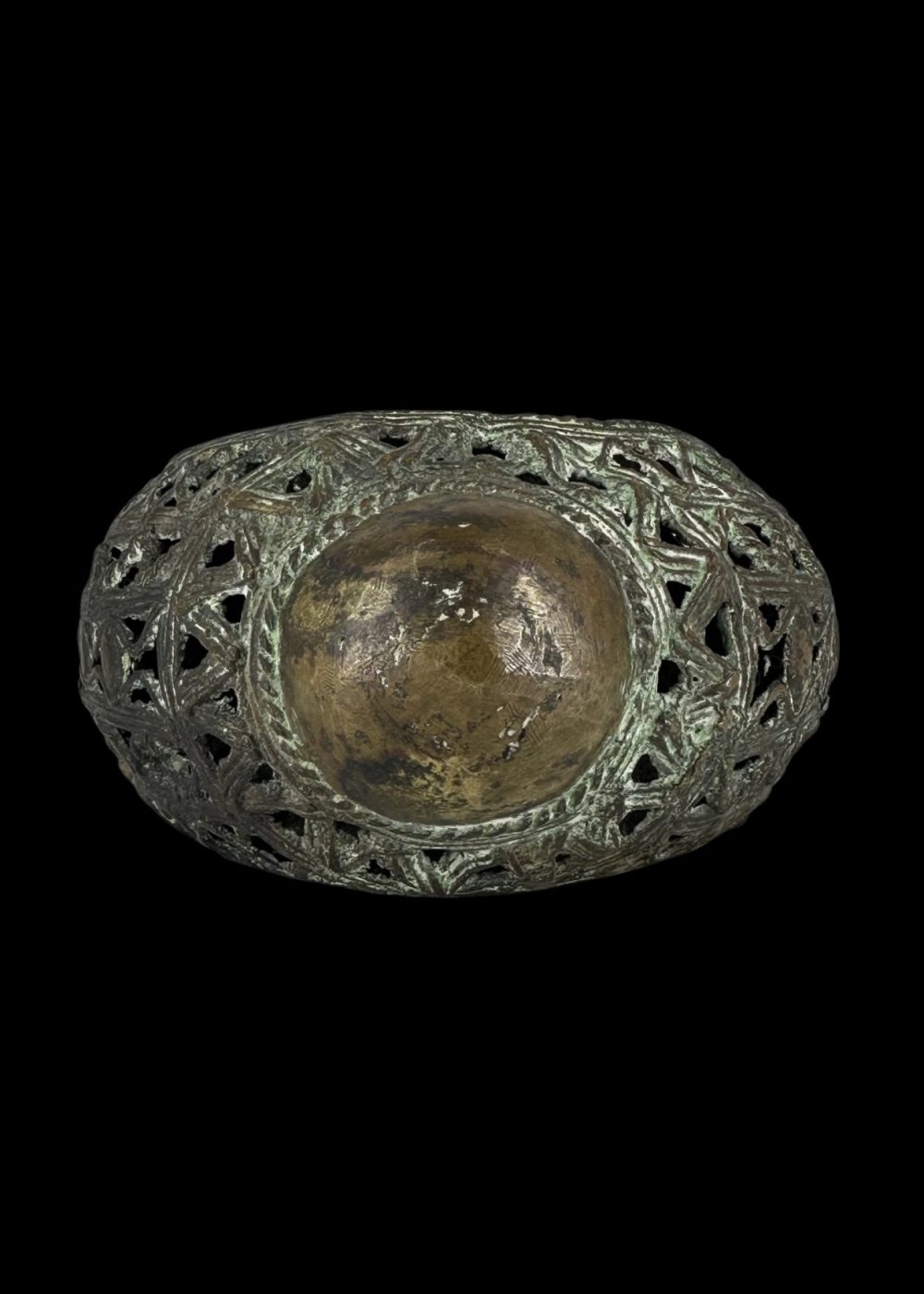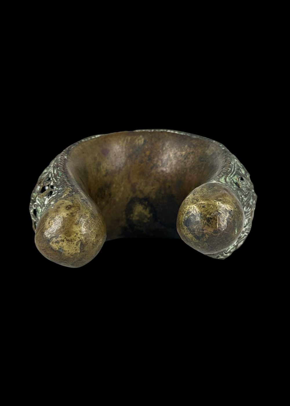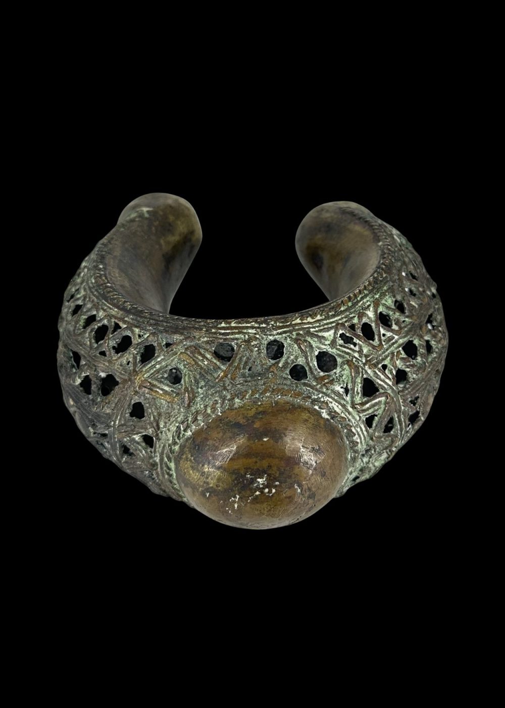 This wide bronze bracelet features a central domed medallion flanked by symmetrical geometric piercings and linear tooling. The band’s surface displays patterned cut-outs and incised borders, accentuating the interplay of form and shadow. The rich patina suggests prolonged use and age, enhancing its sculptural presence. Likely worn as a traditional adornment, the piece reflects regional aesthetics and the artisanal attention characteristic of Indian metalwork.